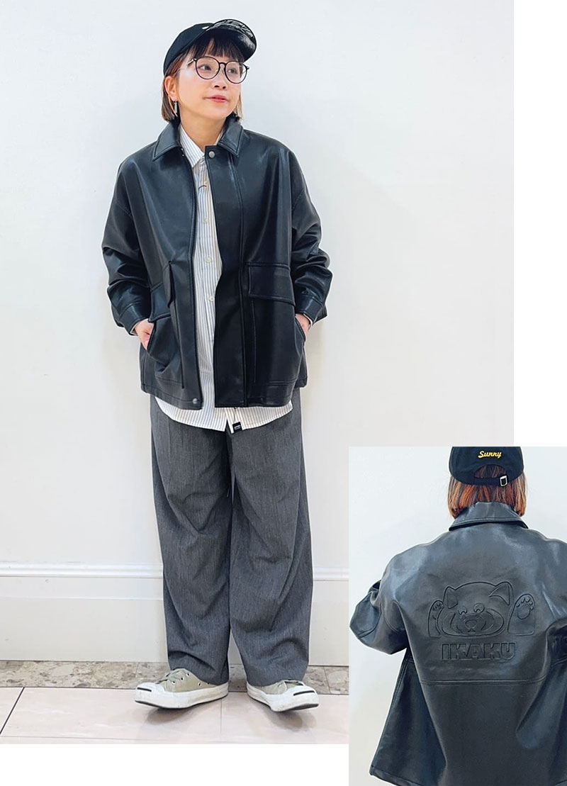 エコレザーの質感が良くシルエットもキレイに出ます。大きめシルエットですが大きめに合わせて可愛いです!どちらも着回し力◎でおすすめ!