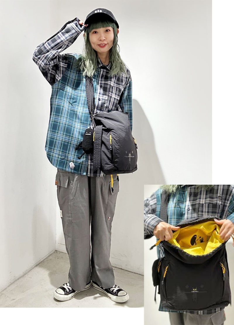 少し厚手でチェック柄の配色も可愛いシャツ!ゆったりシルエットには軽くてゆとり幅もあってストレスフリーな履き心地カーゴパンツを。 バッグは内側のポケットもプリント入ってて可愛い◎