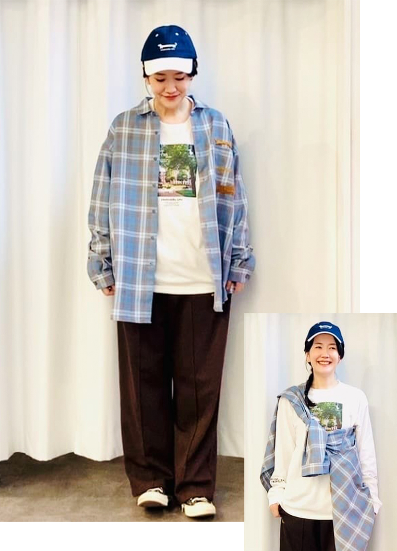 気温差の激しい今の季節はシャツを腰に巻いたり、いろいろな着こなしが楽しめるのも魅力です。