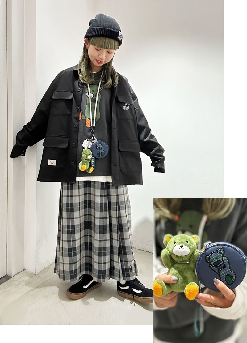 ミリタリーシャツはゆったりシルエットでメンズライクなコーデに!少し厚手なのでこれからの時期に大活躍するアイテム☺︎ カスタムポーチとチャームをストラップにつけてコントロールベア満載コーデ♪