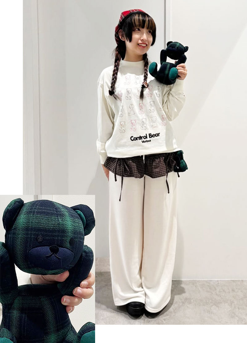 秋らしい落ち着いたチェックが可愛いコントロールベアのぬいぐるみに合わせて、ホワイト×チェックの秋コーデが完成。