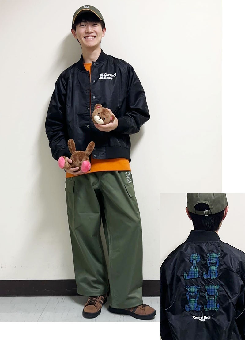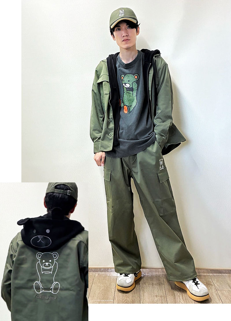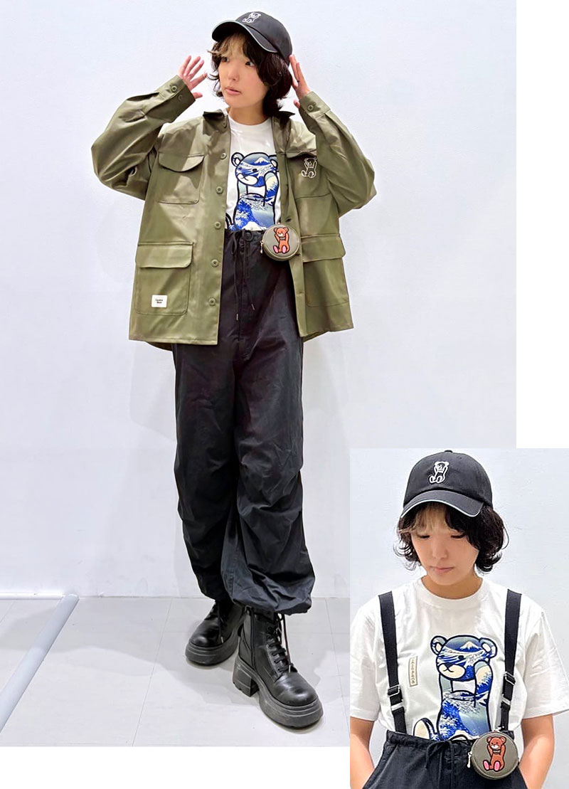 ミリタリーになりすぎないキレイめの生地で女性でも着用しやすいです♪ 和柄のポップなコントロールベアでちょっと外したスタイリングに。
