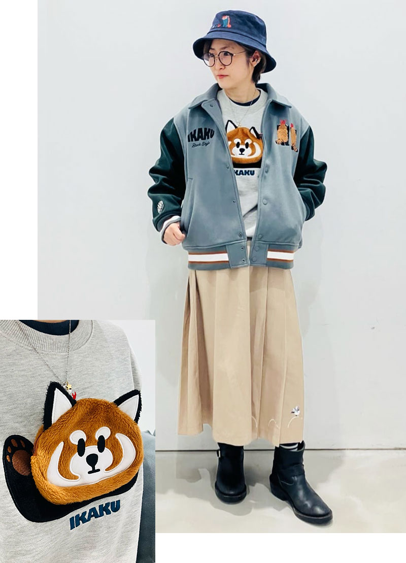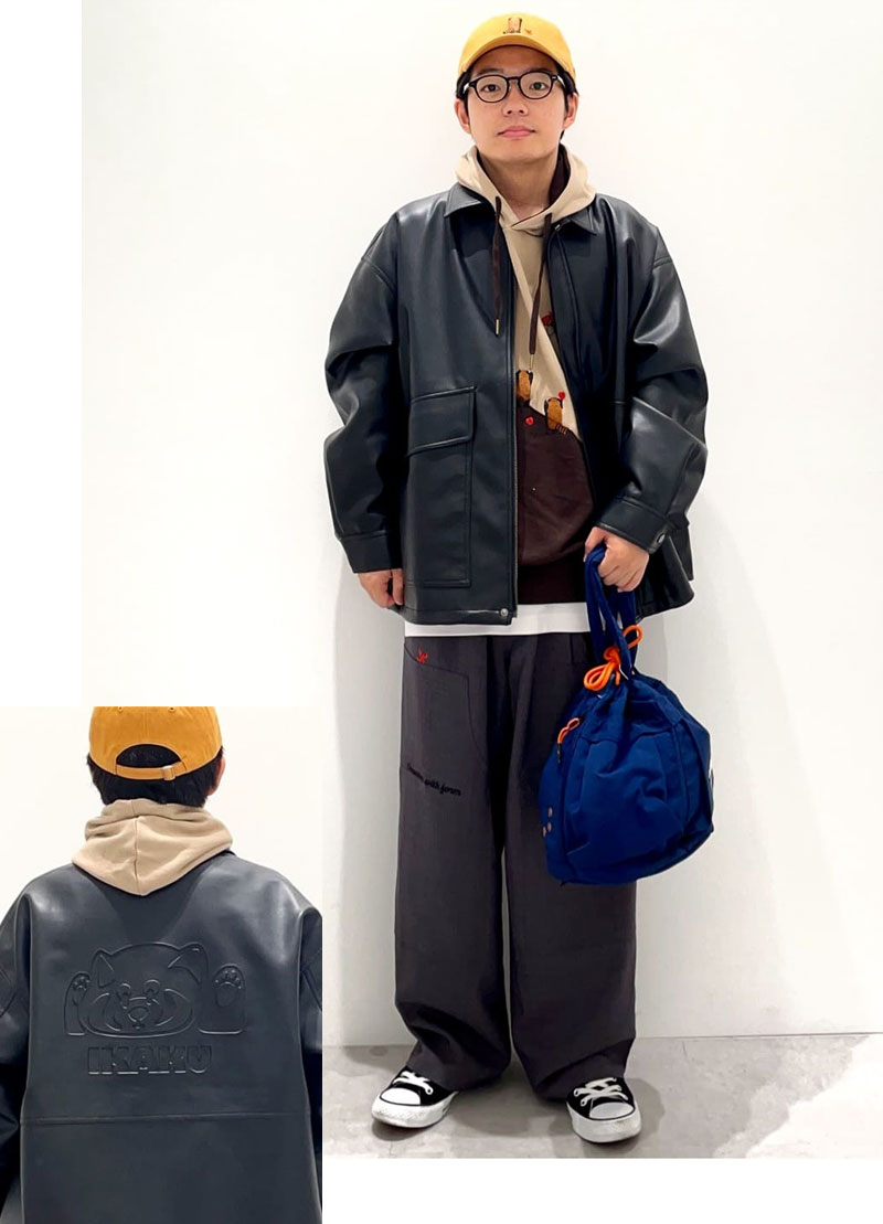 ゆったりとしたシルエットのレザージャケットはそのまま着用でも、ドローコードを絞ってシルエットを調整して着用するのも◎ バックのグラフィックは、凹凸感のあるエンボス加工で表現していて、カッコよさと可愛さが両立しているステキなアウター。男女問わずおすすめしたいコーディネートです♪