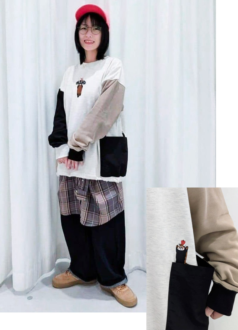 ゆったりシルエットなスウェットは、異なる袖のカラーが可愛い!大きなポケットがついて、スマホに財布にすっぽり入ります!ドローコードをしっかりめにしめて裾をまぁるい形にしました。