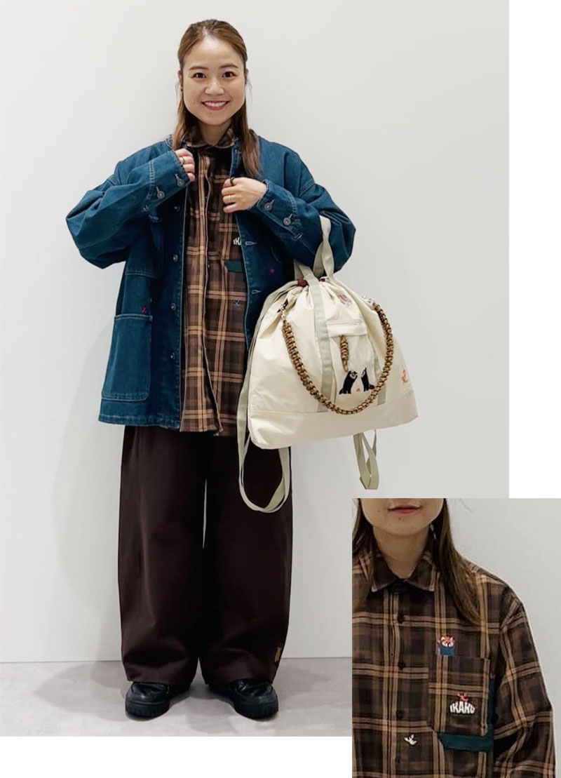 シャツはトレンドのチェック柄!ゆったりめなのでSでも手が隠れるくらい袖が長めです!ポケットが二重になっているデザインがポイント!長めの着丈とフロントに4つ付いたポケットが特徴!襟元のフリンジがコーディネートにこなれ感をプラスしてくれます♪
