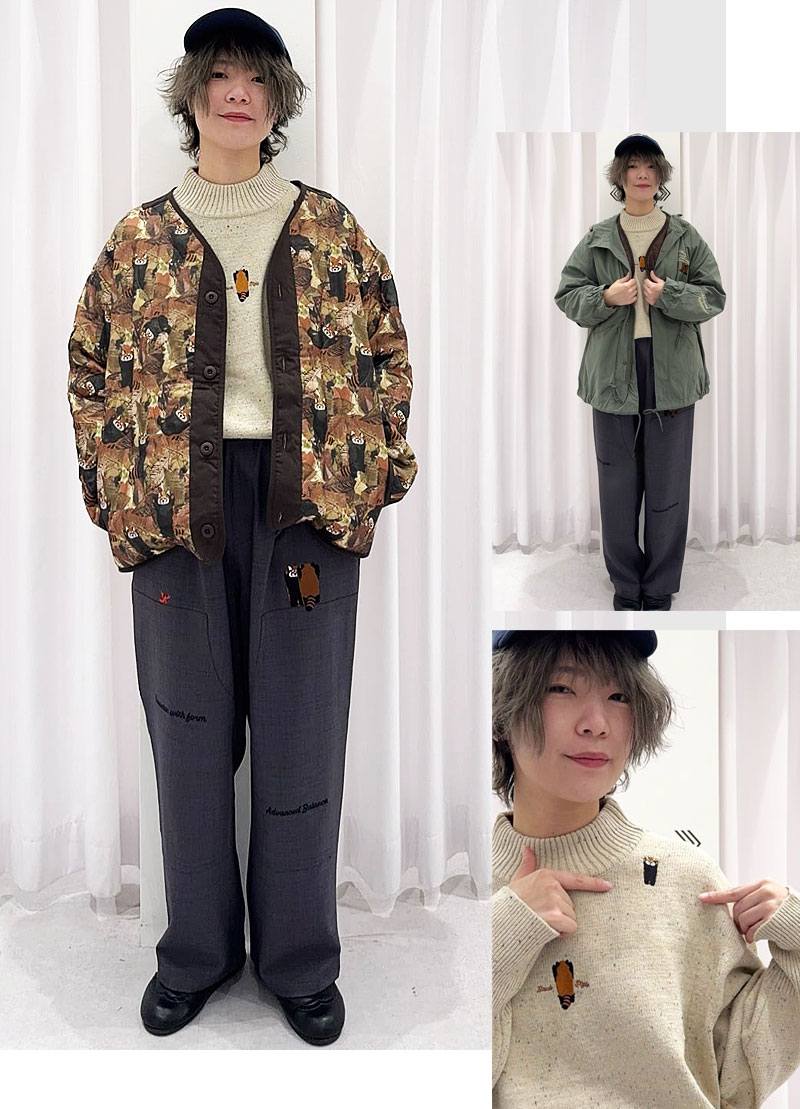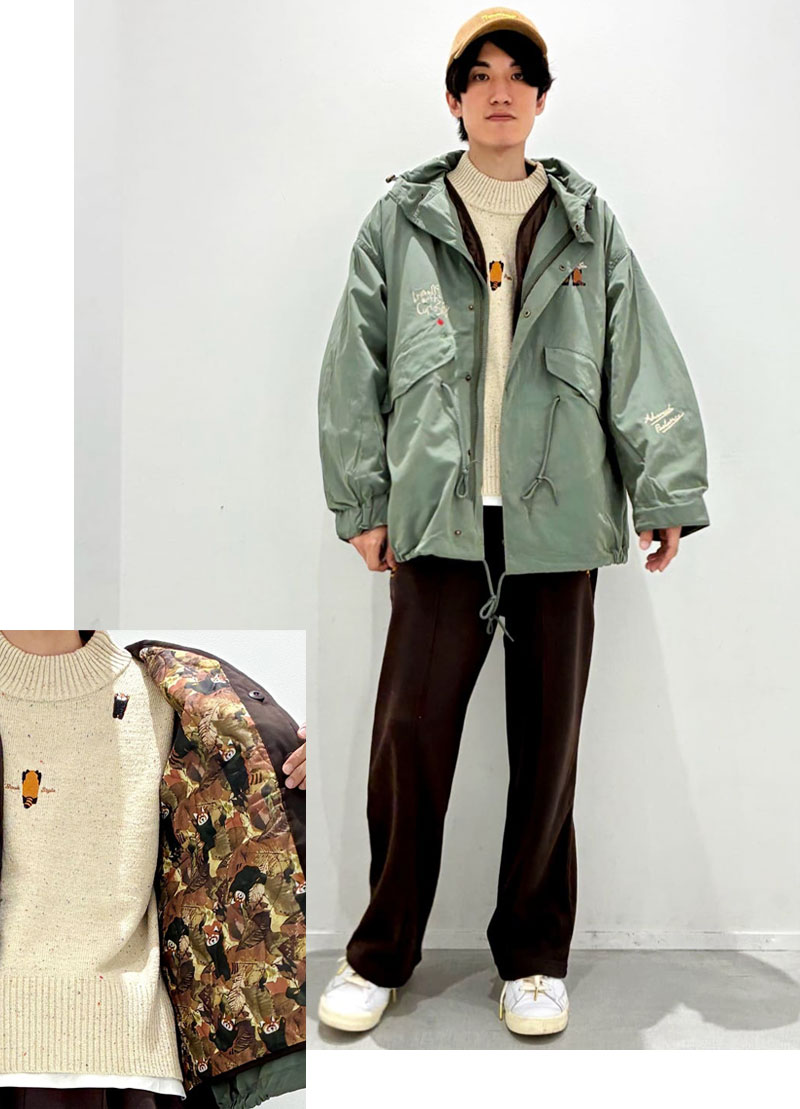モッズコートを主役に、ベージュニットとブラウンパンツでやわらかくまとめました。ミリタリー感はしっかりありつつ、落ち着いたトーンでナチュラルに着られるのがポイント。無骨になりすぎず、普段使いにも取り入れやすいスタイリングかなと思います!