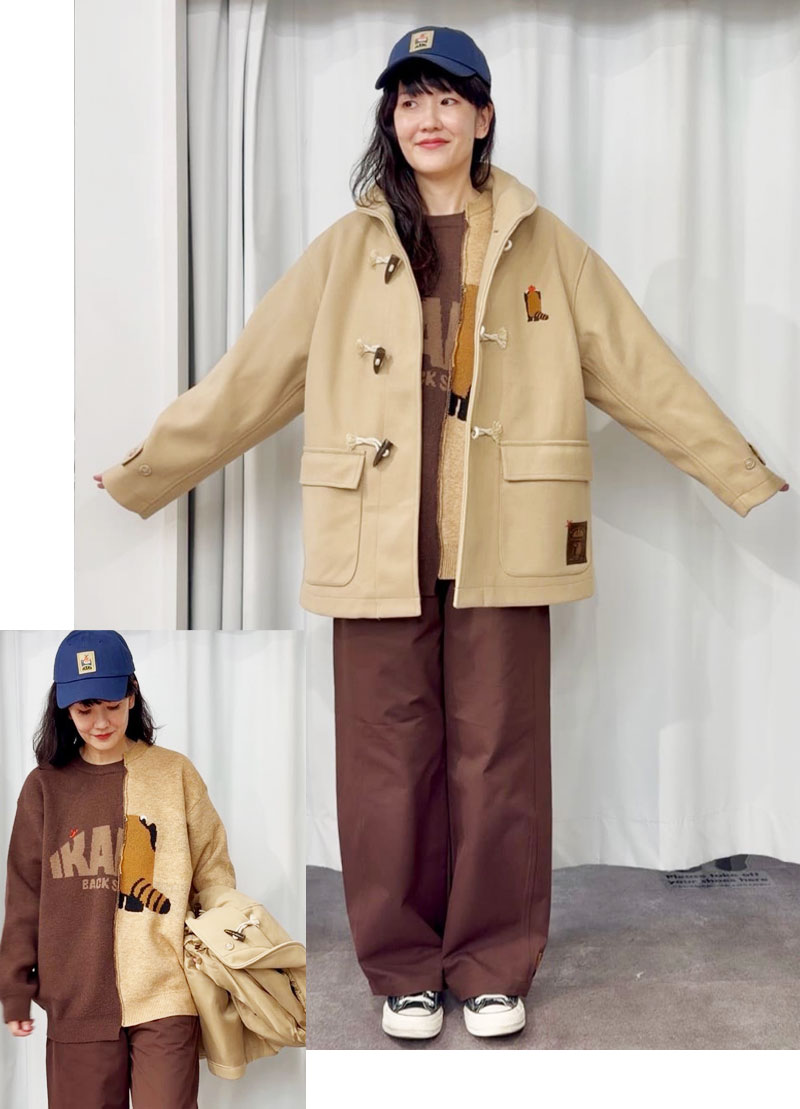 ブラウンとベージュのやさしい配色に、ネイビーのキャップを加えて全体を引き締めました。新作のダッフルコートは肉厚すぎず、羽織るだけでしっかり見える万能アウター!