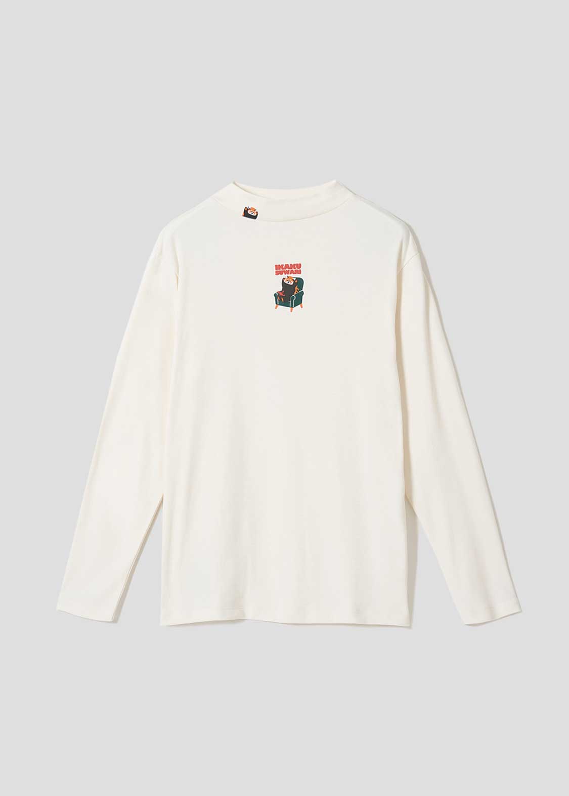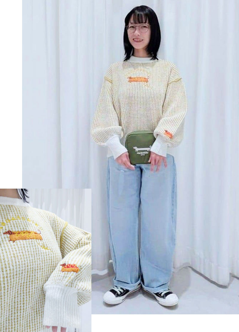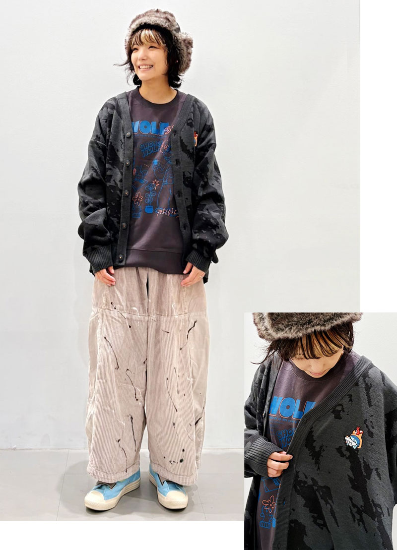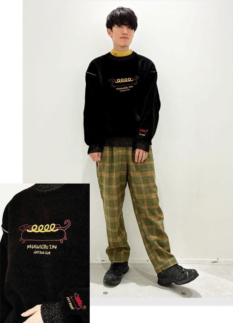 遊び心をくすぐる「ナガスギルイヌ」と、レトロなチェックパンツが絶妙なバランス。
