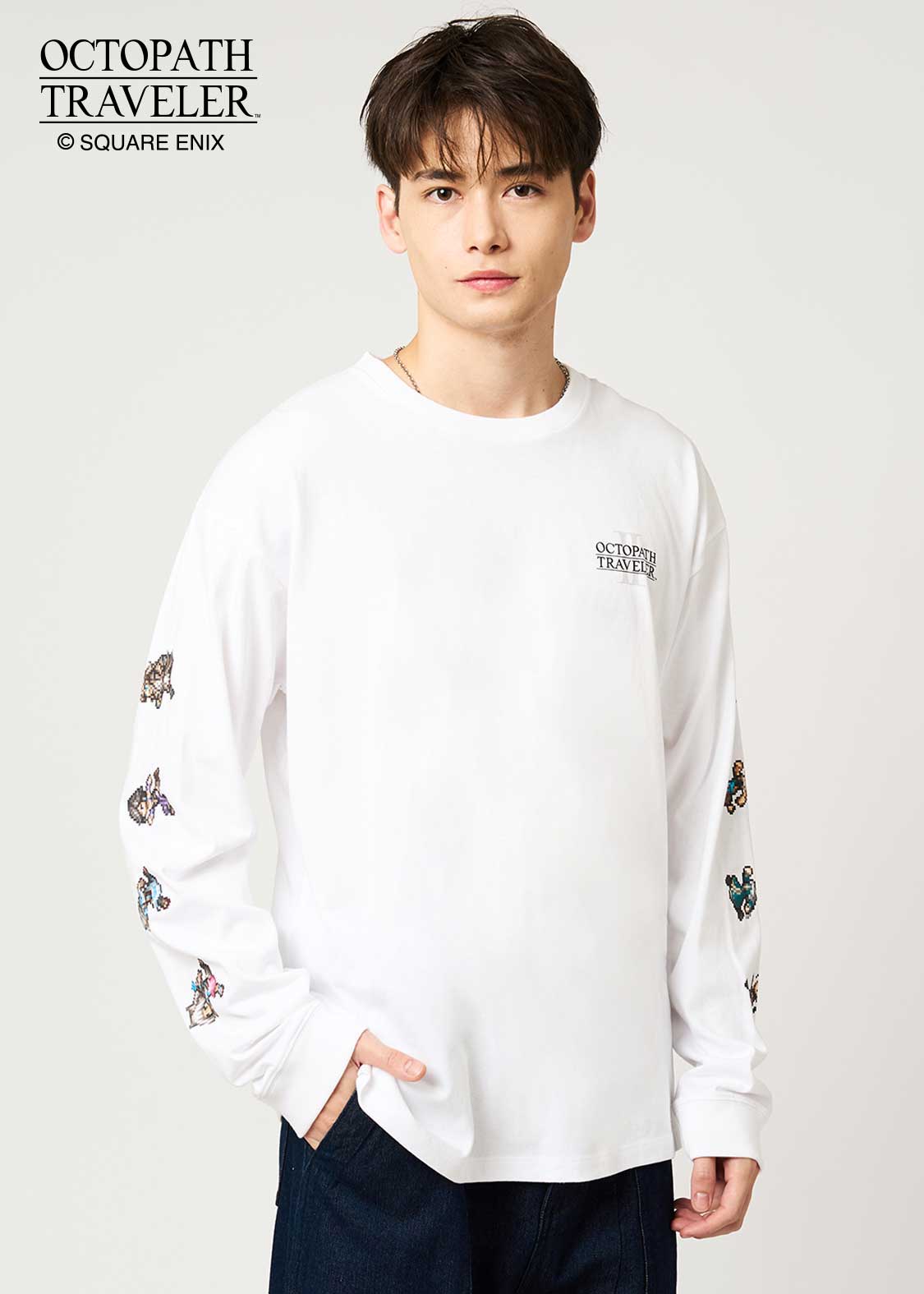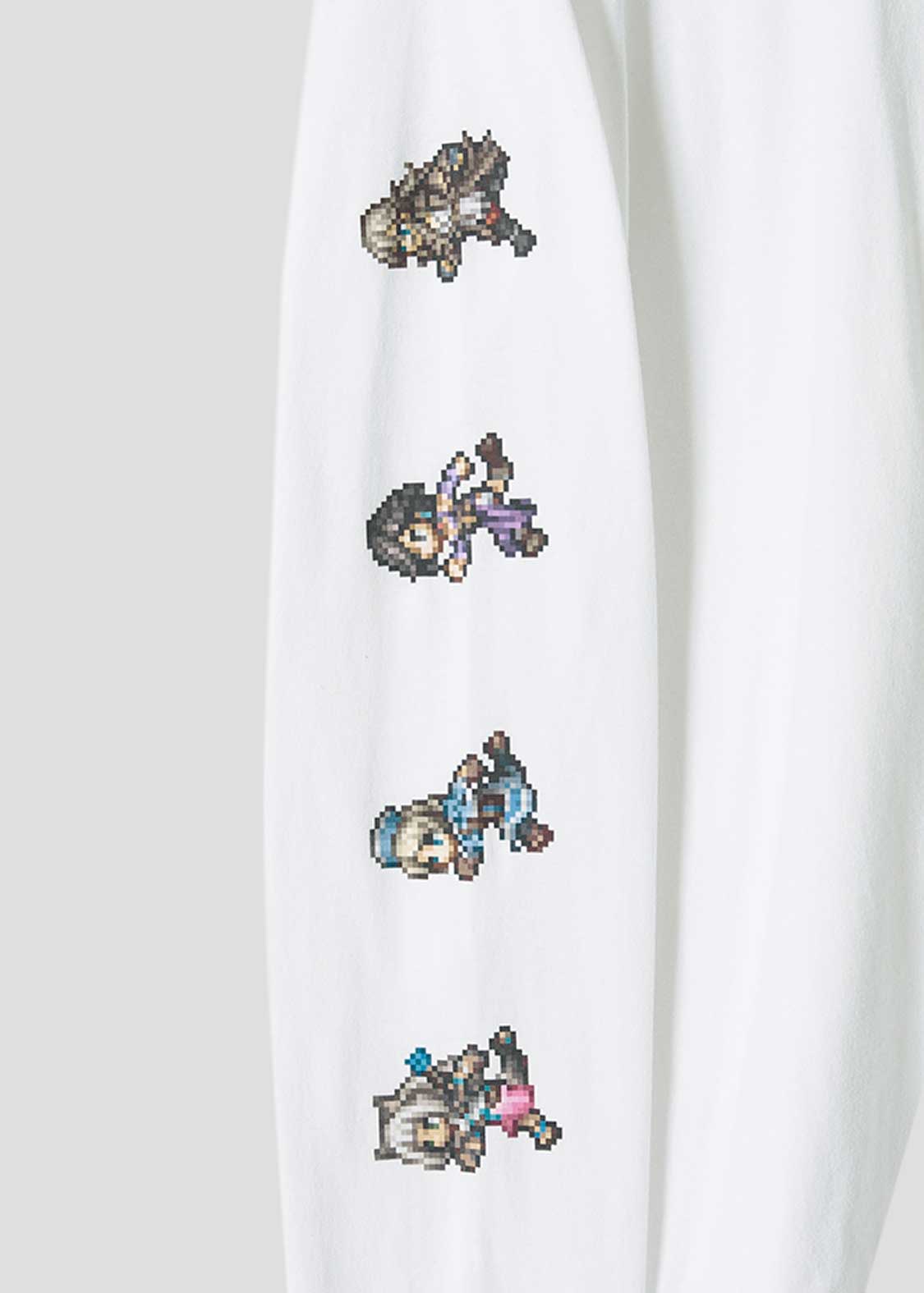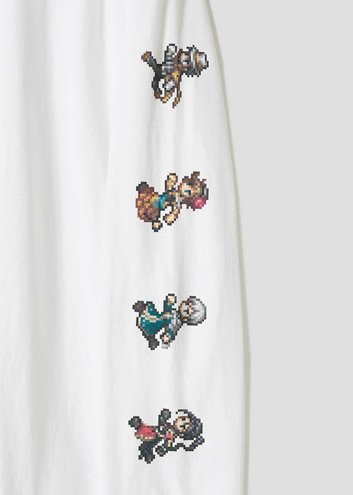 『オクトパストラベラーII』より。左右の袖に4人ずつ8人の旅人をプリントしました。バックには朝と夜で変わるそれぞれのフィールドコマンドのアイコンがプリントされています。