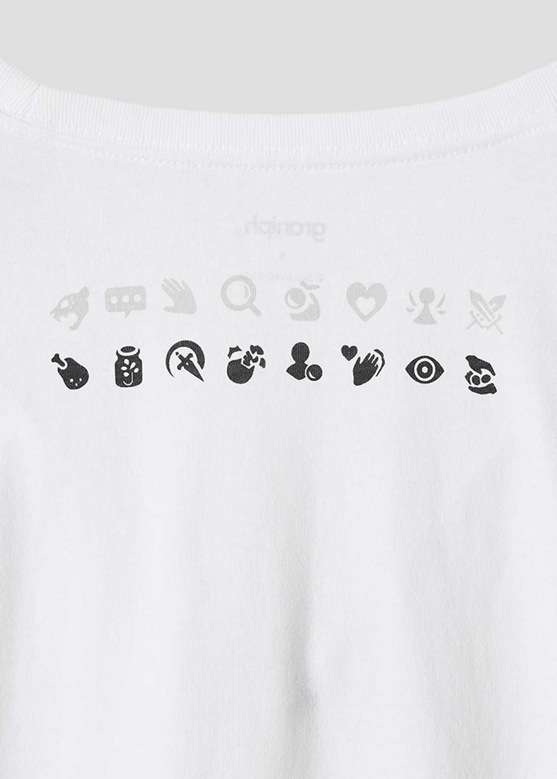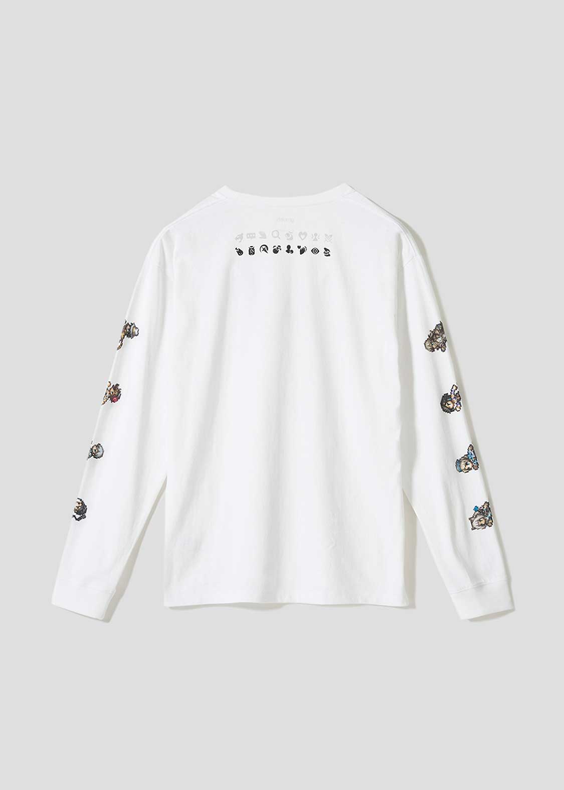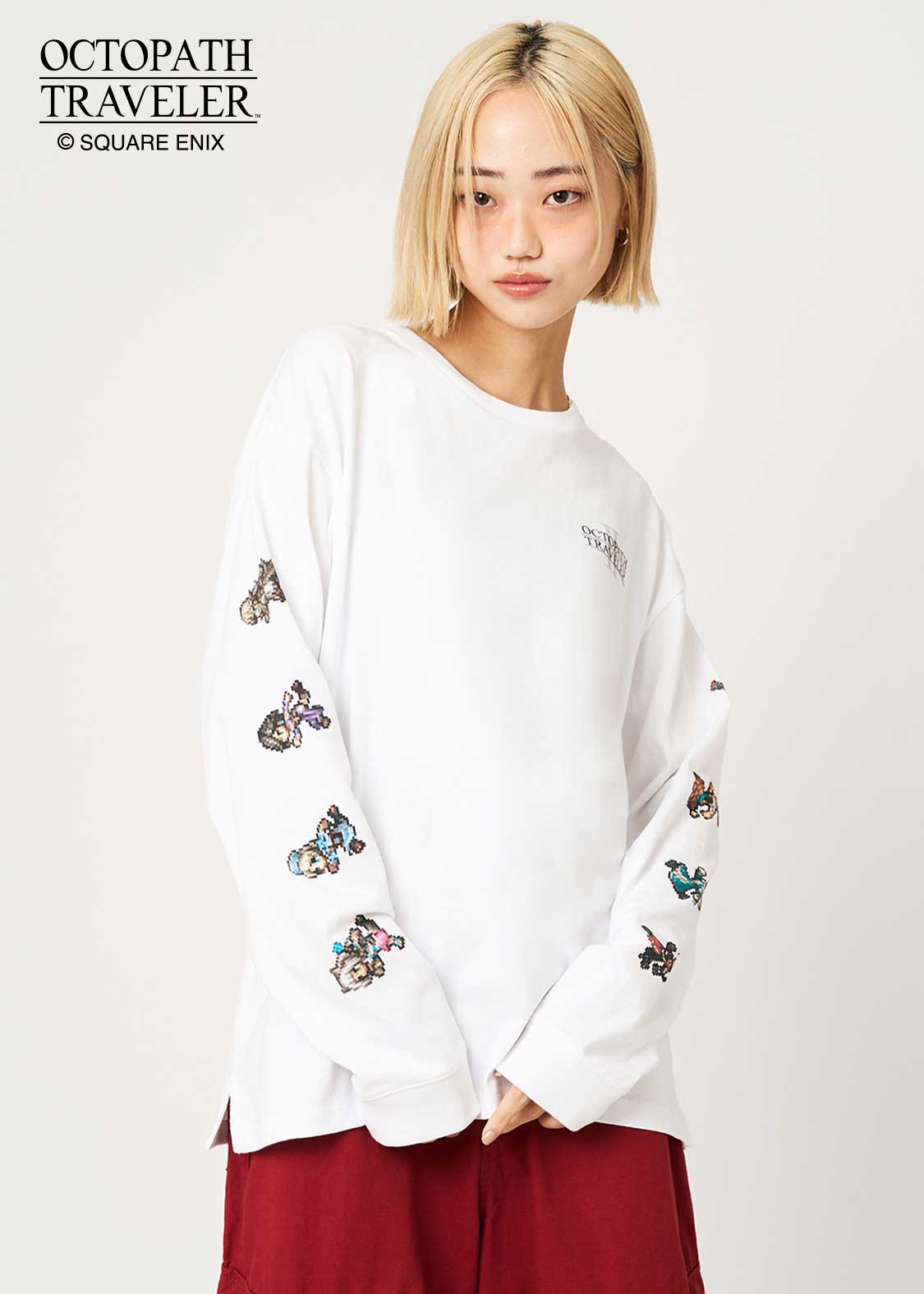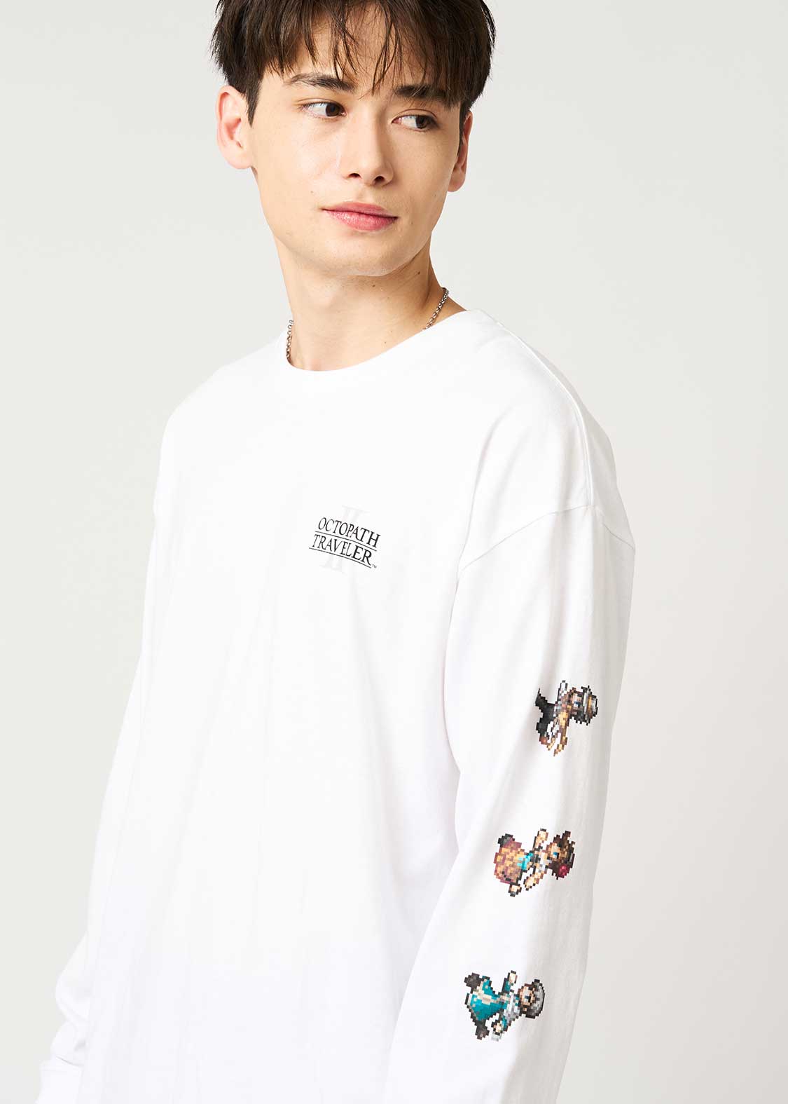 『オクトパストラベラーII』より。左右の袖に4人ずつ8人の旅人をプリントしました。バックには朝と夜で変わるそれぞれのフィールドコマンドのアイコンがプリントされています。