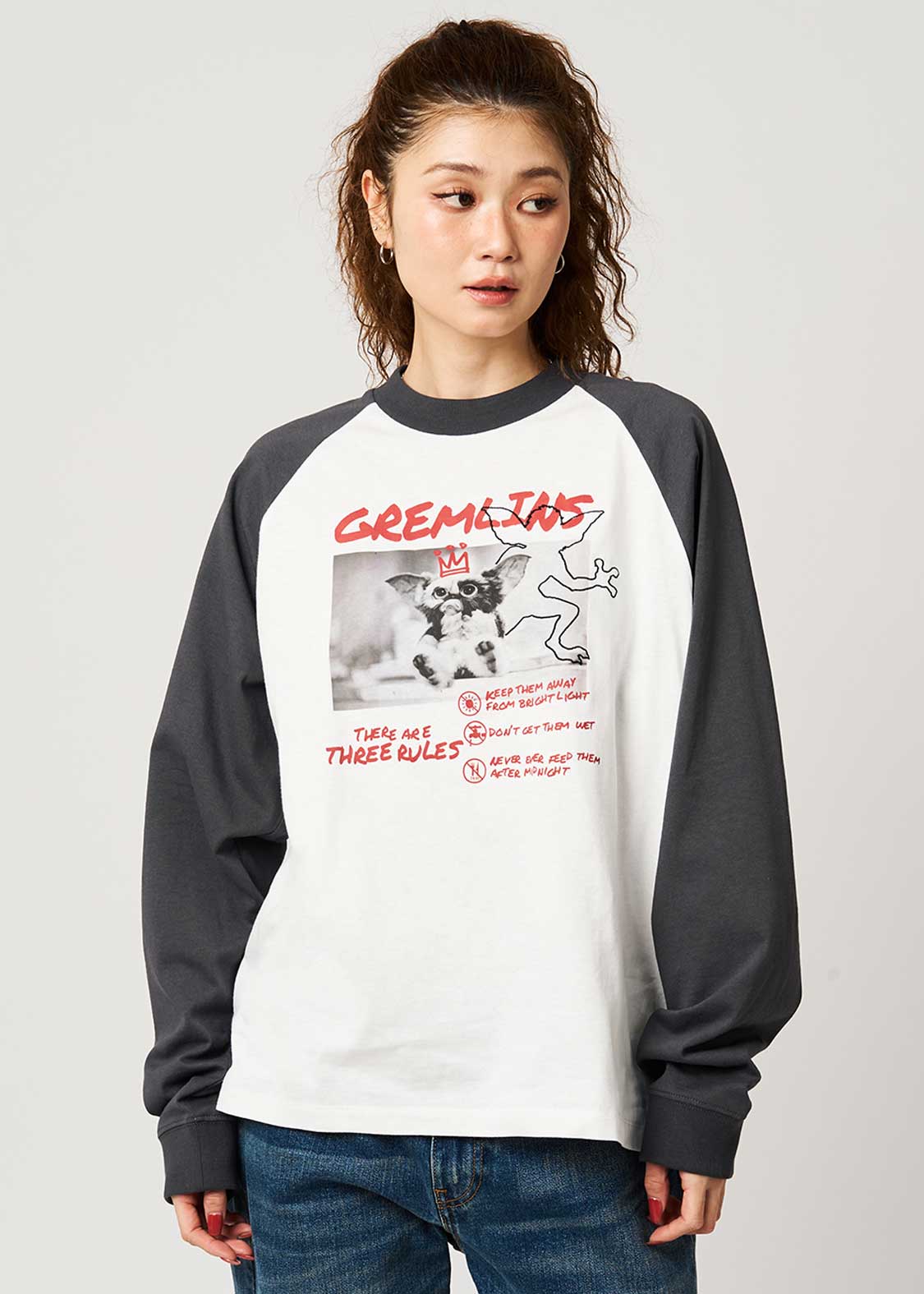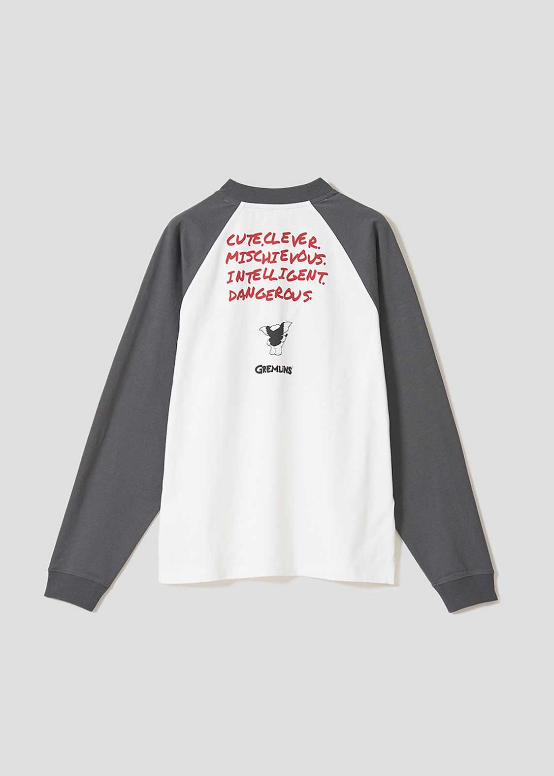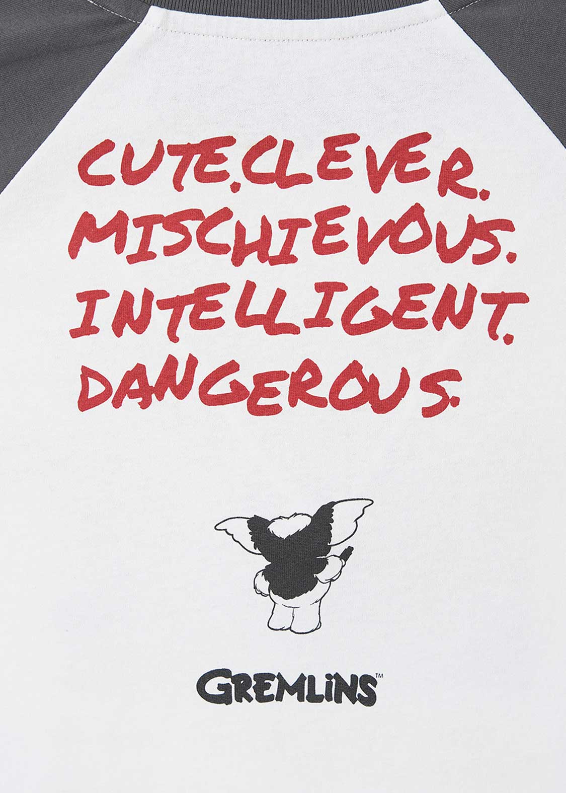 プリントされたギズモの後ろには、ストライプのシルエットを線画で刺繍し、“3つのルール”と「GREMLINS」のロゴをあしらったデザイン。バックには、ギズモを表現する単語とギズモの後ろ姿をプリントしています。