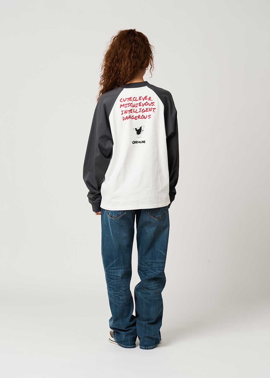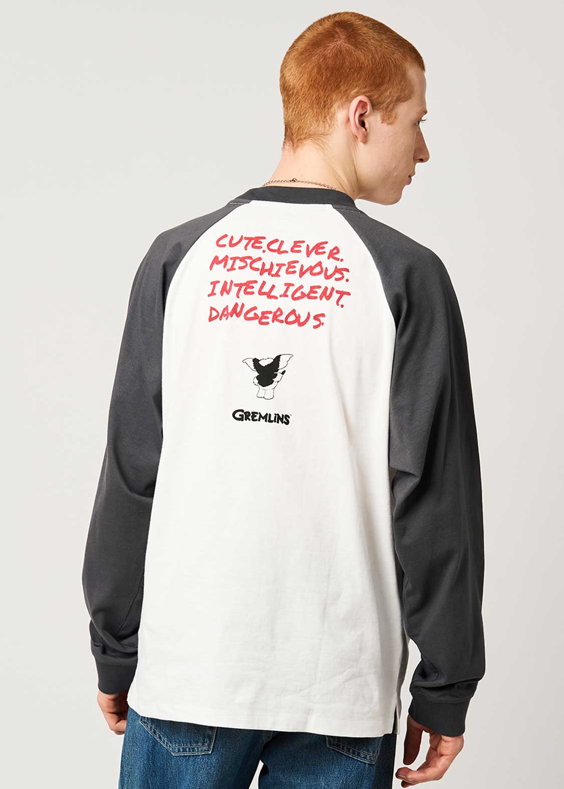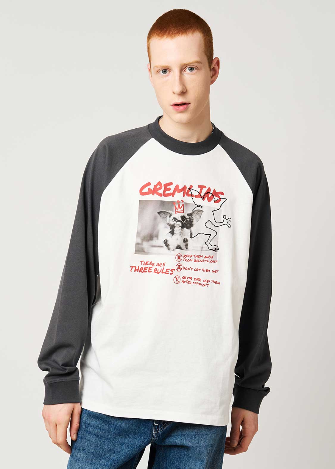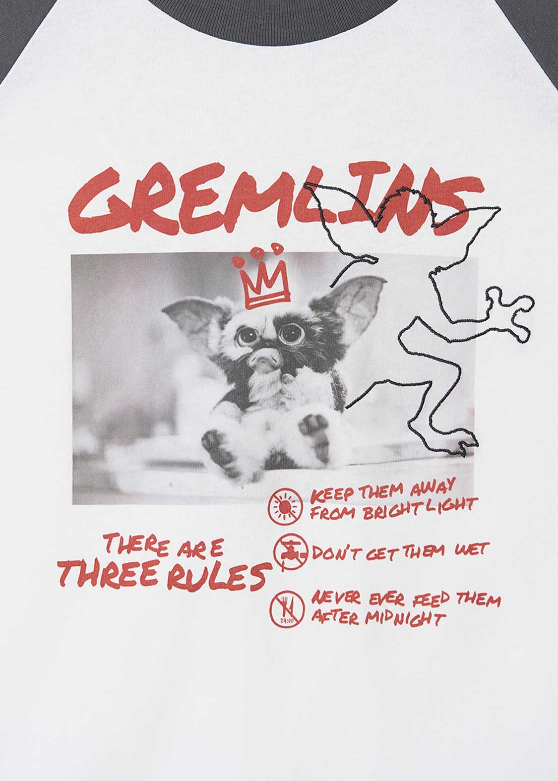 プリントされたギズモの後ろには、ストライプのシルエットを線画で刺繍し、“3つのルール”と「GREMLINS」のロゴをあしらったデザイン。バックには、ギズモを表現する単語とギズモの後ろ姿をプリントしています。