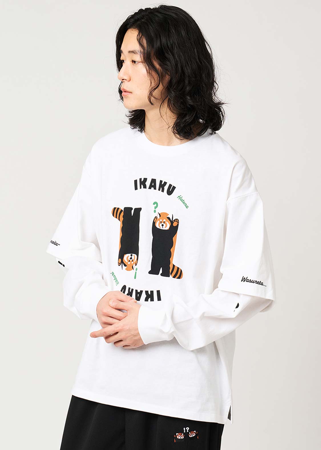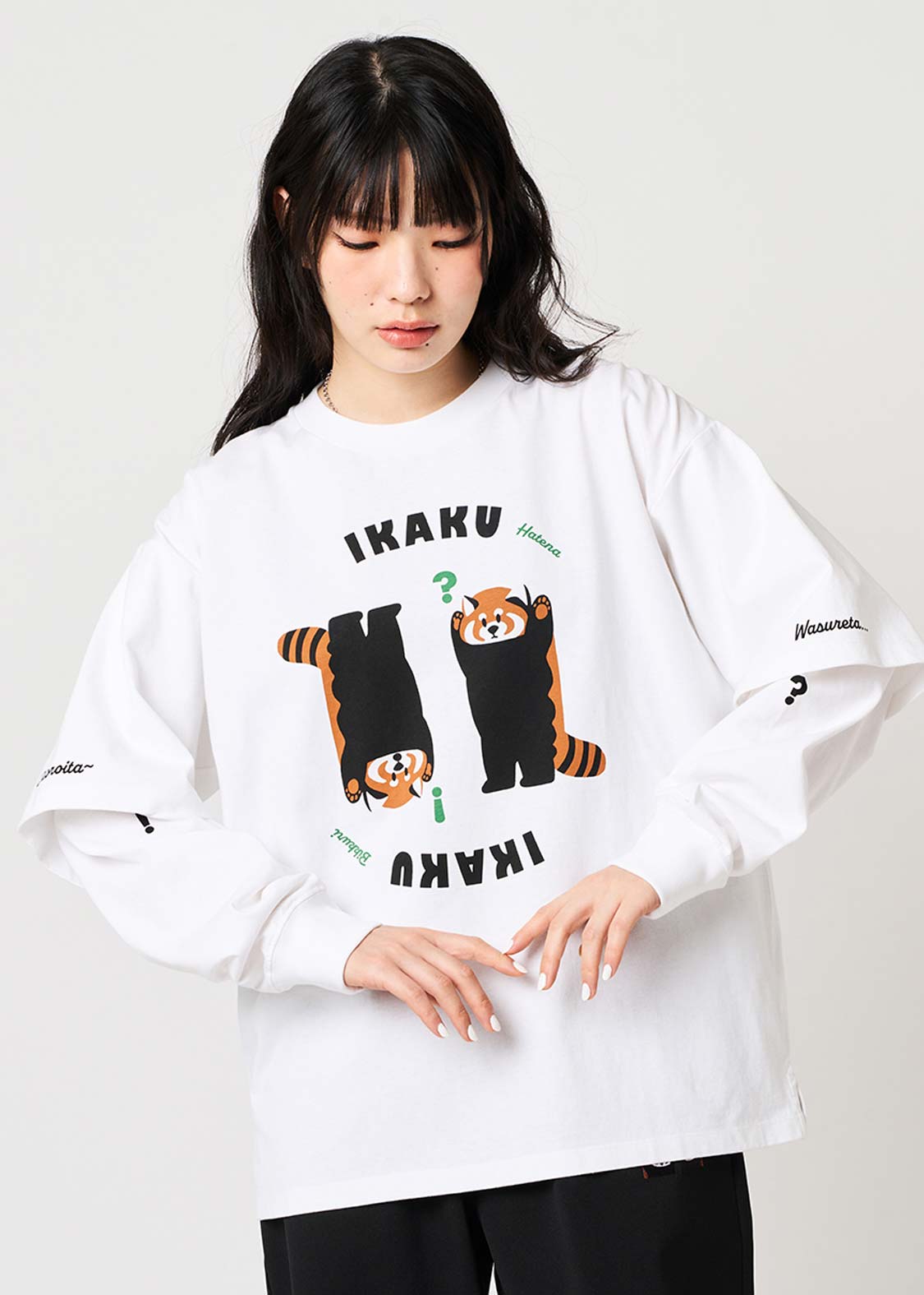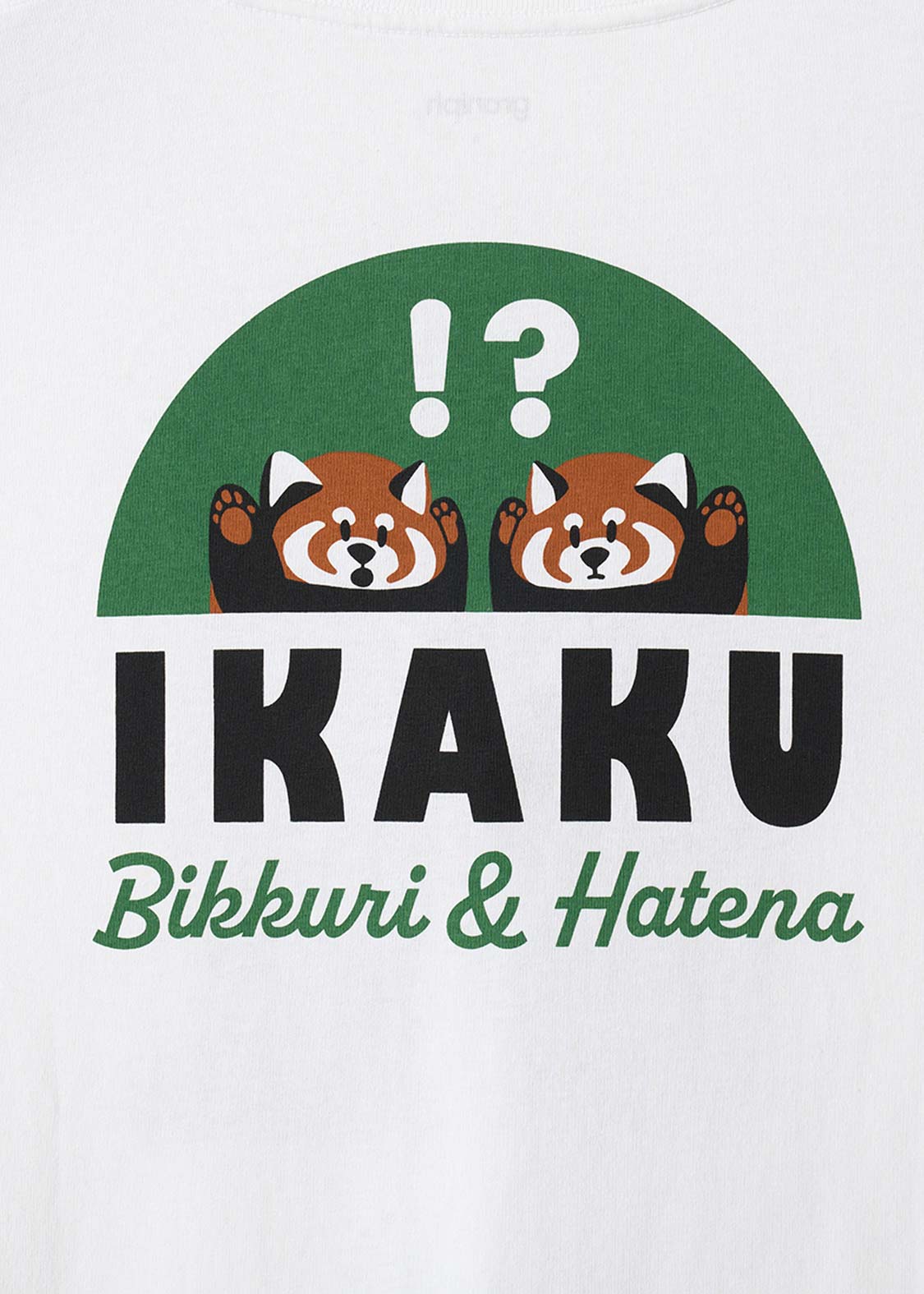 レッサーパンダの「?」と「!」の表情を、遊び心たっぷりにデザイン。ちょっとしたリアクションを切り取った、!?マークがアクセントのグラフィックです。