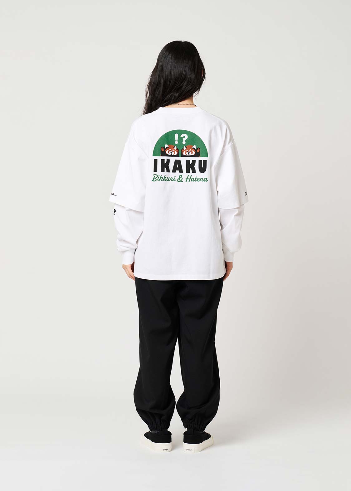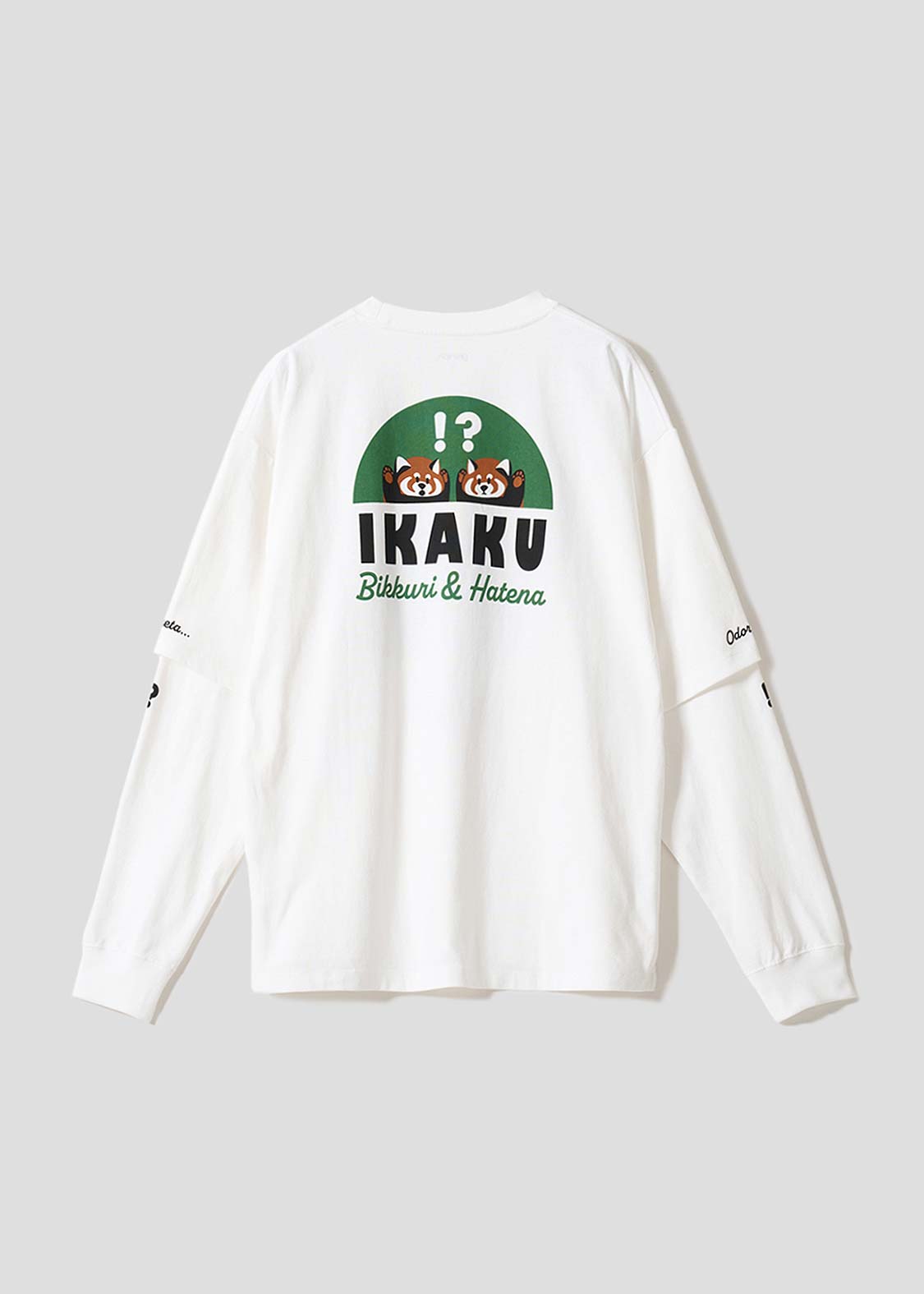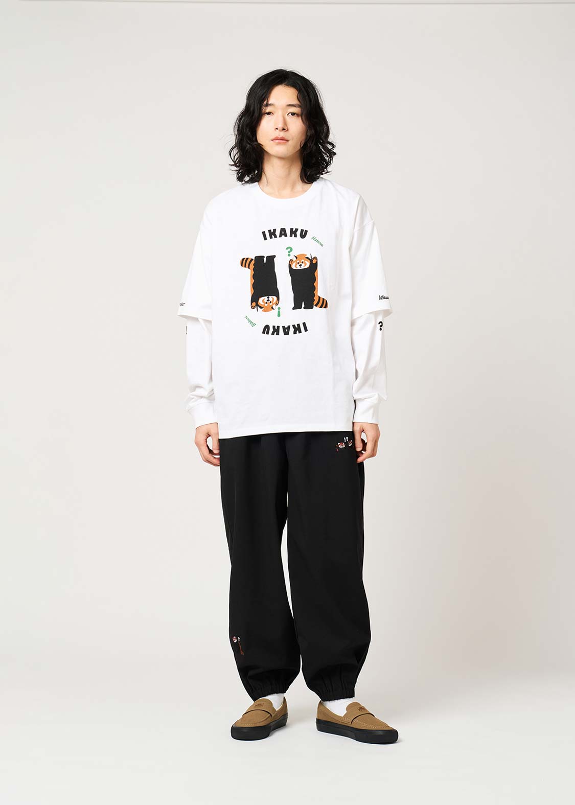 レッサーパンダの「?」と「!」の表情を、遊び心たっぷりにデザイン。ちょっとしたリアクションを切り取った、!?マークがアクセントのグラフィックです。