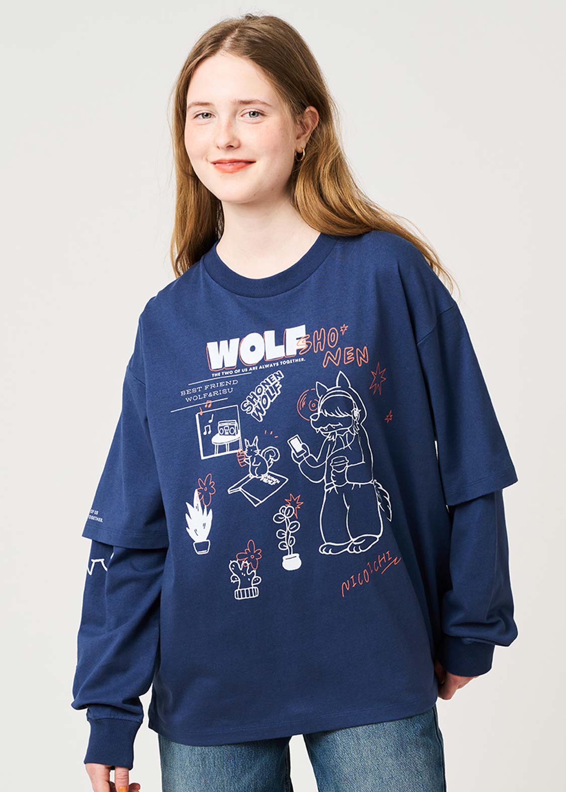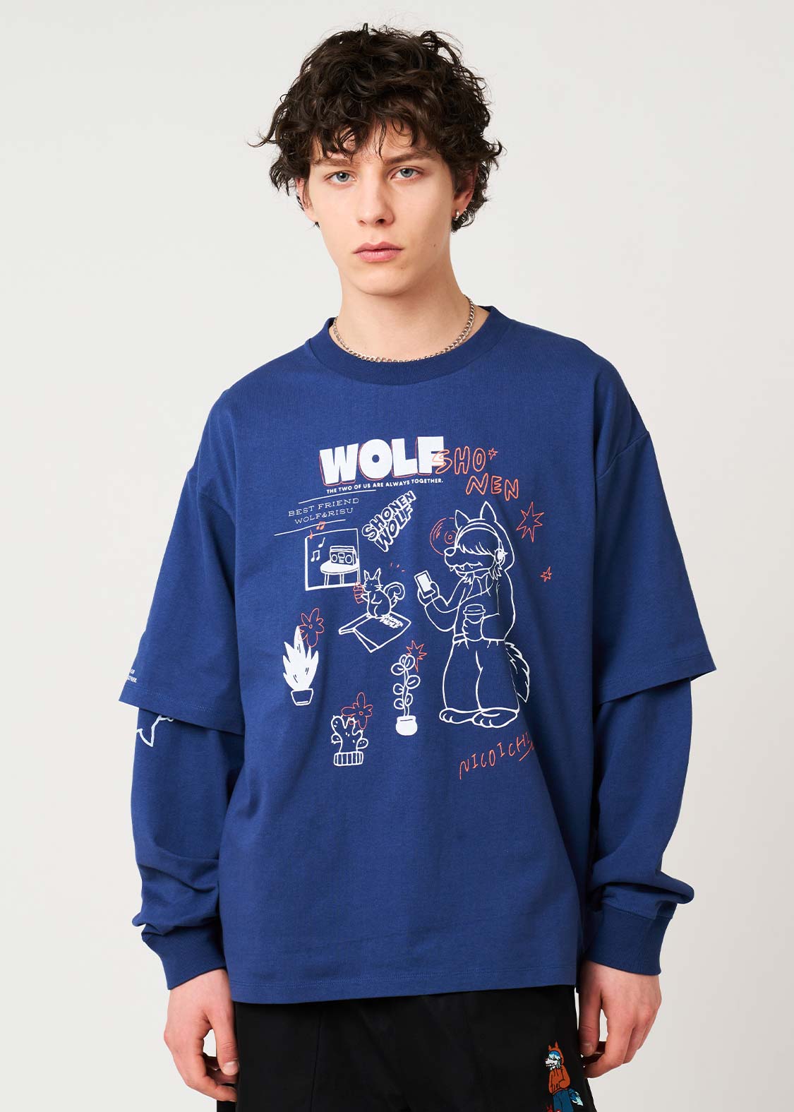 幼い頃公園で出会った大親友のリスくんと、いつも一緒の心優しいオオカミ少年。インナーカラーをいれたヘアスタイルが特徴です。ポップなイラストタッチが魅力のデザイン。
