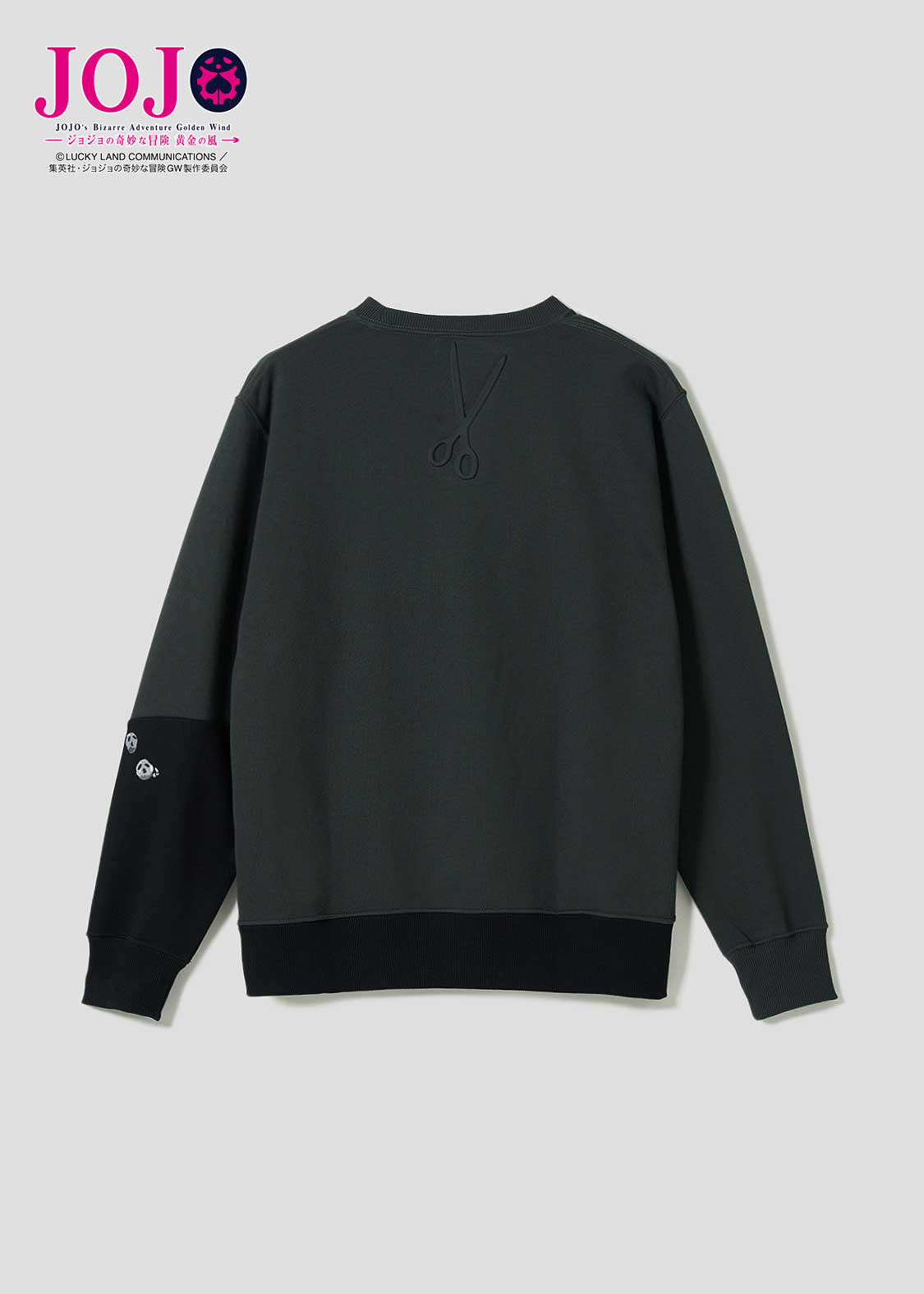 アニメ『ジョジョの奇妙な冒険 黄金の風』より。ギャング組織「パッショーネ」の一員で「暗殺者チーム」のリーダー・リゾットのスタンド「メタリカ」を刺繍で施したデザイン。バックには、磁力を操る能力によって体内の鉄分で作られたハサミがエンボス加工で表現されています。