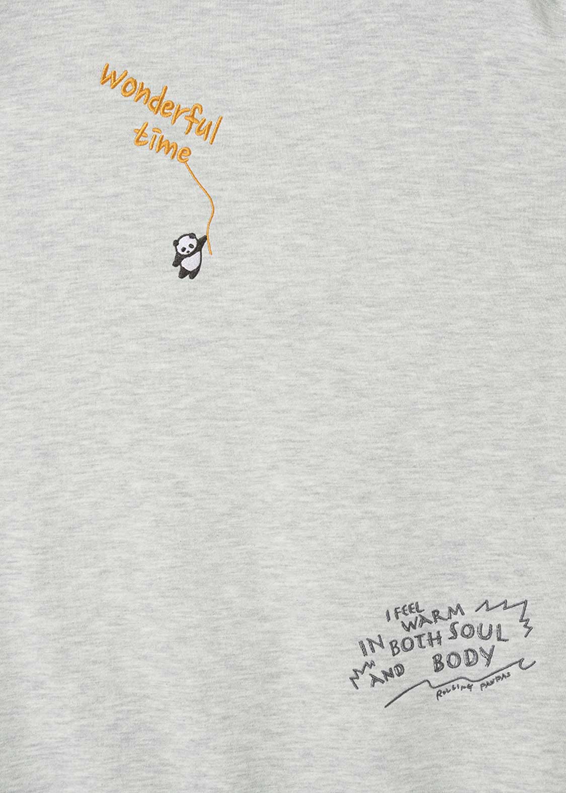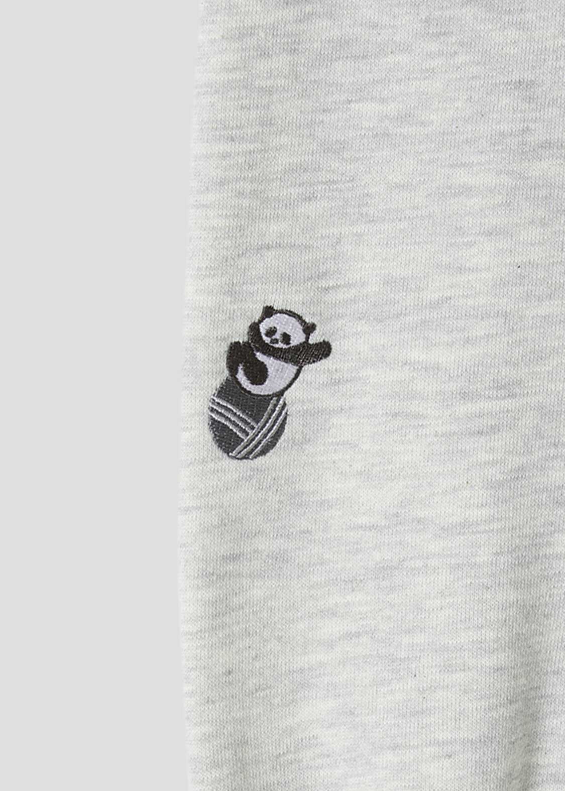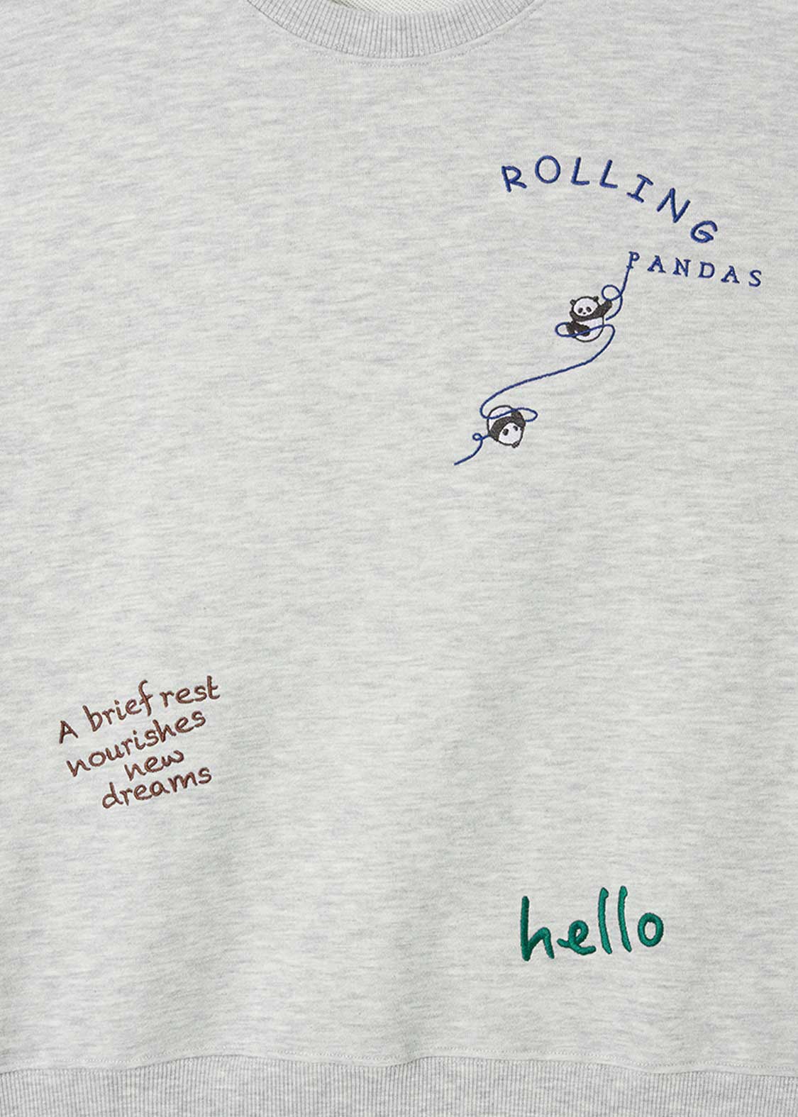 毬のように体を丸めた赤ちゃんパンダが、ころころと転がり落ちていく。その愛らしい姿に思わずほっこり気分になる、キュートなデザインです。