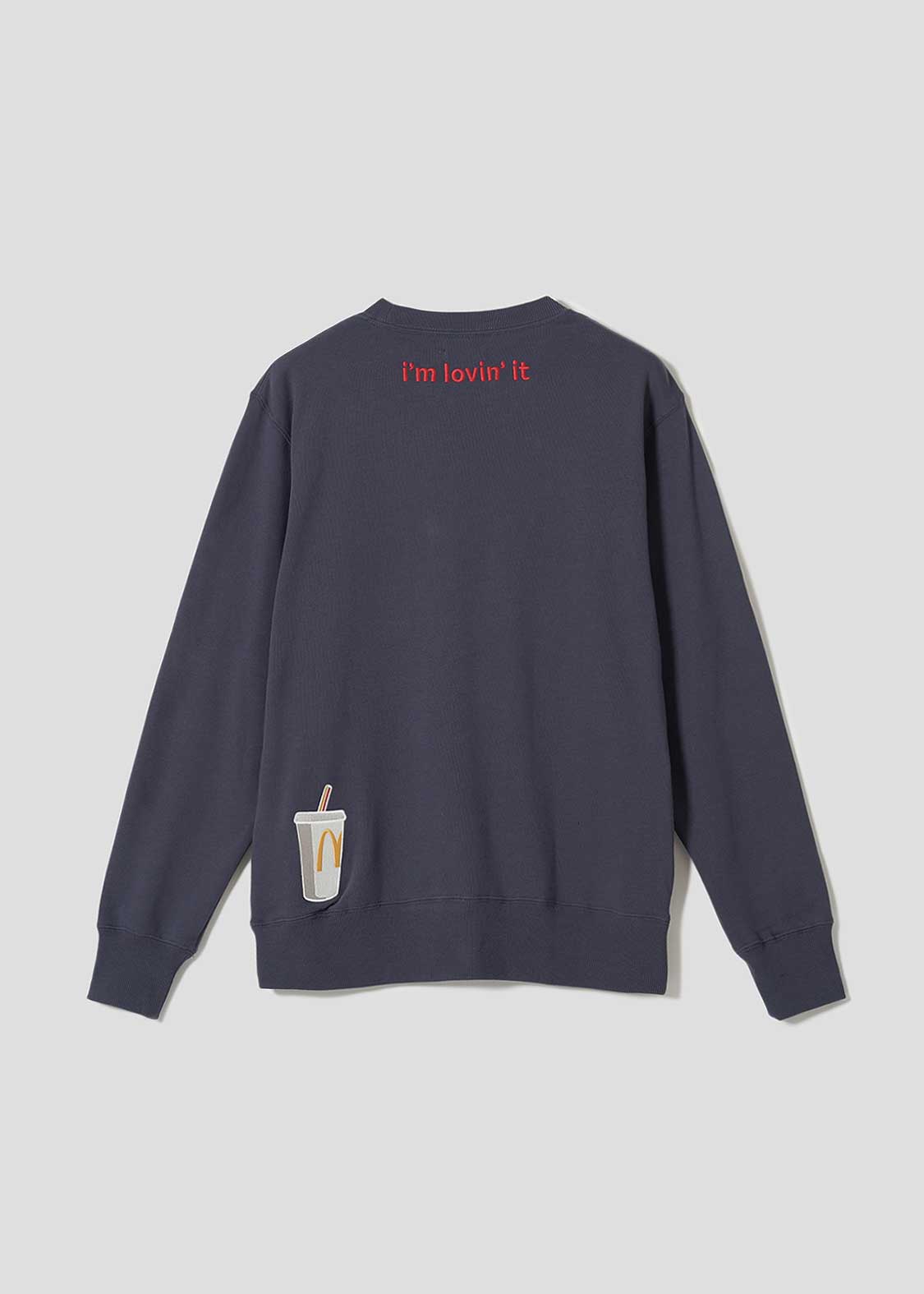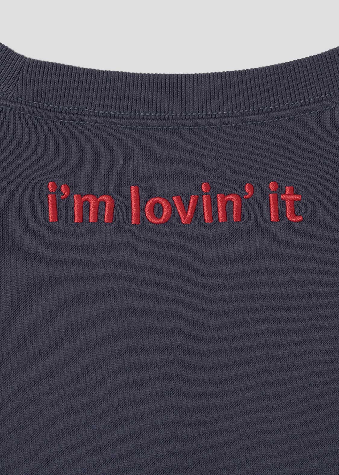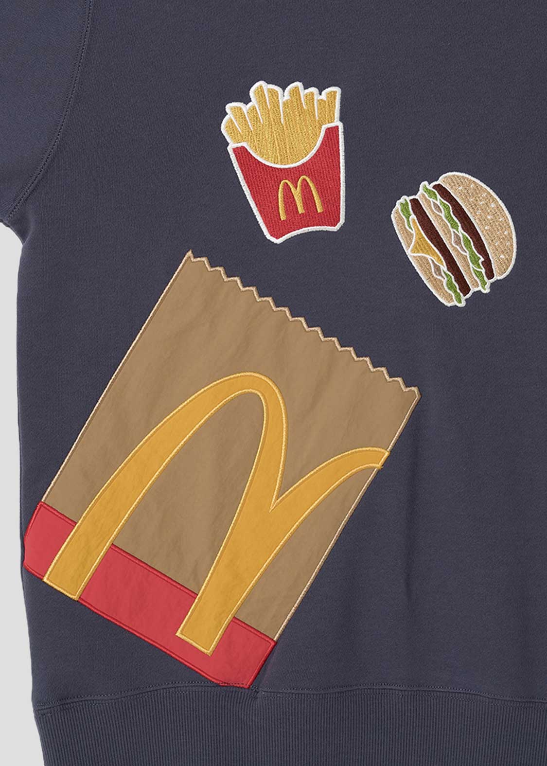 ポテトとドリンクのビッグマックセットをアップリケ刺繍したデザイン。バックの首元には全世界のマクドナルドで共通のキャンペーンフレーズ「i’m lovin’ it」が刺繍されています。