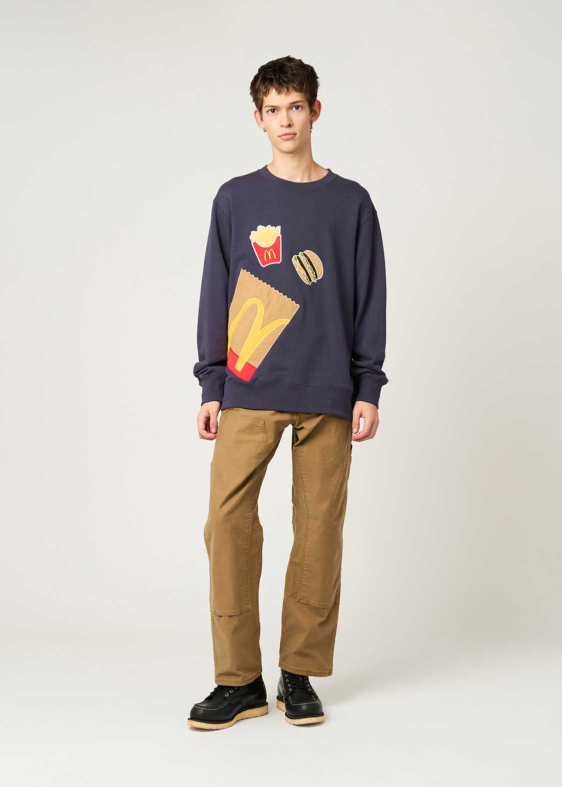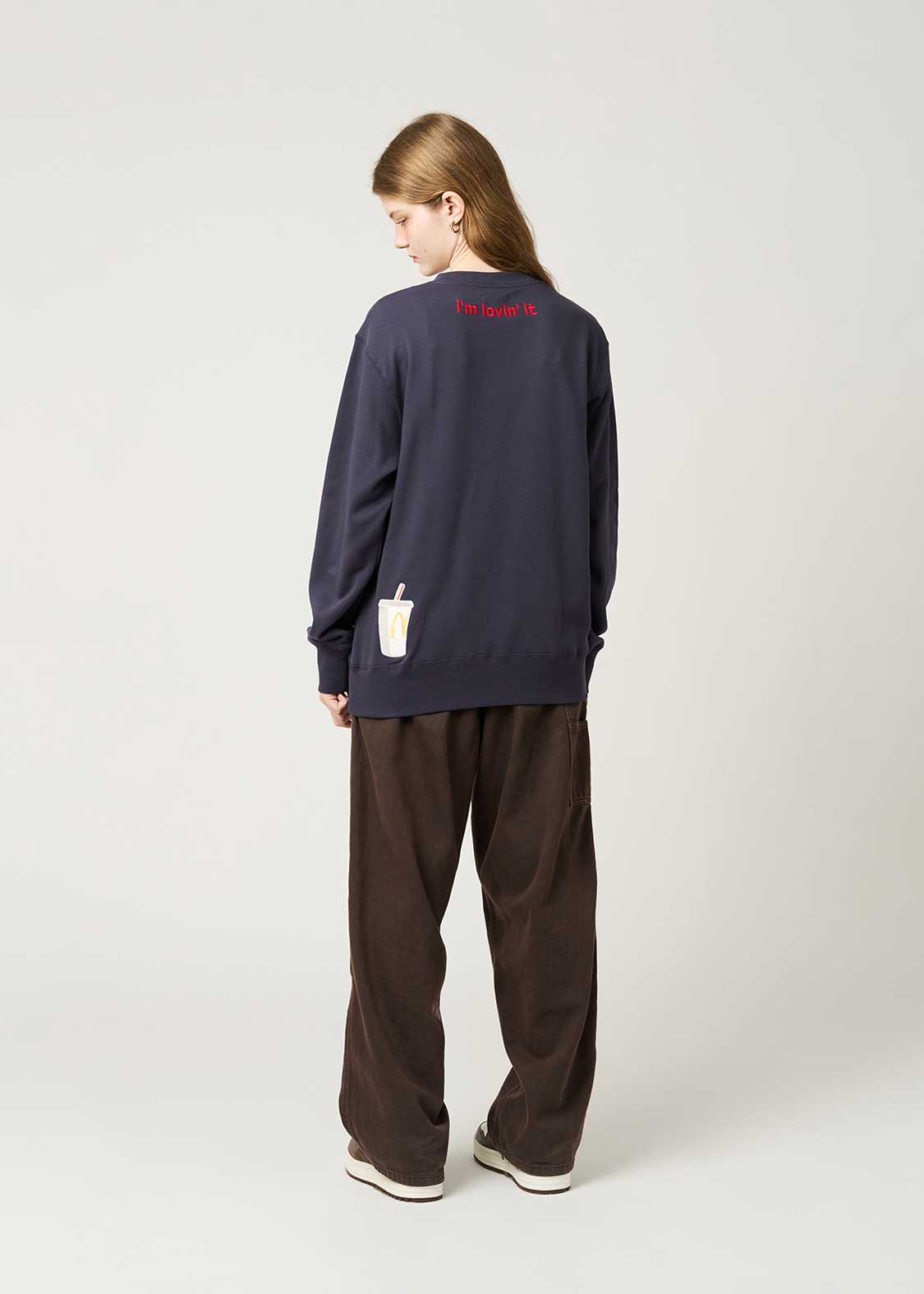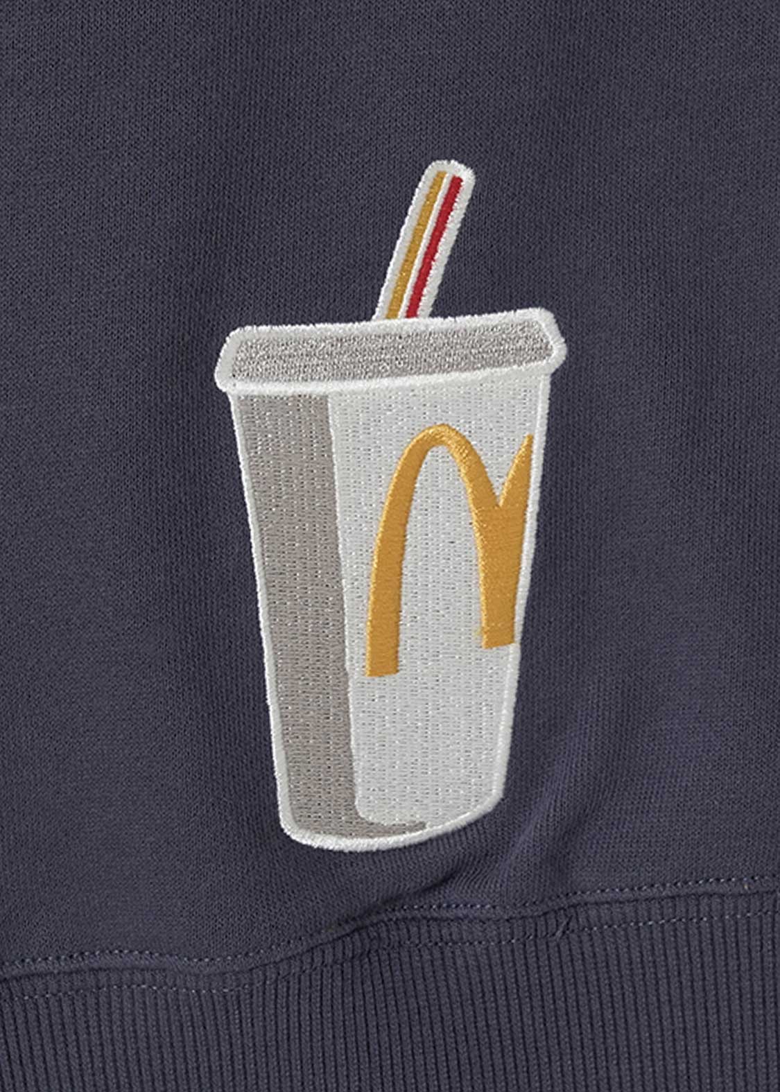 ポテトとドリンクのビッグマックセットをアップリケ刺繍したデザイン。バックの首元には全世界のマクドナルドで共通のキャンペーンフレーズ「i’m lovin’ it」が刺繍されています。