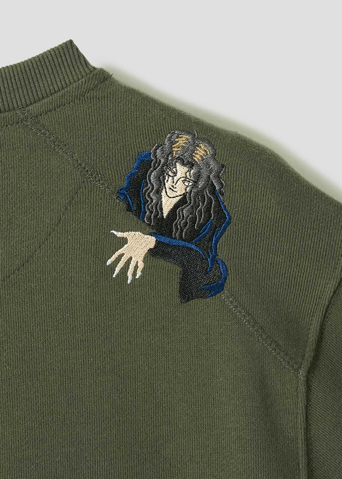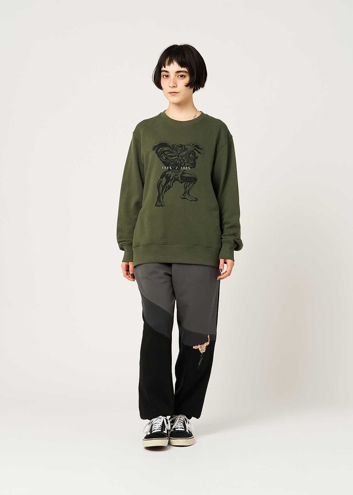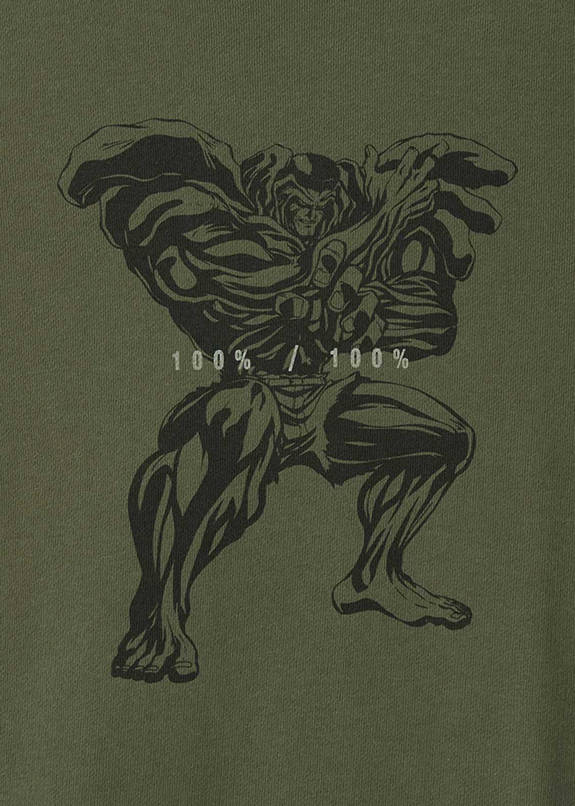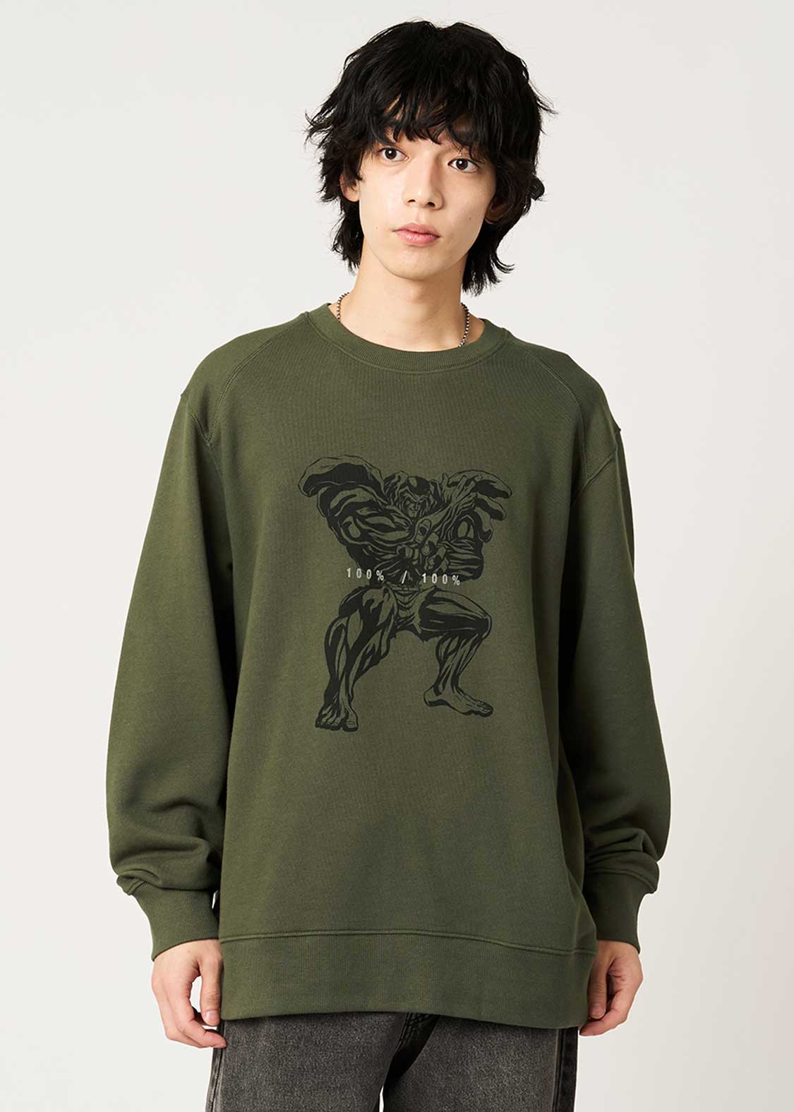 100%中の100%のフルパワーになった戸愚呂が幽助の最後の一撃を受けきったワンシーンをイメージしたデザイン。バックの右肩には刺繍された戸愚呂兄が乗っていて、首元の内側には100%を越えたひずみのひびがプリントされています。