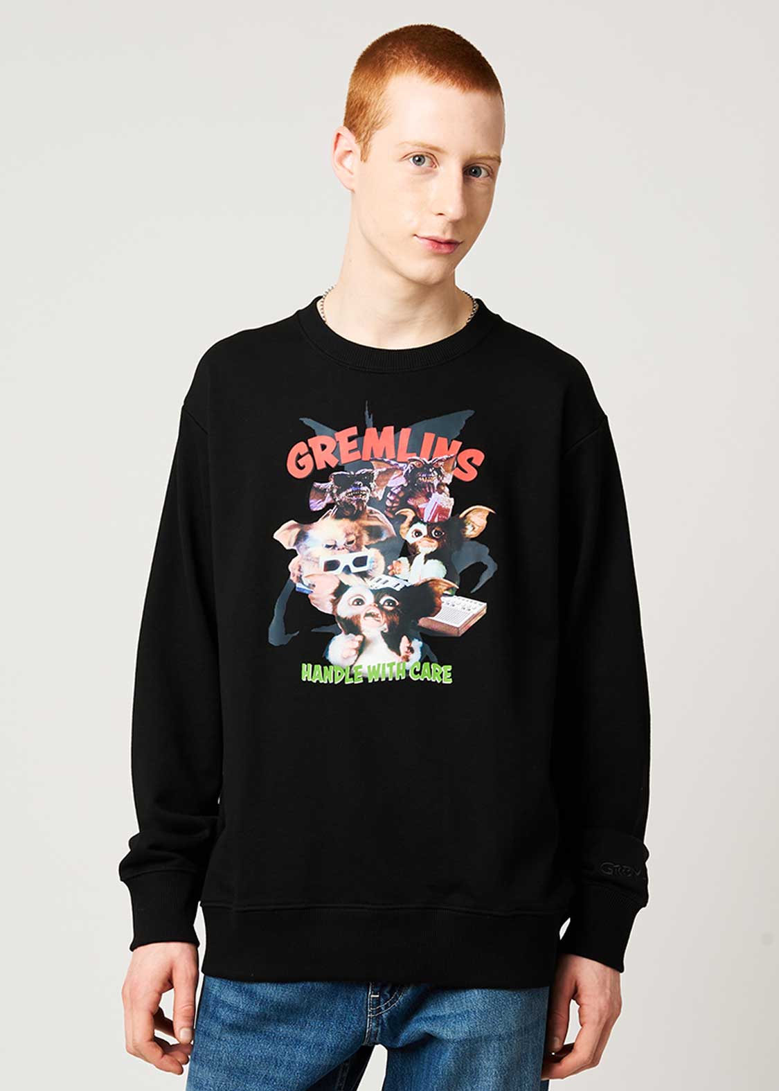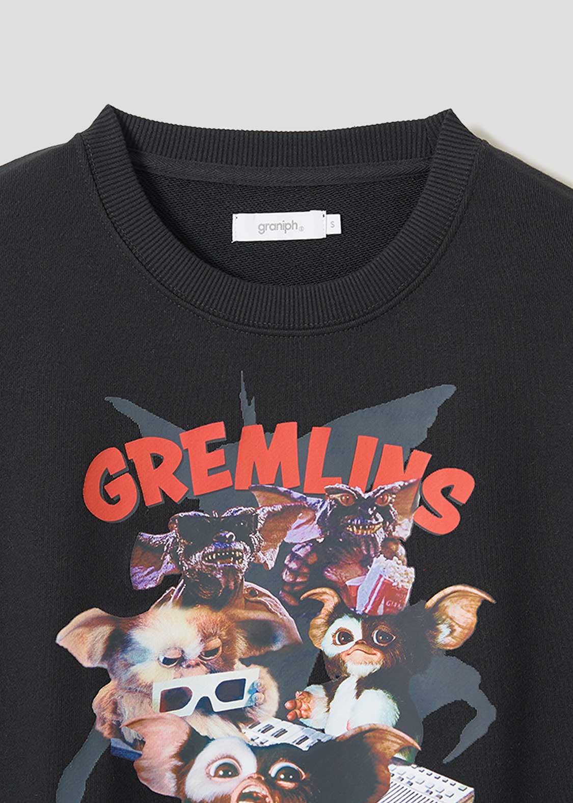 モグワイとグレムリンのさまざまな表情をコラージュした賑やかなデザイン。袖には「GREMLINS」のロゴ刺繍を施しています。愛らしいモグワイの取り扱いには、くれぐれもご注意を!