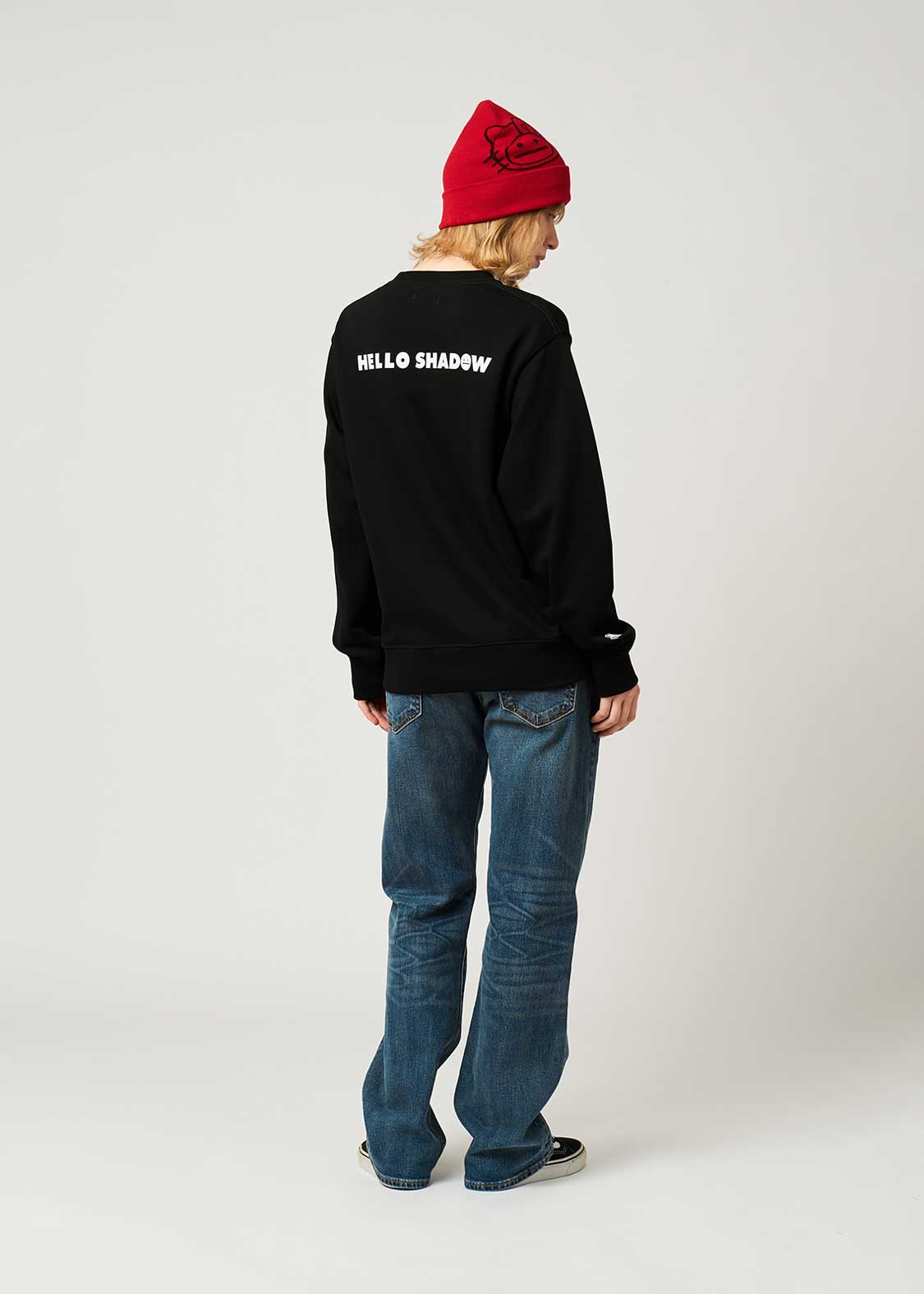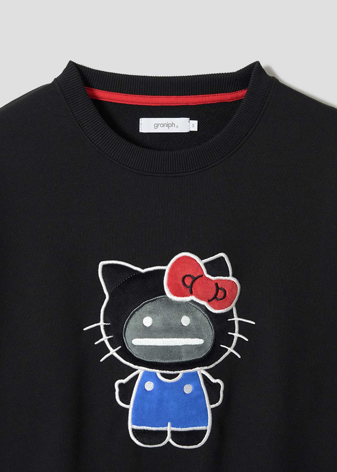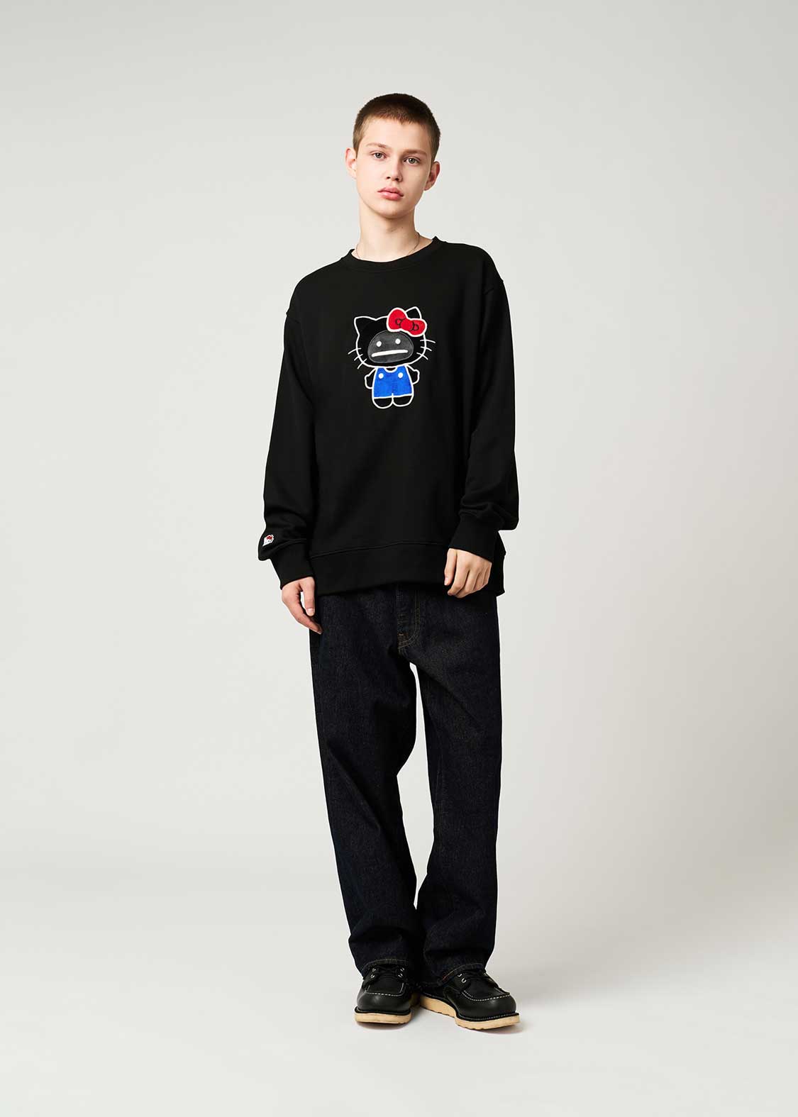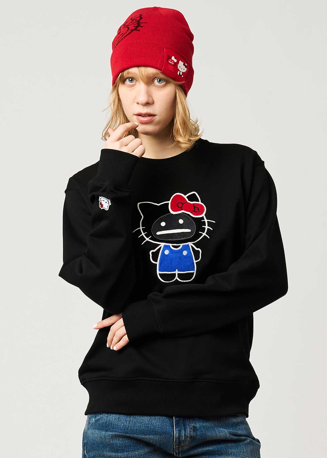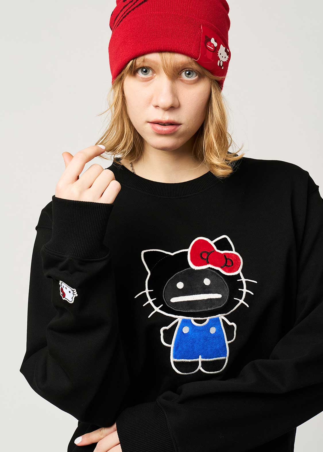 世界中のみんなから愛されているハローキティに憧れるビューティフルシャドー。ハローキティに憧れたシャドーは、自分自身がハローキティの格好をしたぬいぐるみを作りました。耳の形やお洋服のボタンの位置など、少しガタガタなところもご愛嬌です。アップリケと刺繍で表現されたシャドーはフワフワ。右袖にあしらわれた刺繍ワッペンのハローキティがポイントです。
