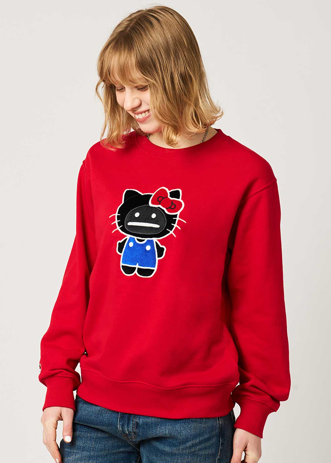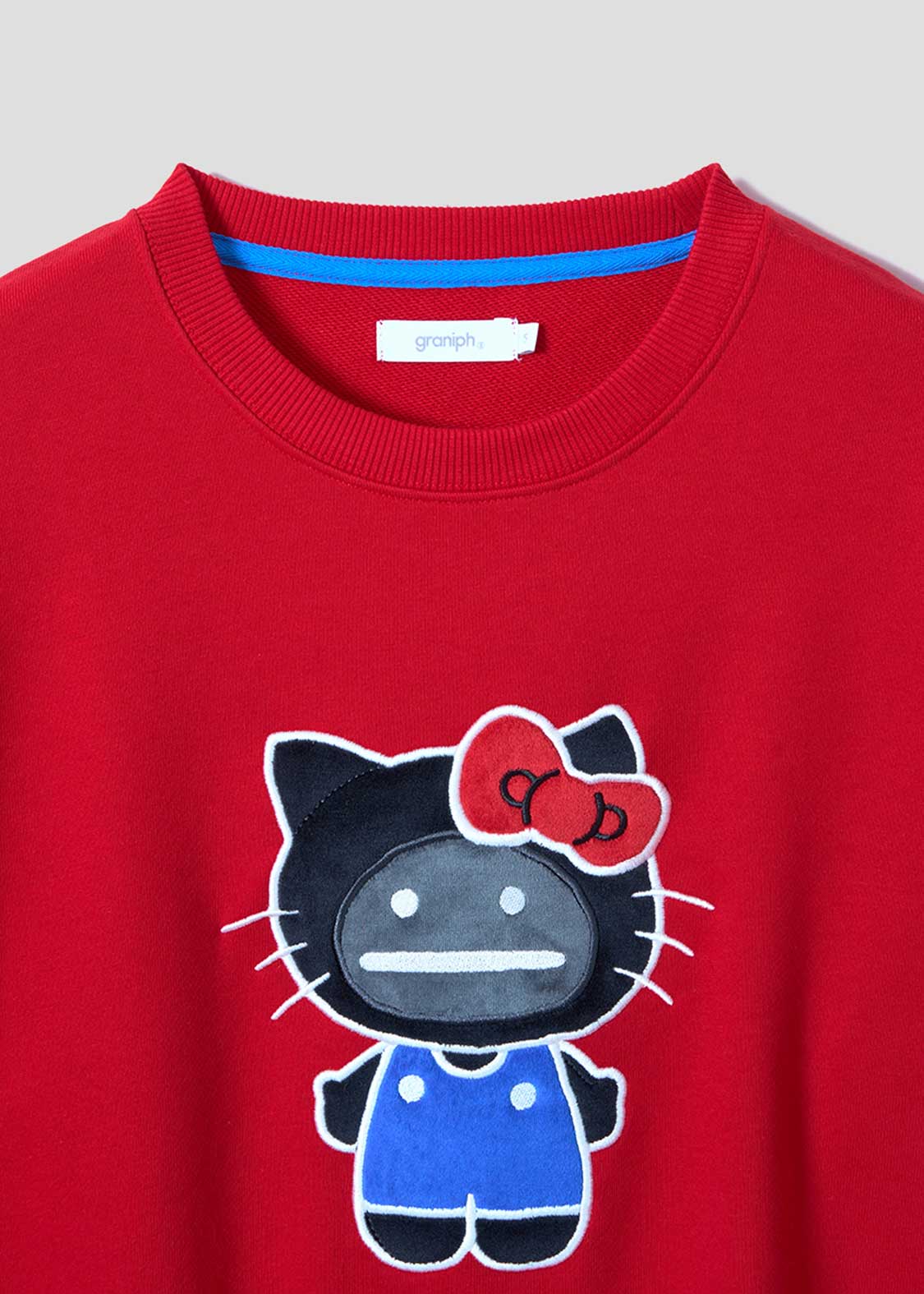 世界中のみんなから愛されているハローキティに憧れるビューティフルシャドー。ハローキティに憧れたシャドーは、自分自身がハローキティの格好をしたぬいぐるみを作りました。耳の形やお洋服のボタンの位置など、少しガタガタなところもご愛嬌です。アップリケと刺繍で表現されたシャドーはフワフワ。右袖にあしらわれた刺繍ワッペンのハローキティがポイントです。