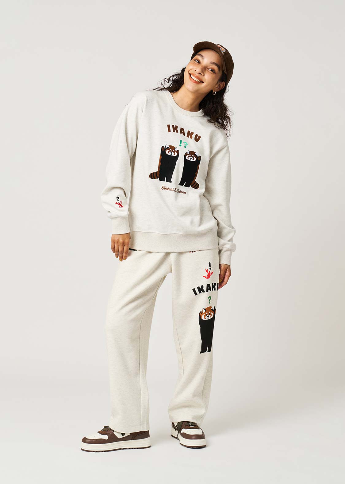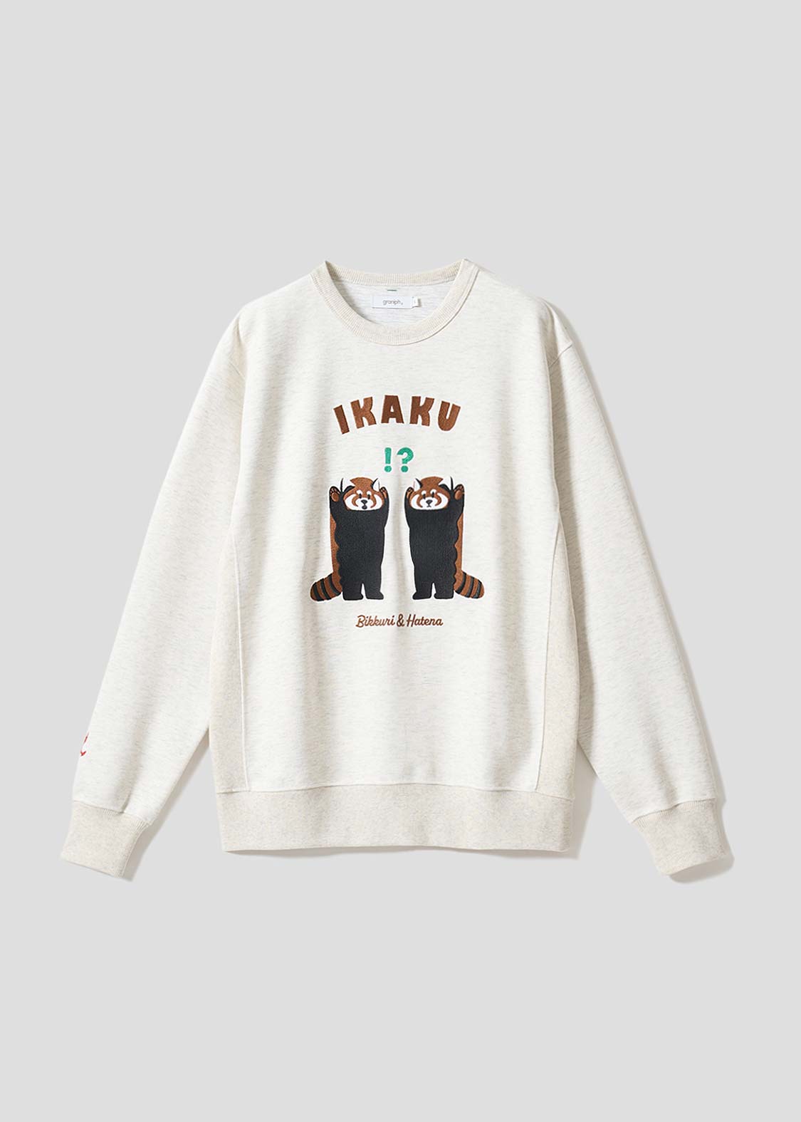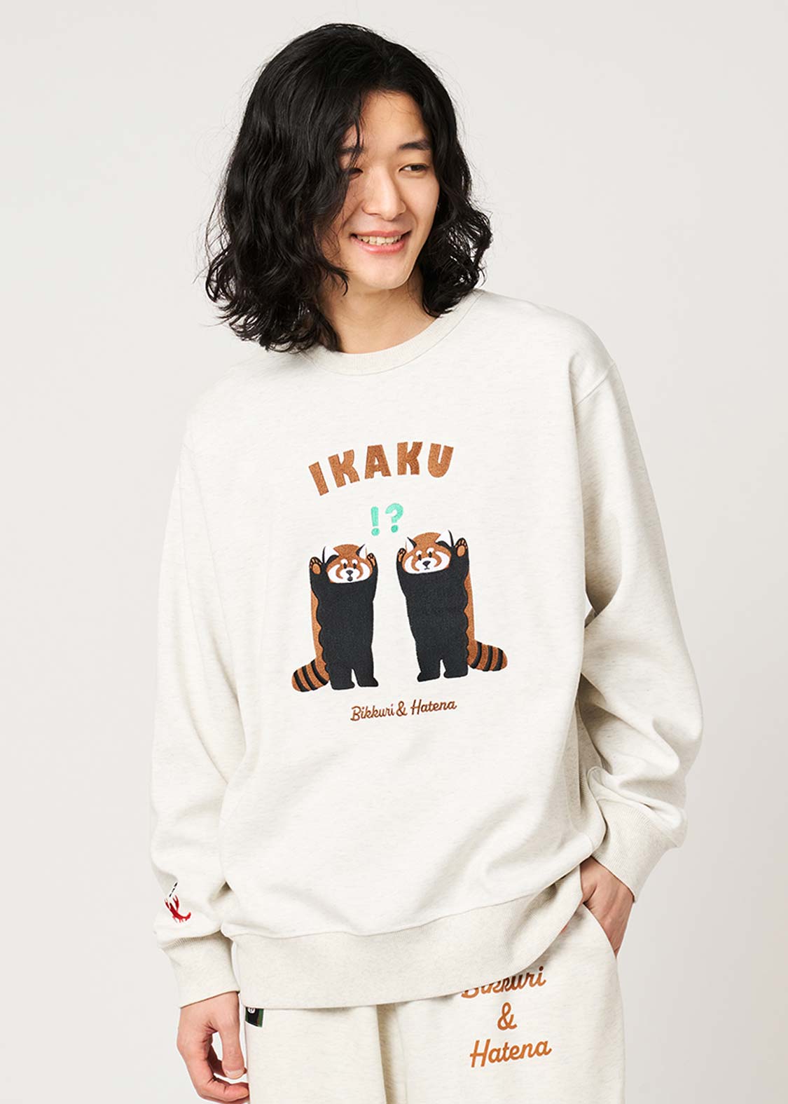 レッサーパンダの「?」と「!」の表情を、遊び心たっぷりにデザイン。ちょっとしたリアクションを切り取った、!?マークがアクセントのグラフィックです。