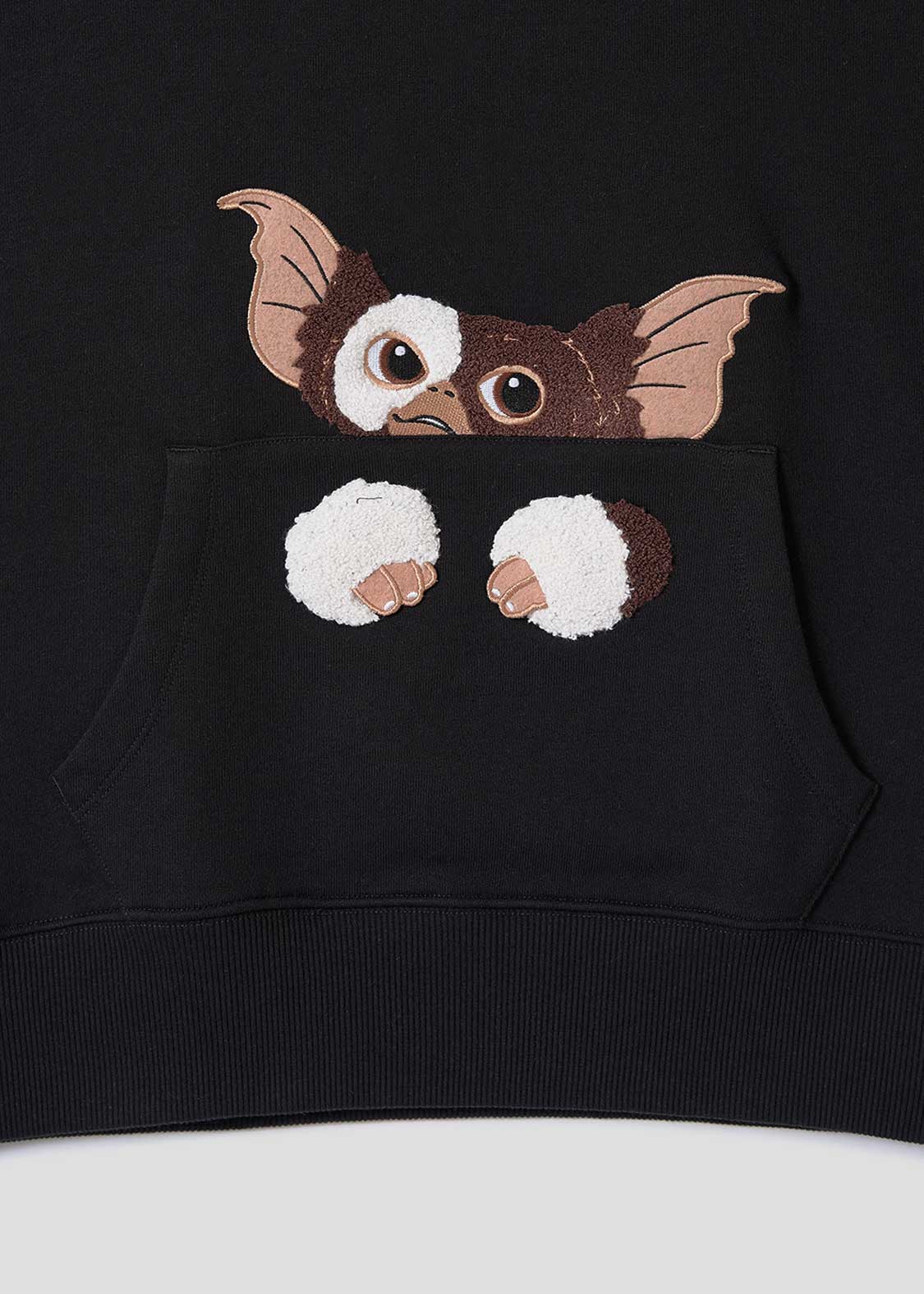 まるでポケットの中にギズモが入っているような遊び心あふれるデザイン。相良刺繍とフェルトで立体的に表現し、指の部分は固定されていないためパタパタと動かすことができます。バックには「GREMLINS」のロゴの上で気持ちよさそうに眠るギズモをプリントしました。
