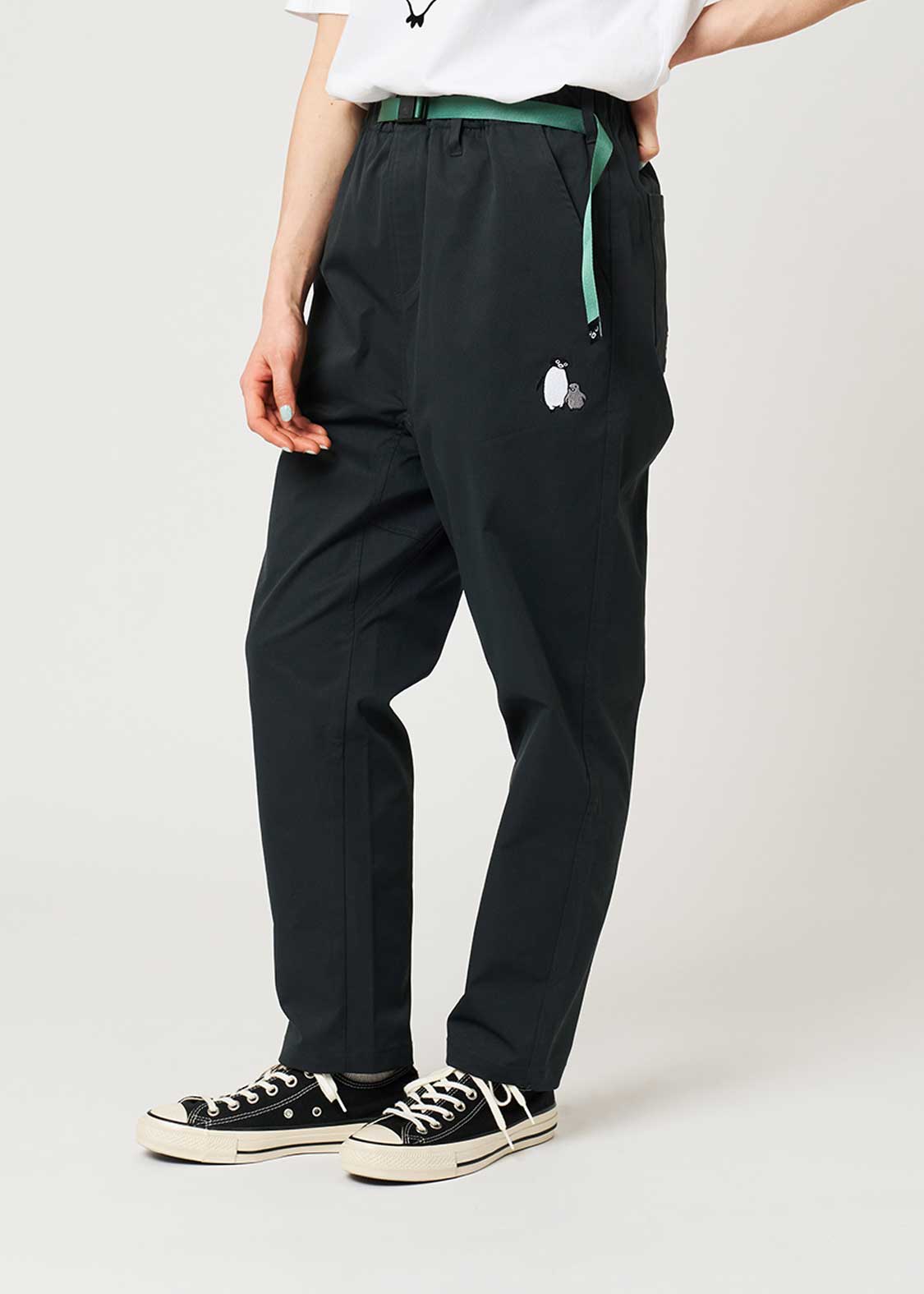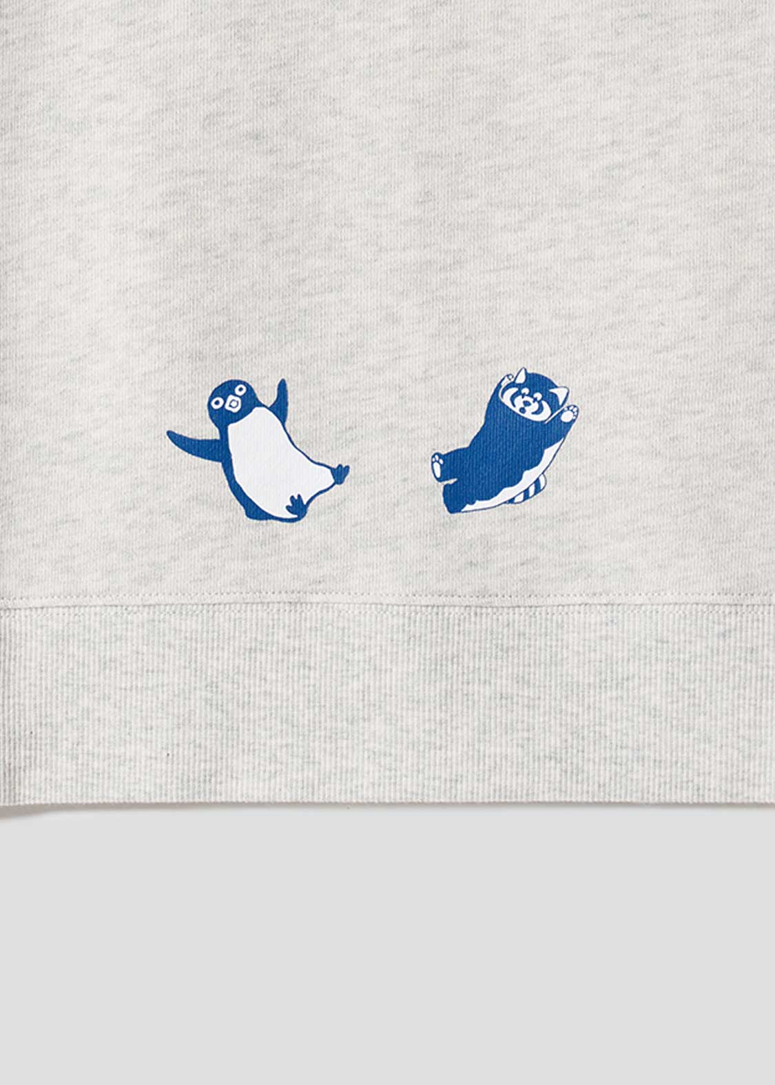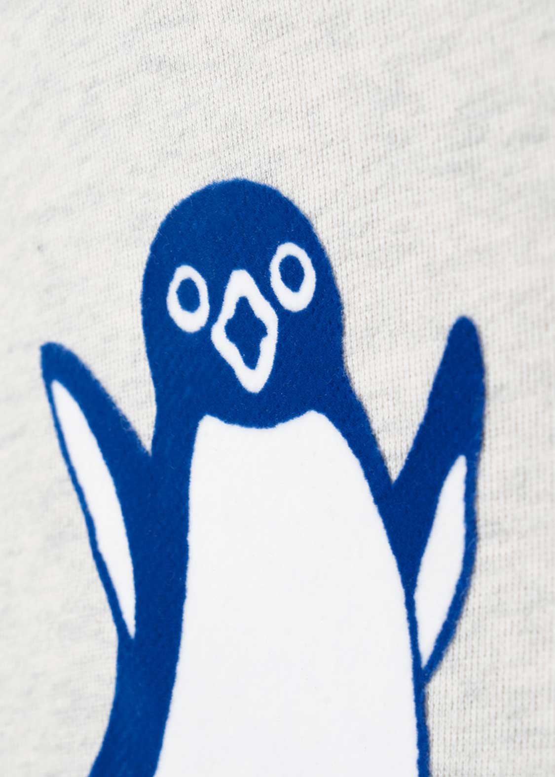 バンザイをしたペンギンとグラニフのキャラクターイカクが威嚇しあう特別なデザインをフロッキープリントで表現しました。威嚇勝負は引き分け?バックには後ろに倒れるペンギンとイカクがプリントされています。