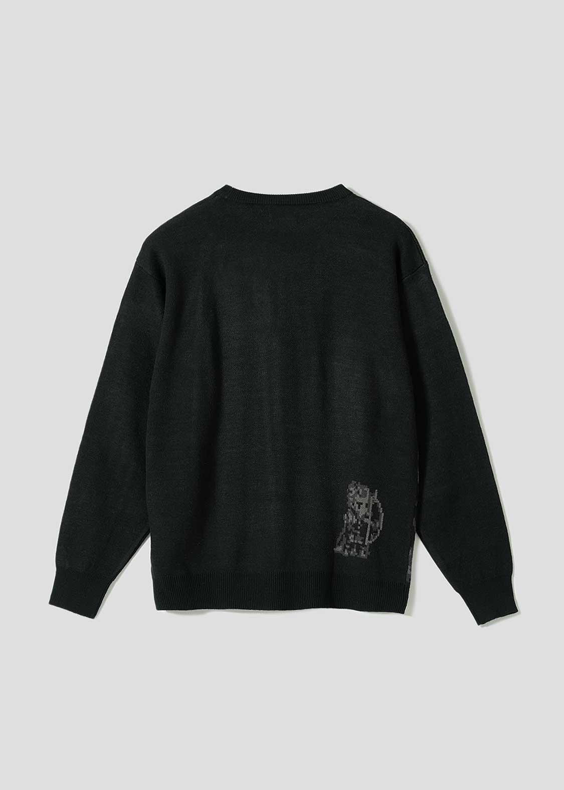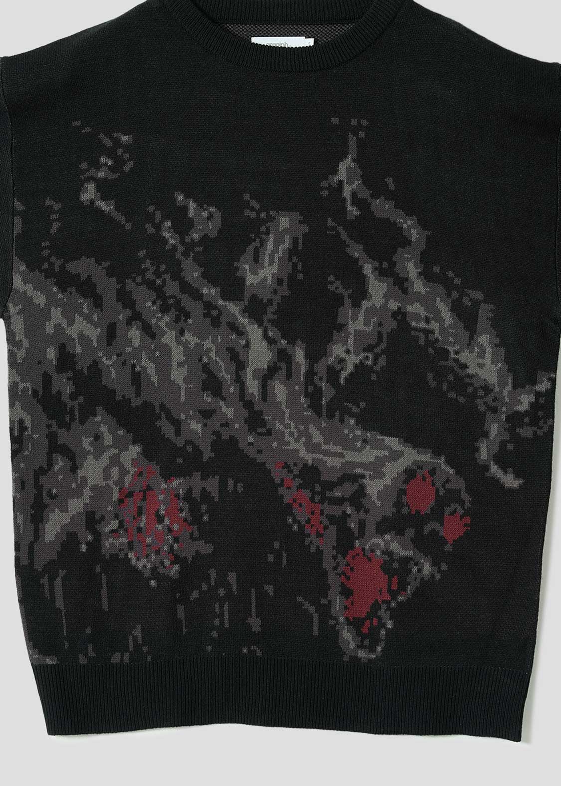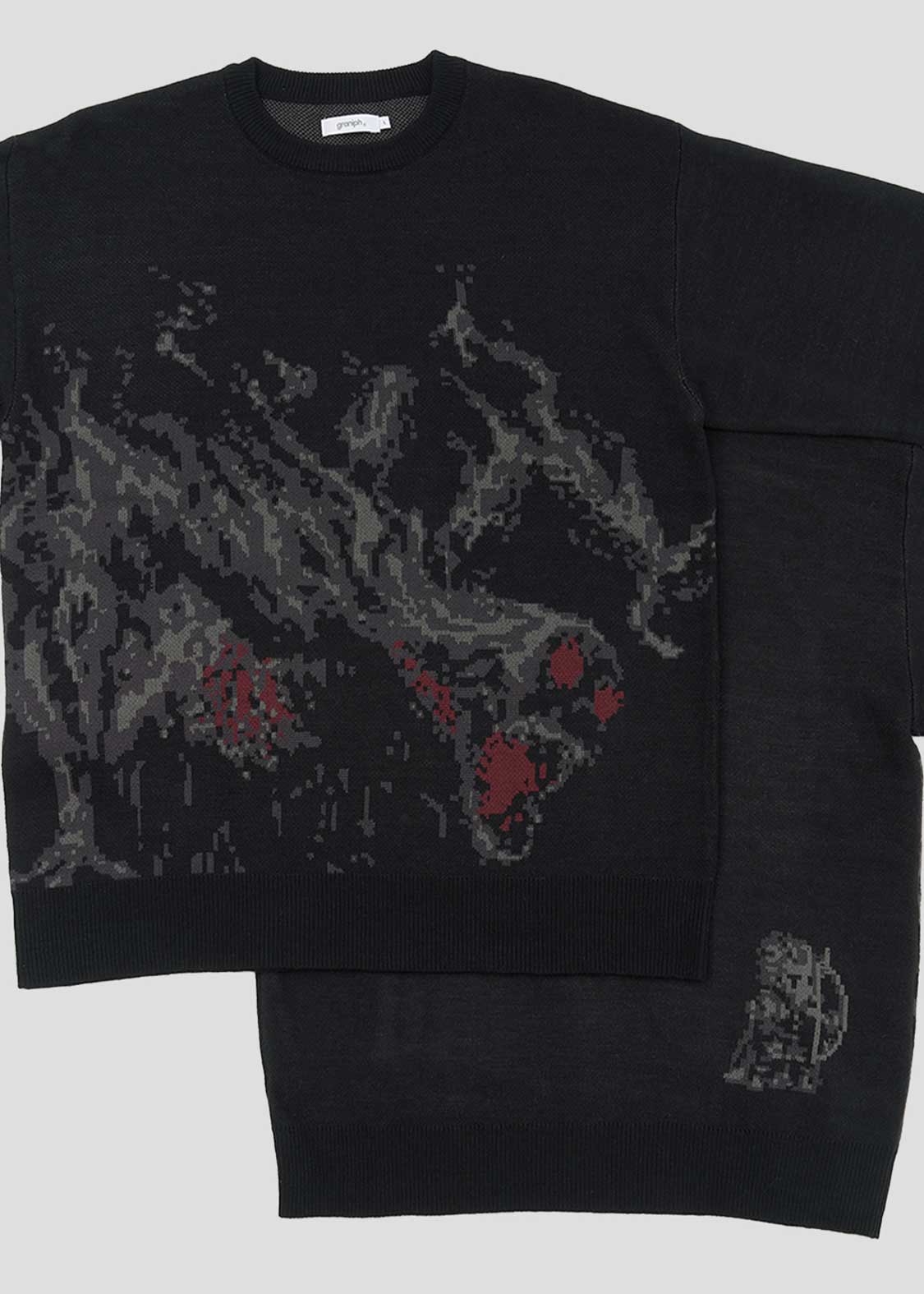 『オクトパストラベラー』より。狩人ハンイットの師匠であるザンターを石化させたモンスター赤目のおどろおどろしい姿をジャカード編みで表現したデザイン。バックの石化したザンターにも注目です。