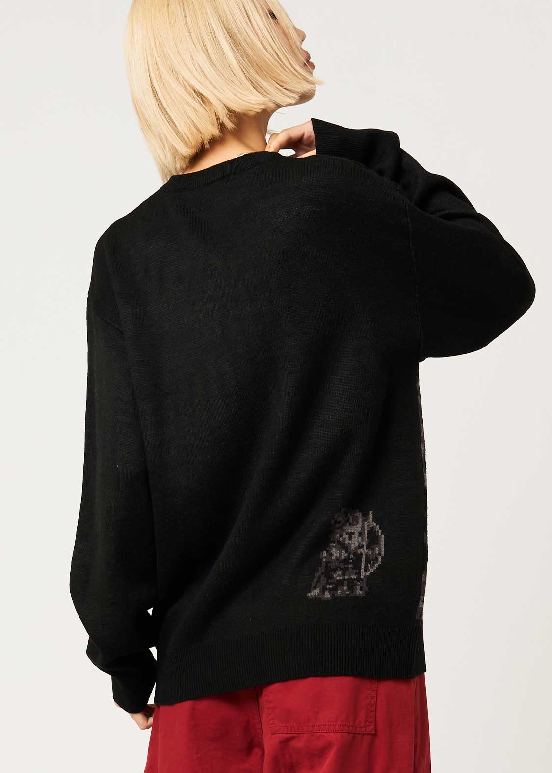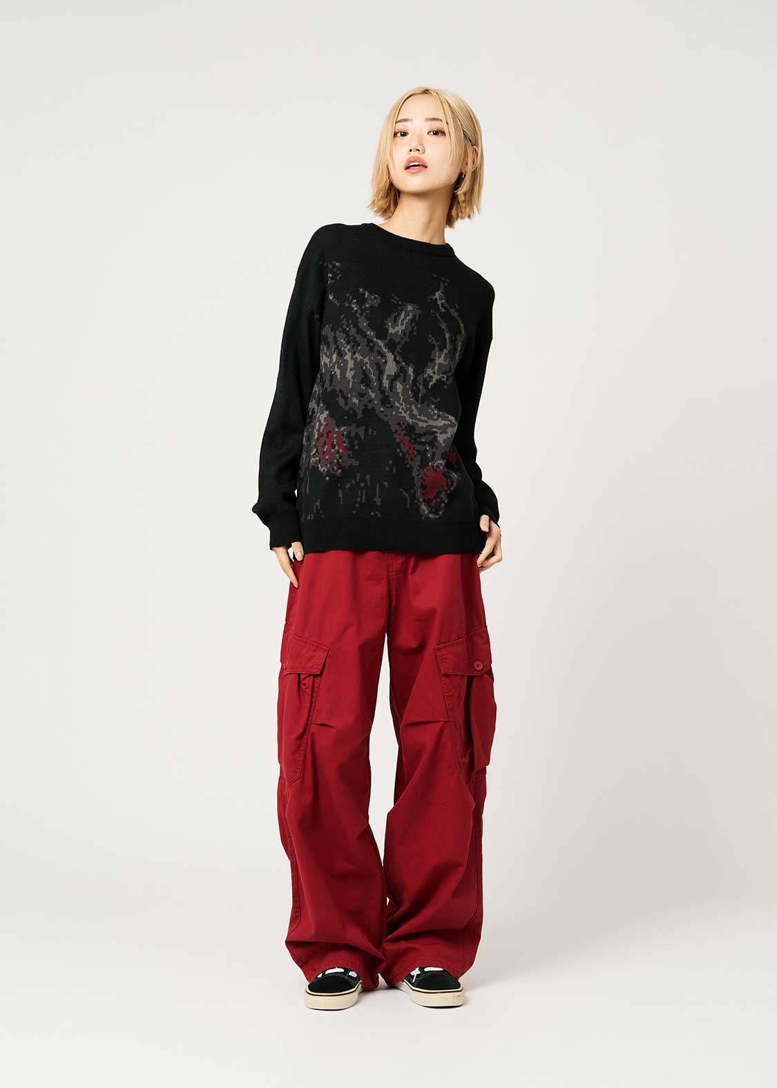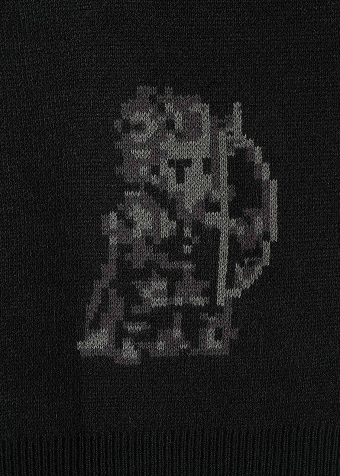 『オクトパストラベラー』より。狩人ハンイットの師匠であるザンターを石化させたモンスター赤目のおどろおどろしい姿をジャカード編みで表現したデザイン。バックの石化したザンターにも注目です。
