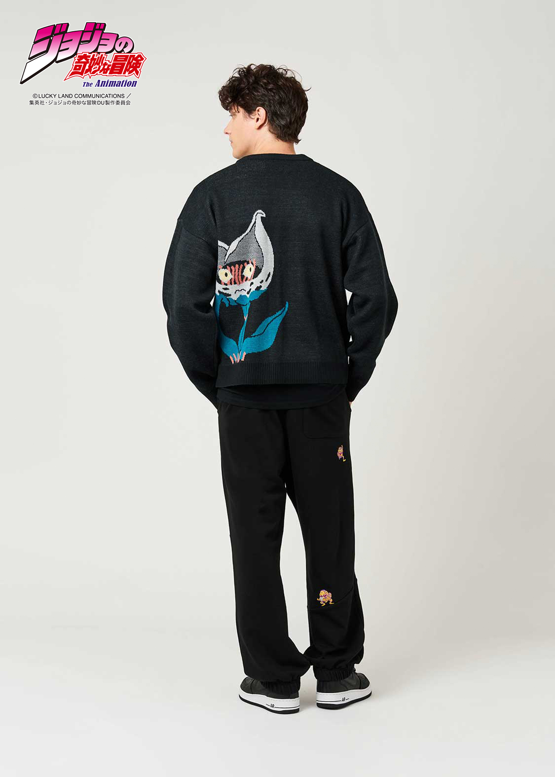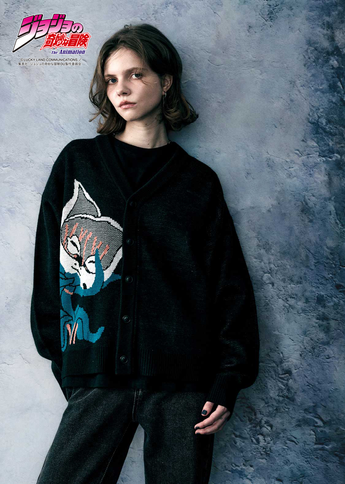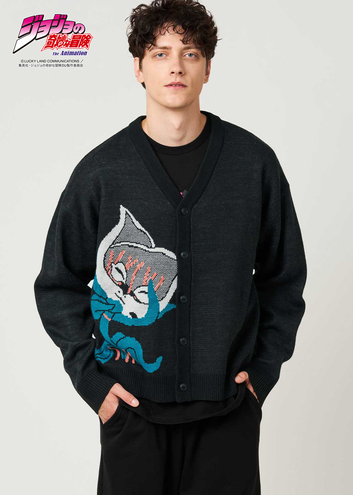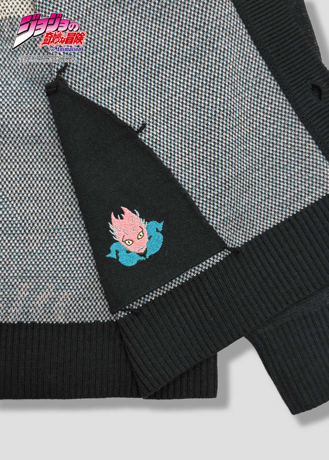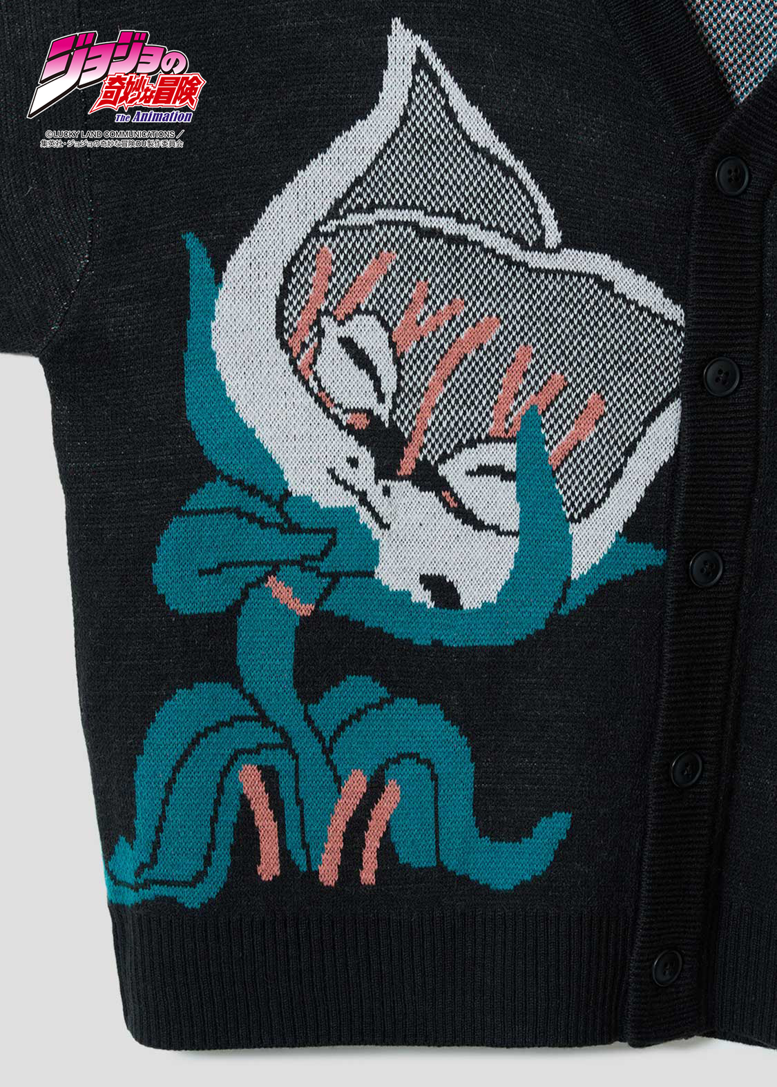 アニメ『ジョジョの奇妙な冒険 ダイヤモンドは砕けない』より。猫草「ストレイ・キャット」の姿をジャカードで表現したデザインです。カーディガンの内側には、成長した「ストレイ・キャット」が刺繍で施されています。