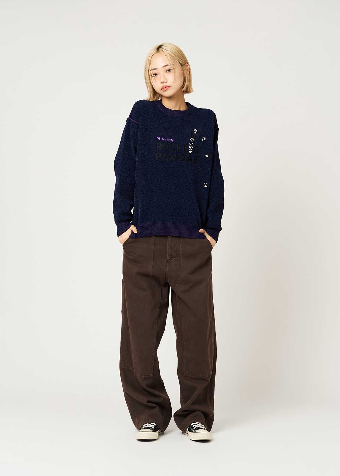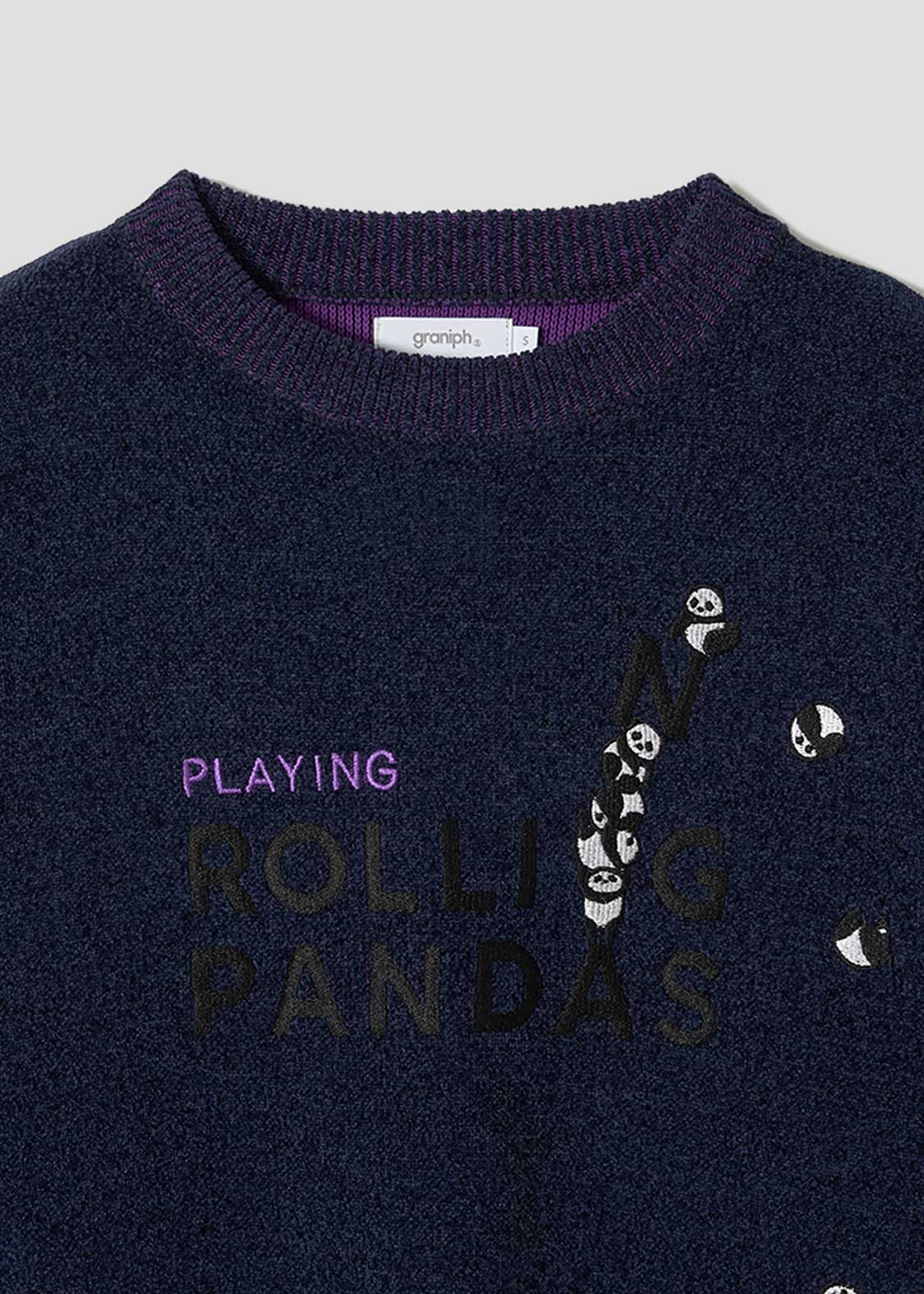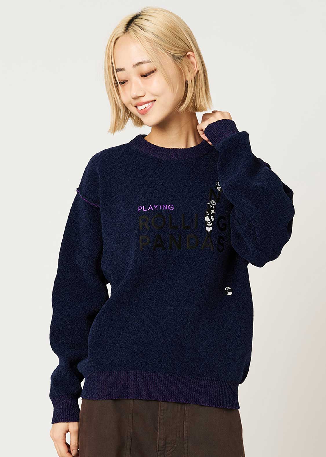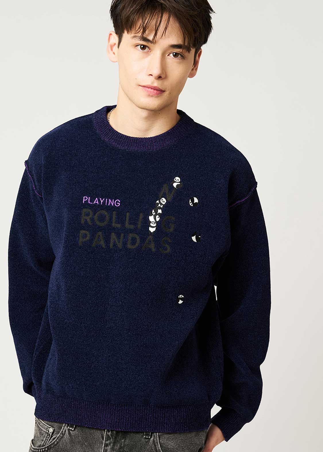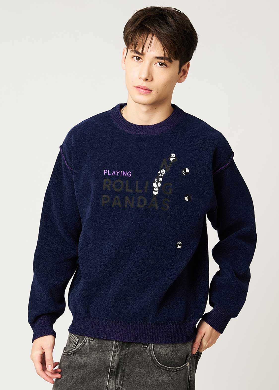 毬のように体を丸めた赤ちゃんパンダが、ころころと転がり落ちていく。その愛らしい姿に思わずほっこり気分になる、キュートなデザインです。
