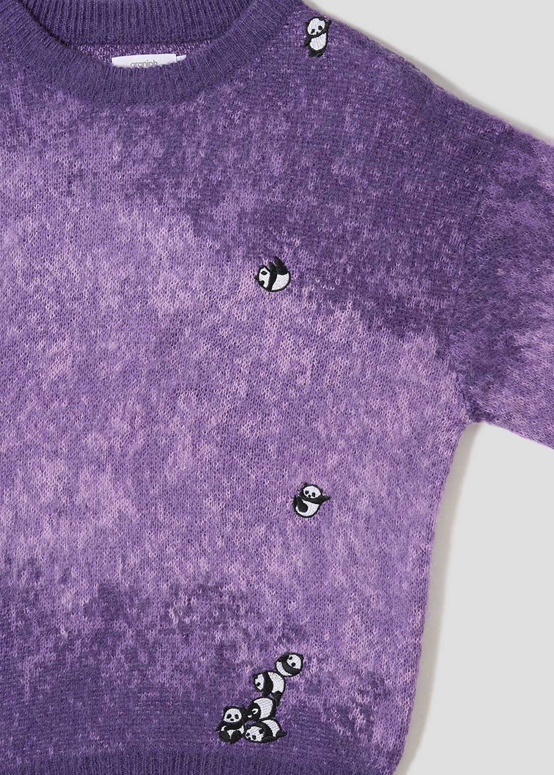 毬のように体を丸めた赤ちゃんパンダが、ころころと転がり落ちていく。その愛らしい姿に思わずほっこり気分になる、キュートなデザインです。