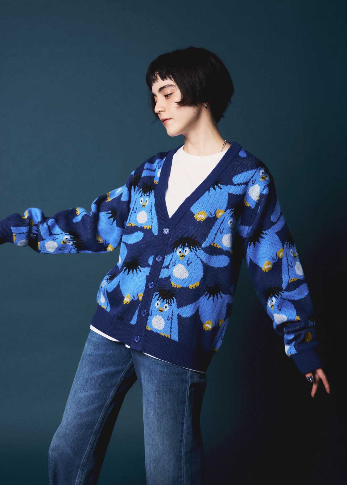 ・ジャカードで柄を表現した、シンプルなVネックのニットカーディガン。