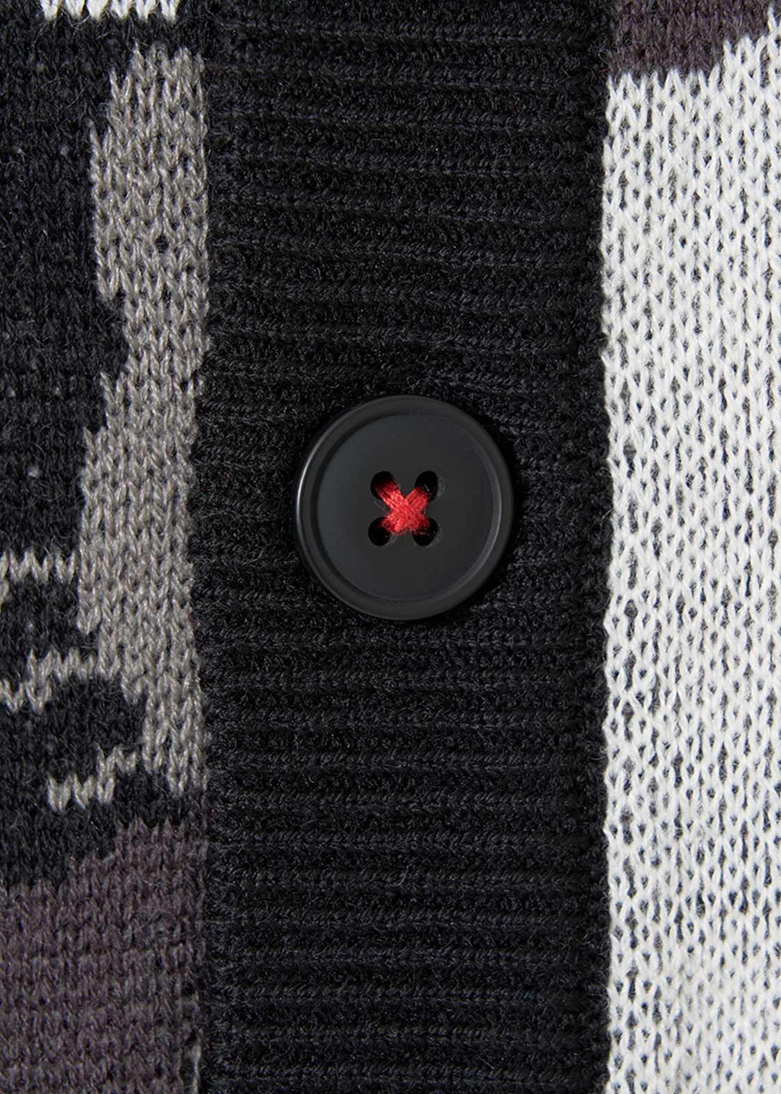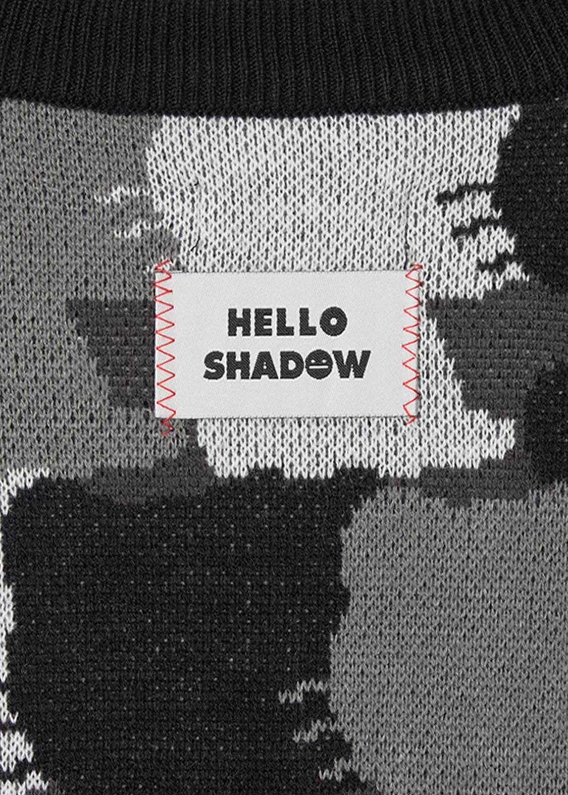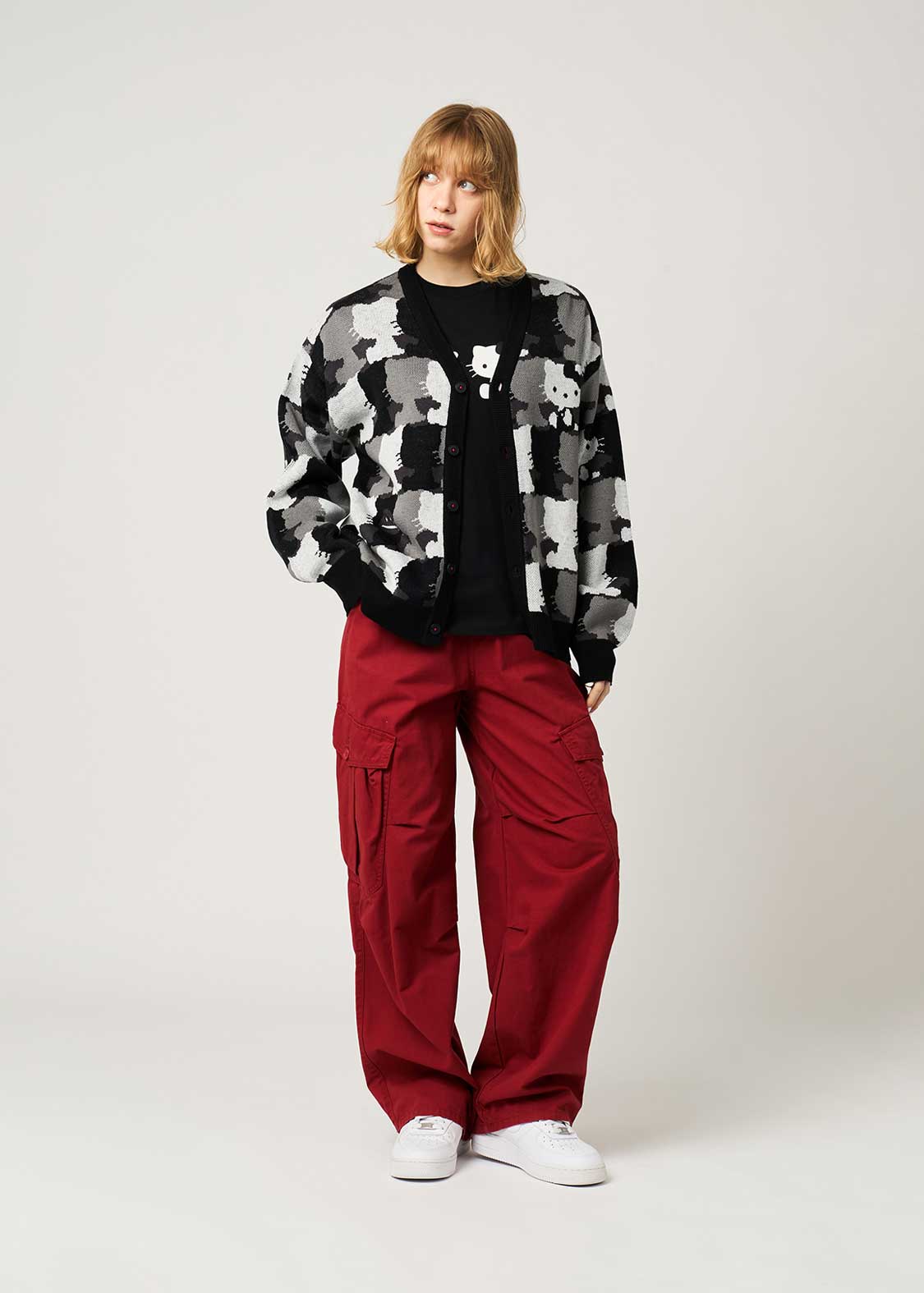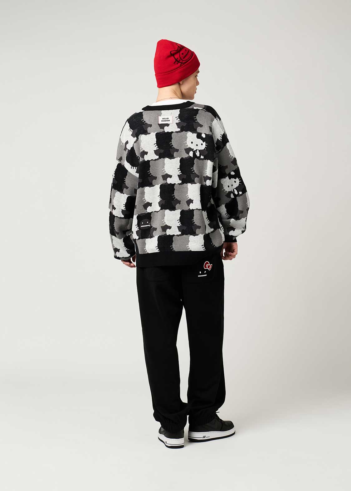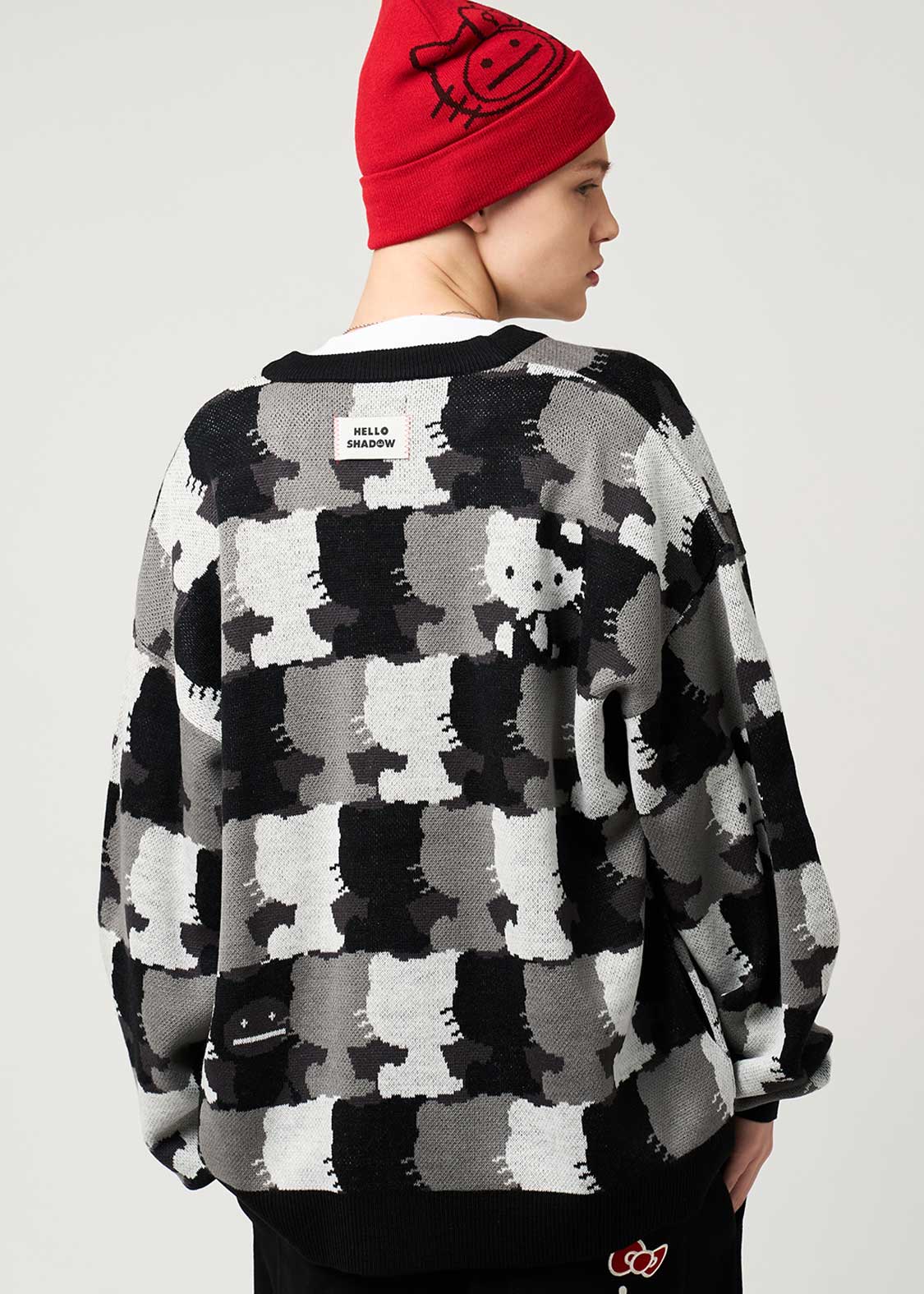 ハローキティのシルエットパターンをジャカード編みで表現したデザイン。首元とボタンの糸の赤がポイントです。お顔のあるハローキティと、ハローキティのきぐるみを着たビューティフルシャドーが紛れているので探してみてね!