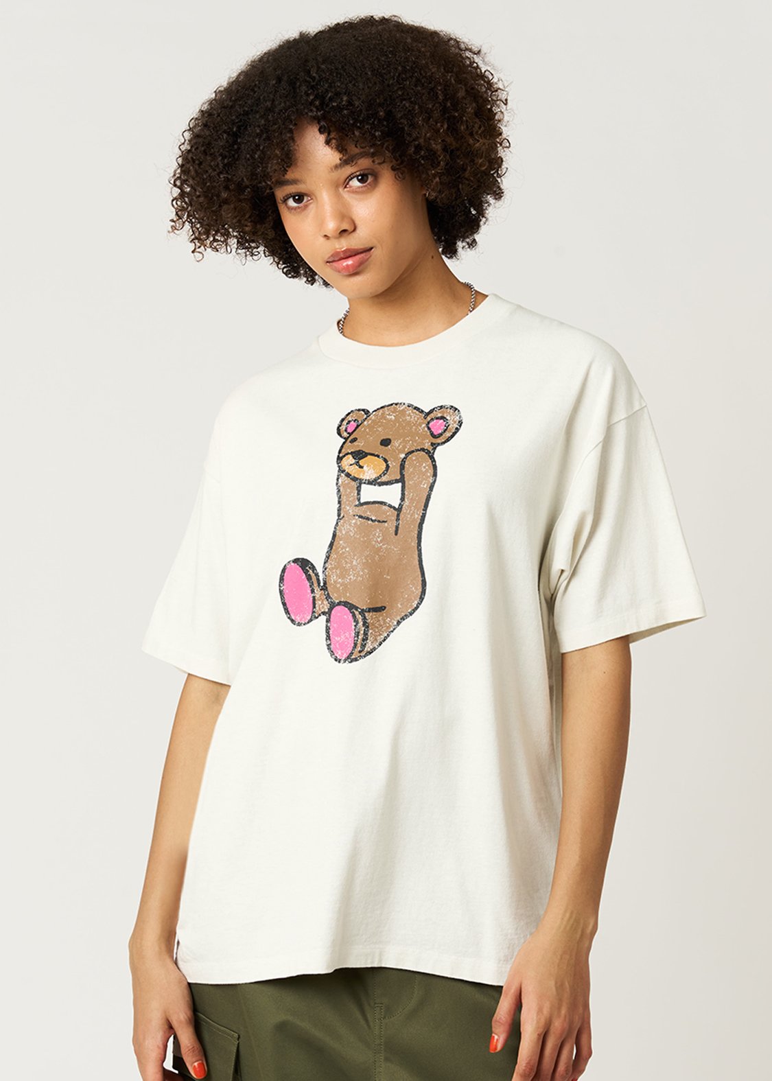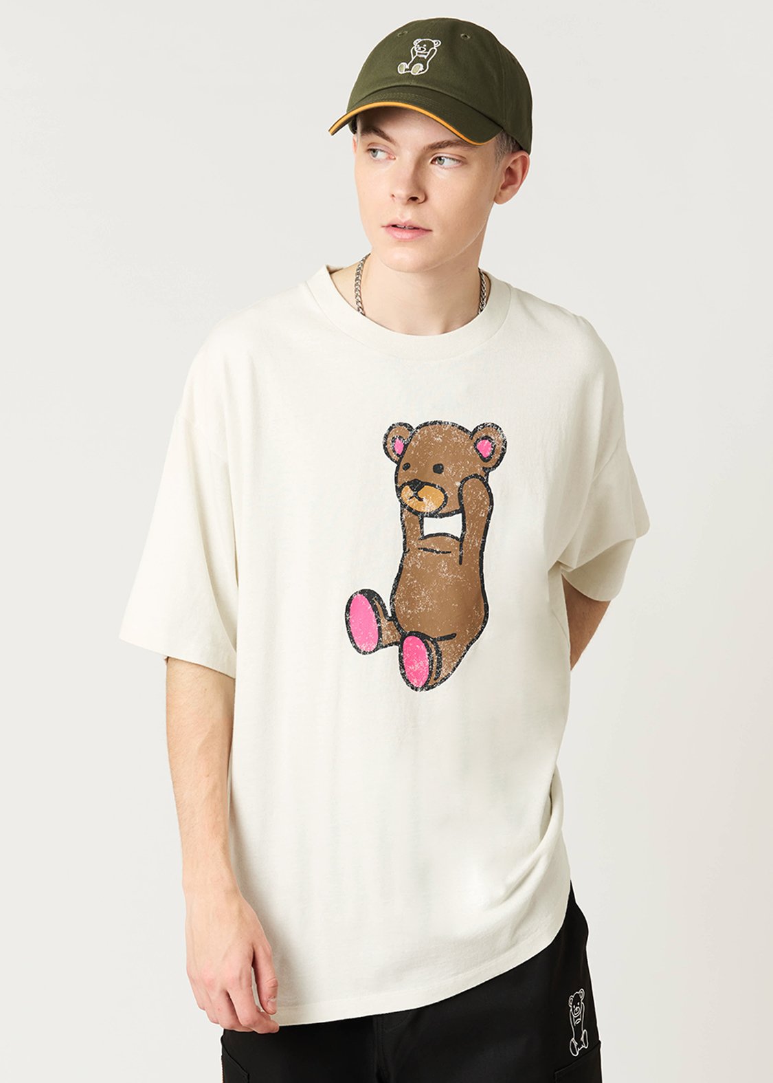 ポン!とばかりに頭をとるファニーなクマくん。ブラックなユーモアとキュートさが混じりあったインパクトのあるキャラクターです。