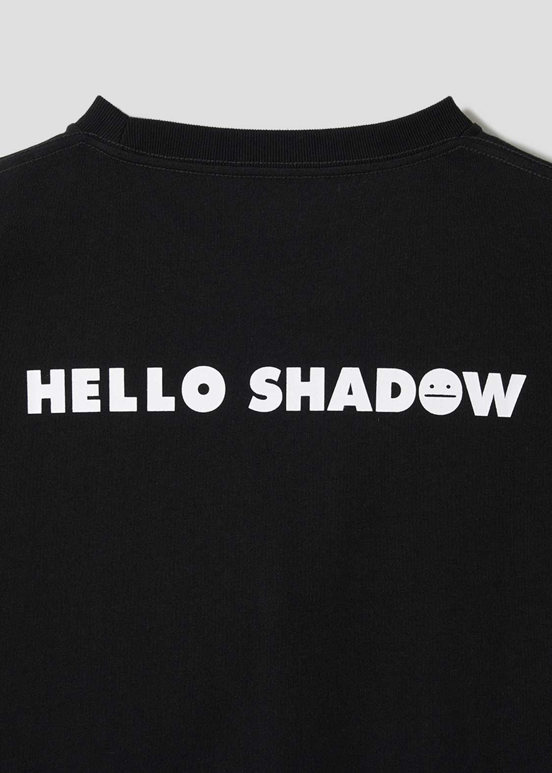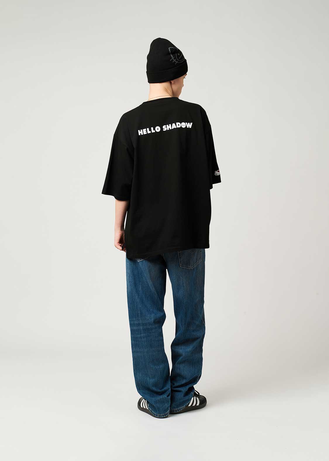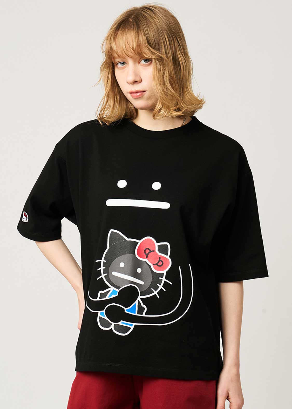 自分自身が憧れのハローキティの格好をしたぬいぐるみを抱えるビューティフルシャドー。HELLO SHADOWの文字がプリントされたバックにもご注目。右袖にあしらわれた刺繍ワッペンのハローキティがポイントです。手作りのぬいぐるみを抱くシャドーが微笑ましいデザインです。