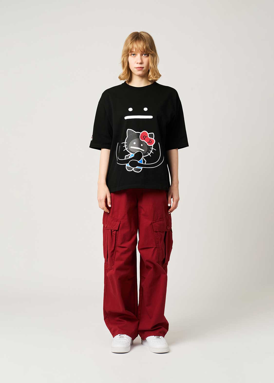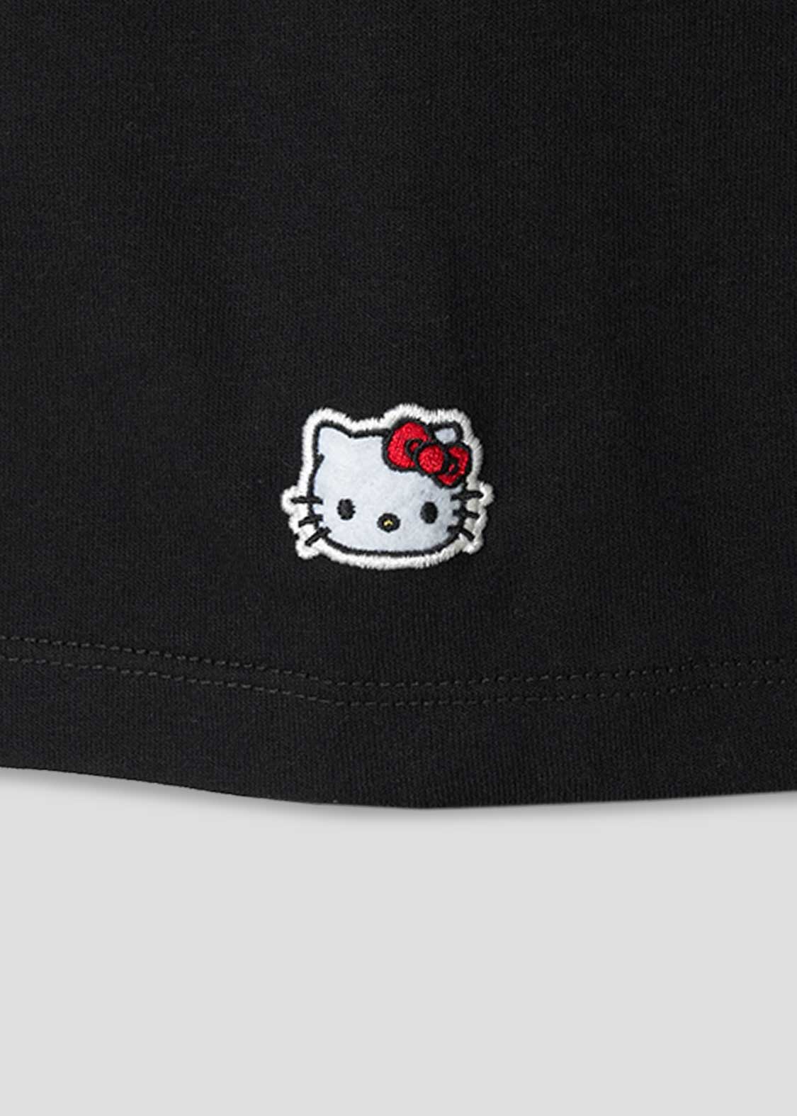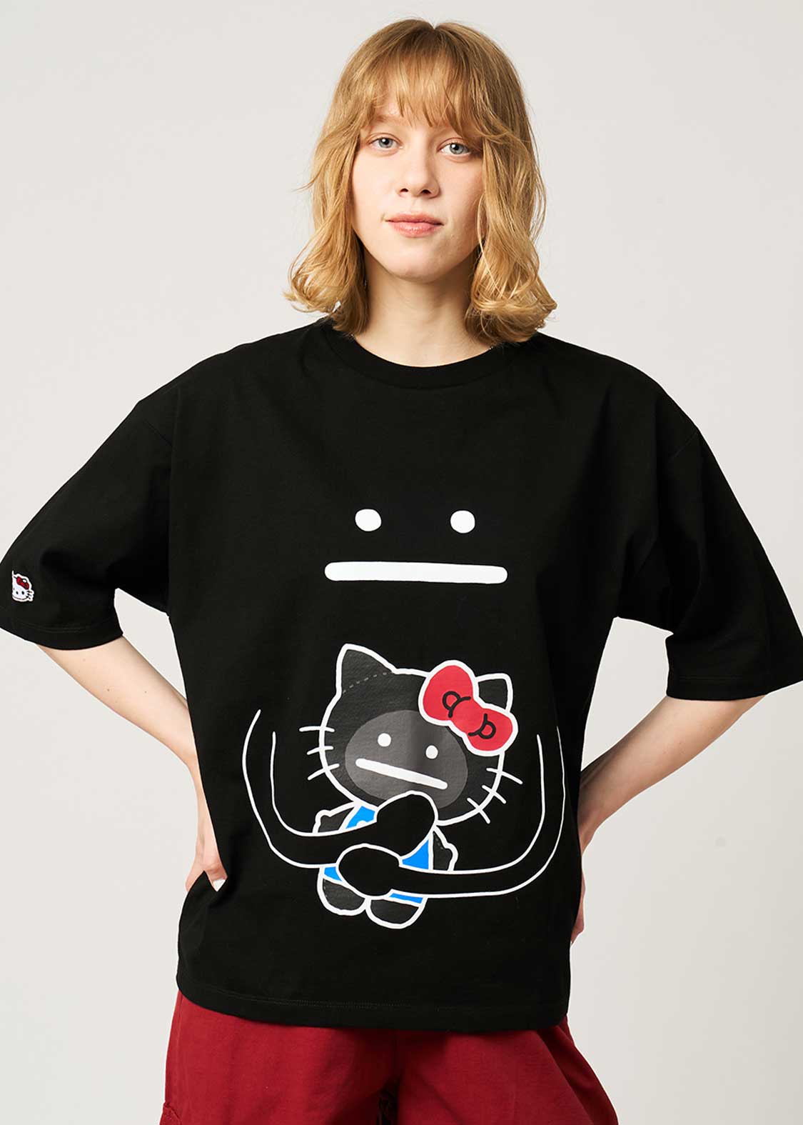 自分自身が憧れのハローキティの格好をしたぬいぐるみを抱えるビューティフルシャドー。HELLO SHADOWの文字がプリントされたバックにもご注目。右袖にあしらわれた刺繍ワッペンのハローキティがポイントです。手作りのぬいぐるみを抱くシャドーが微笑ましいデザインです。