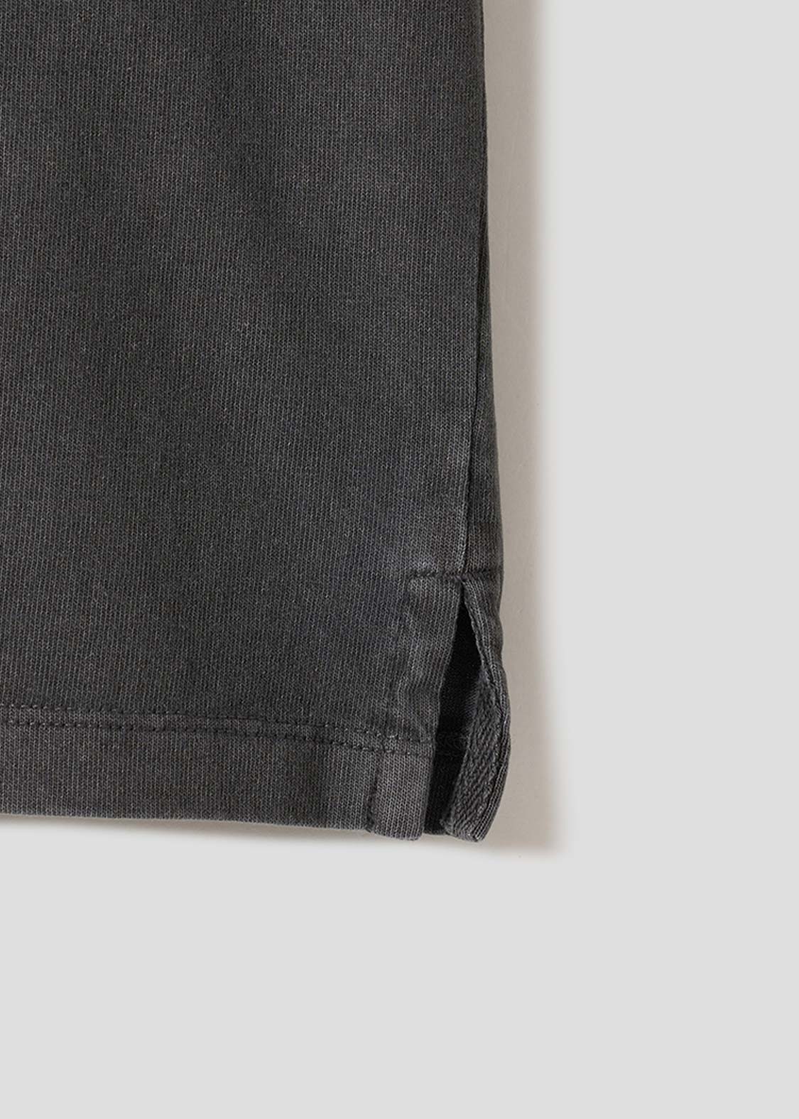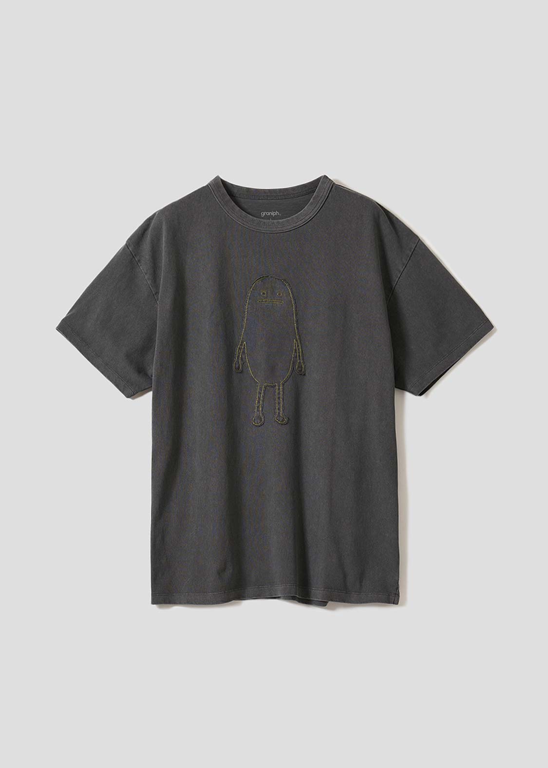 ・断ち切りの生地に配色ステッチを重ね、ピグメント加工を施した表情が古着を手に取ったときのような落ち着いた空気をつくります。