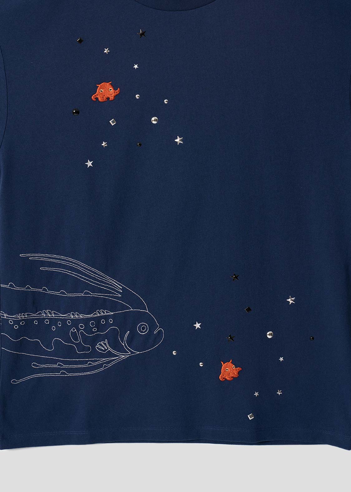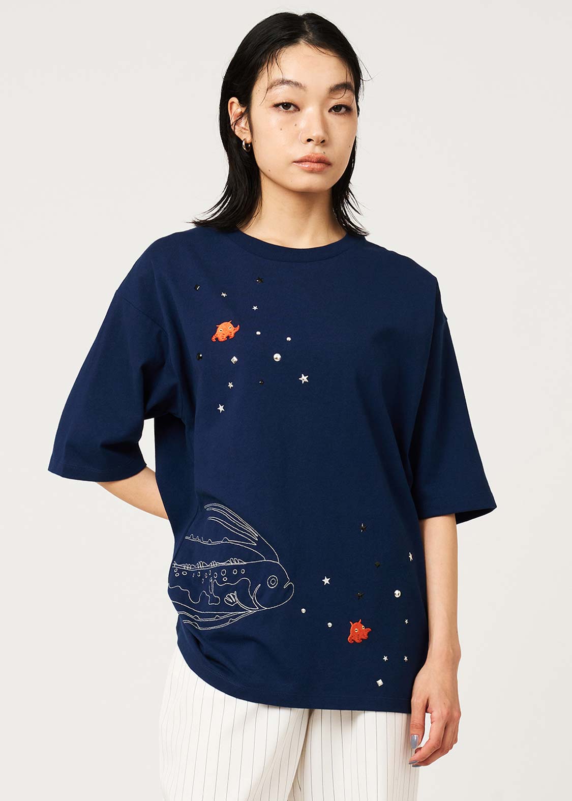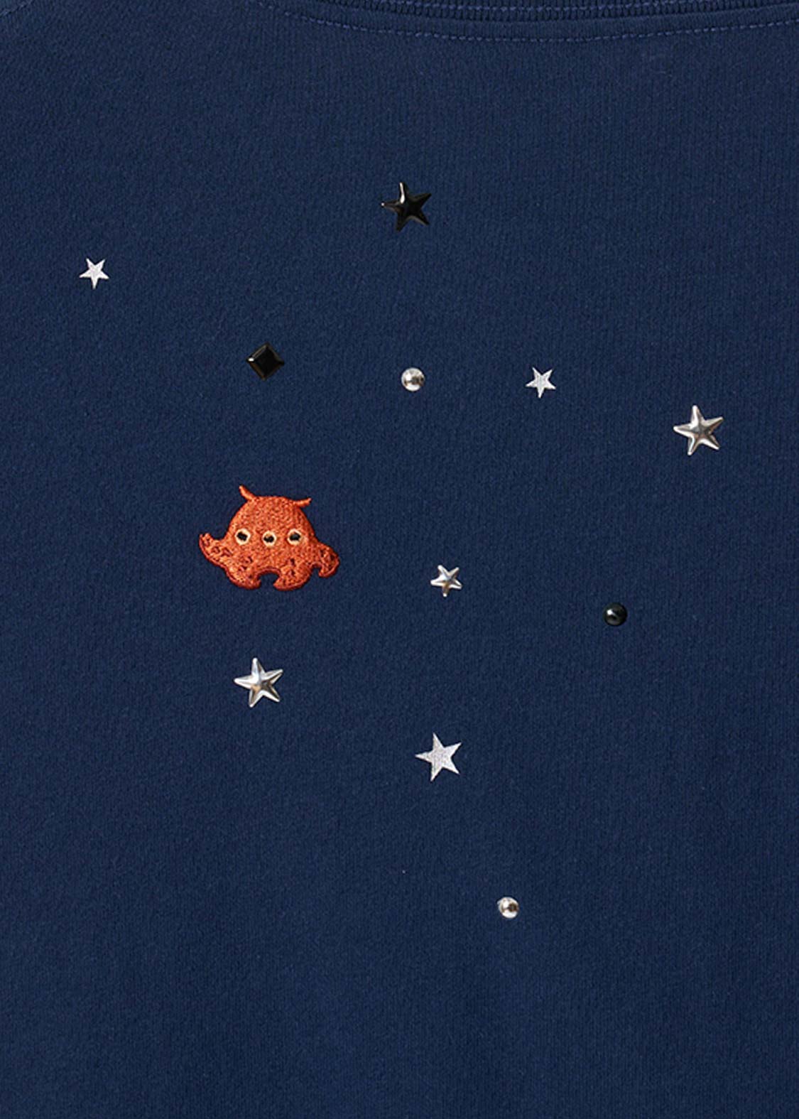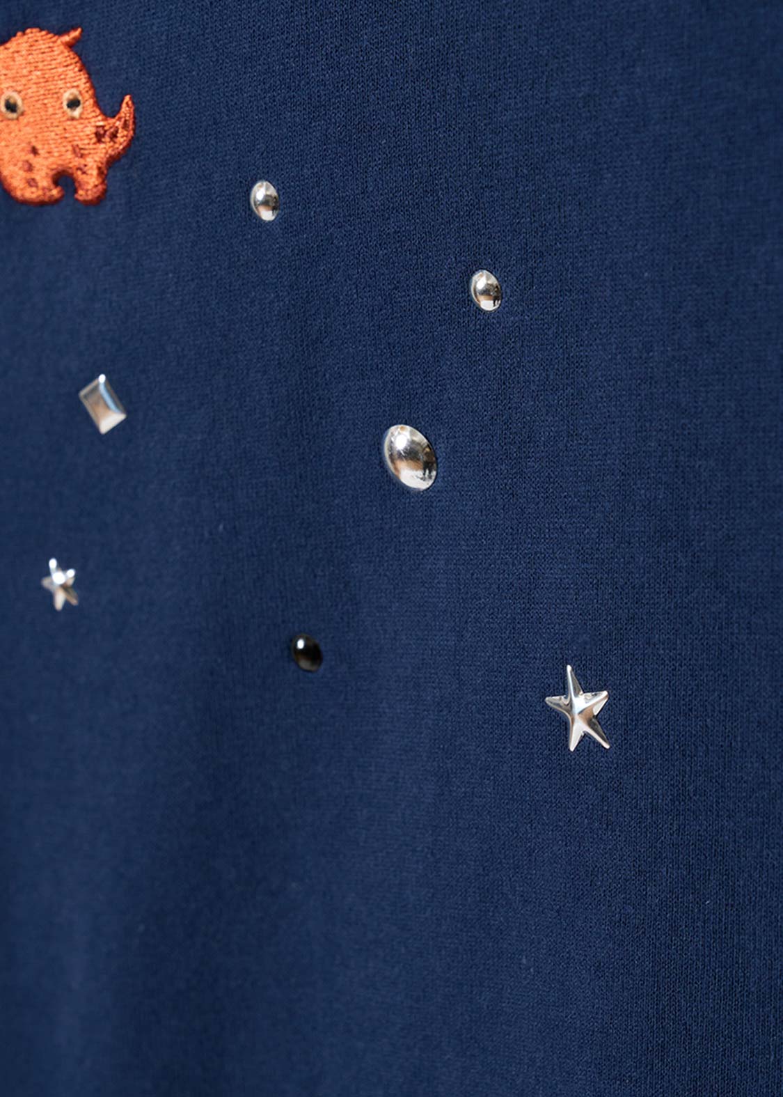 ・ホットフィックスと呼ばれる熱で圧着した小さなメタルチップを散りばめた、アクセントが効いたデザインです。