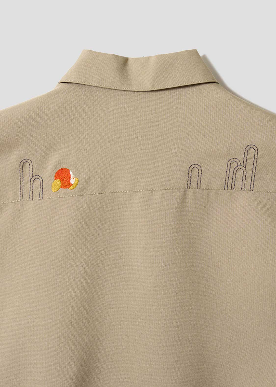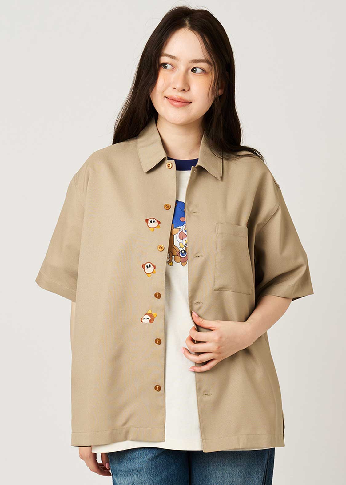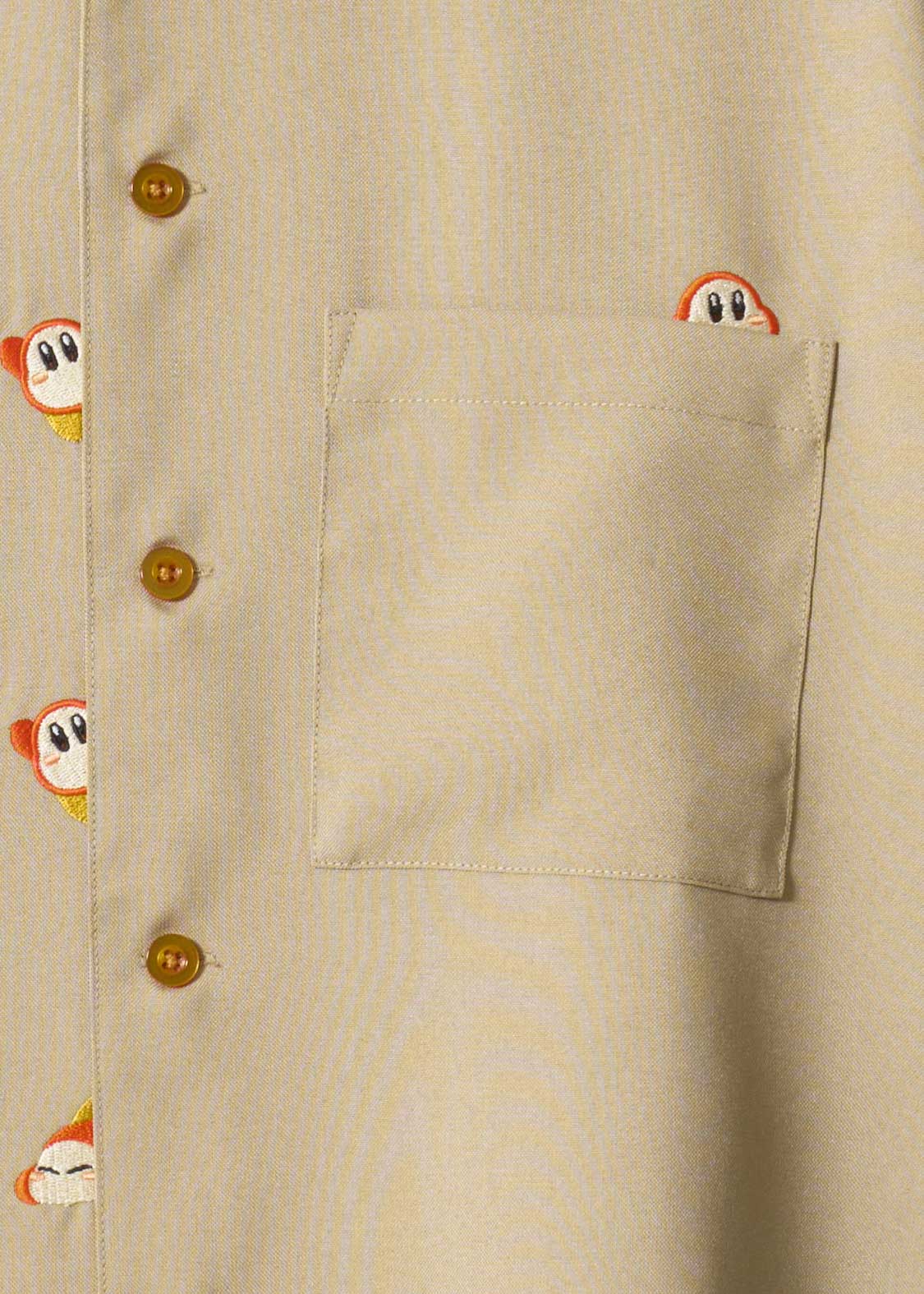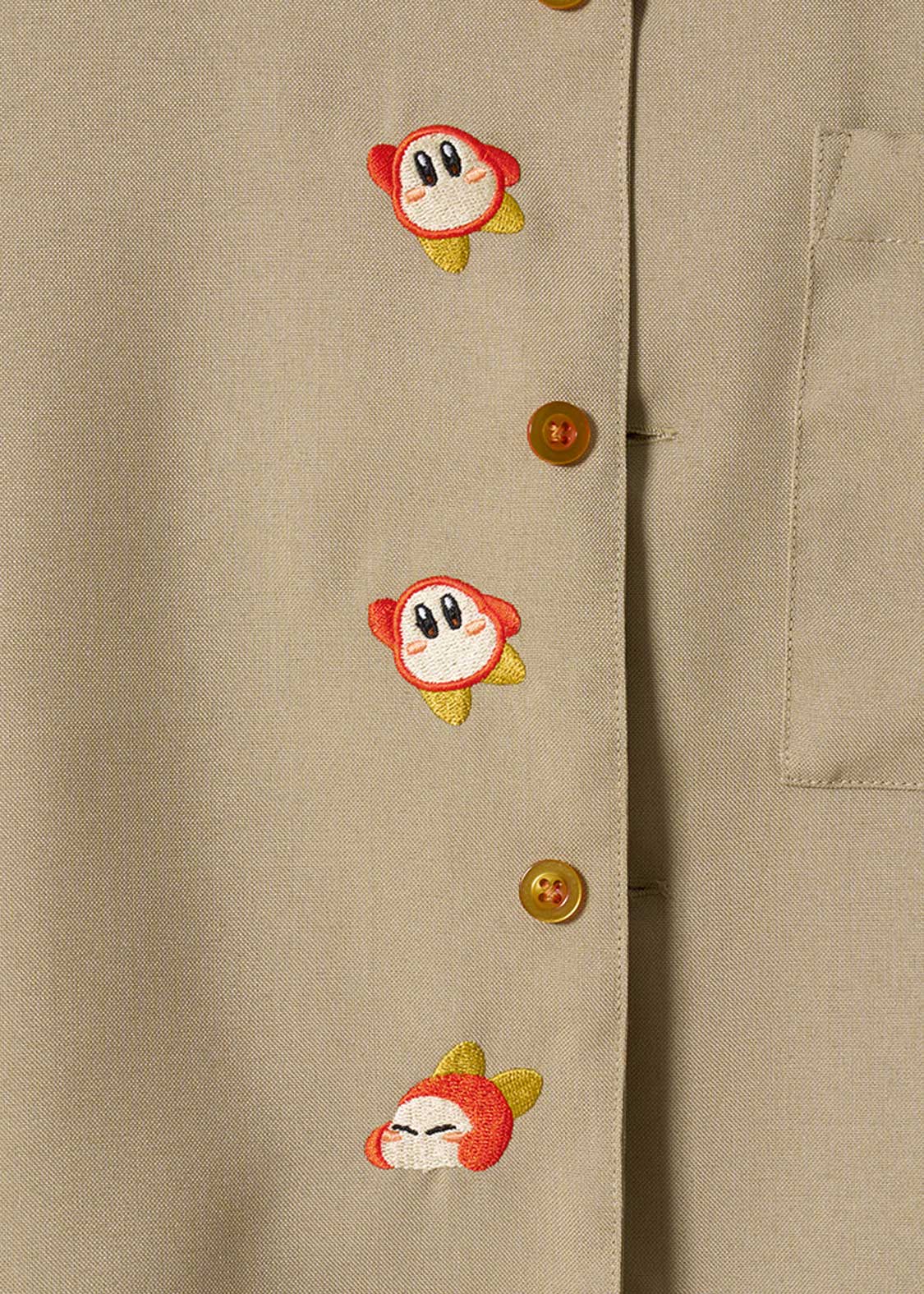 カービィの前にあらわれるザコ中のザコ、ワドルディにフィーチャーしたデザイン。ボタンの合わせ部分には、手を上げたり転ぶ姿が刺繍されています。ポケットから顔を出す様子もとってもキュート!坂に見立てた生地の切り替えを歩く姿が刺繍されたバックにも注目です。