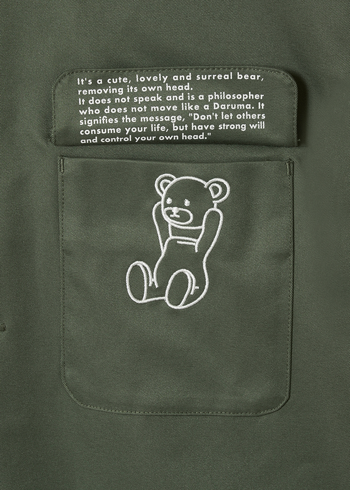 ・胸ポケットのフラップの裏にはコントロールベアのコンセプトメッセージをプリントしています。