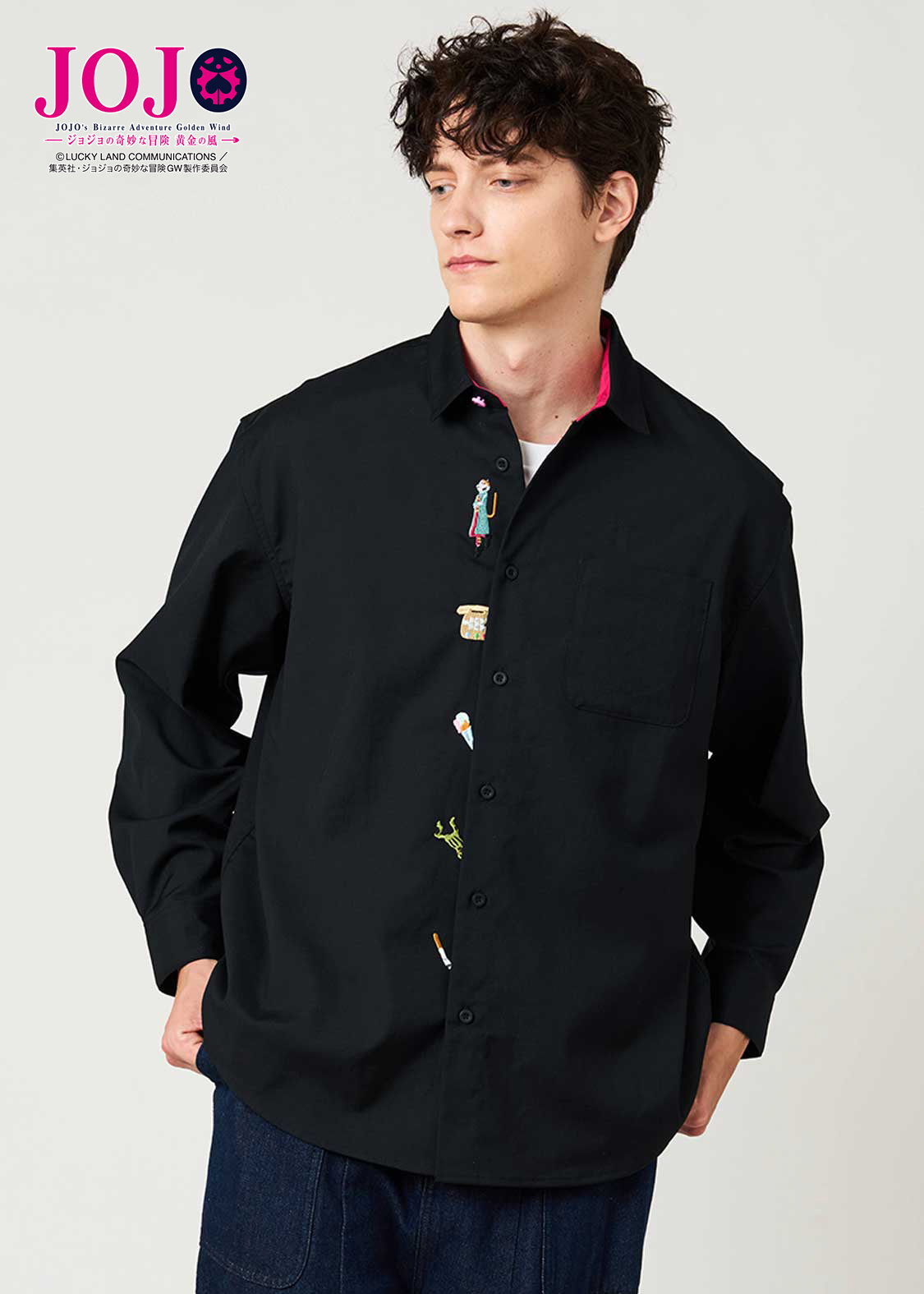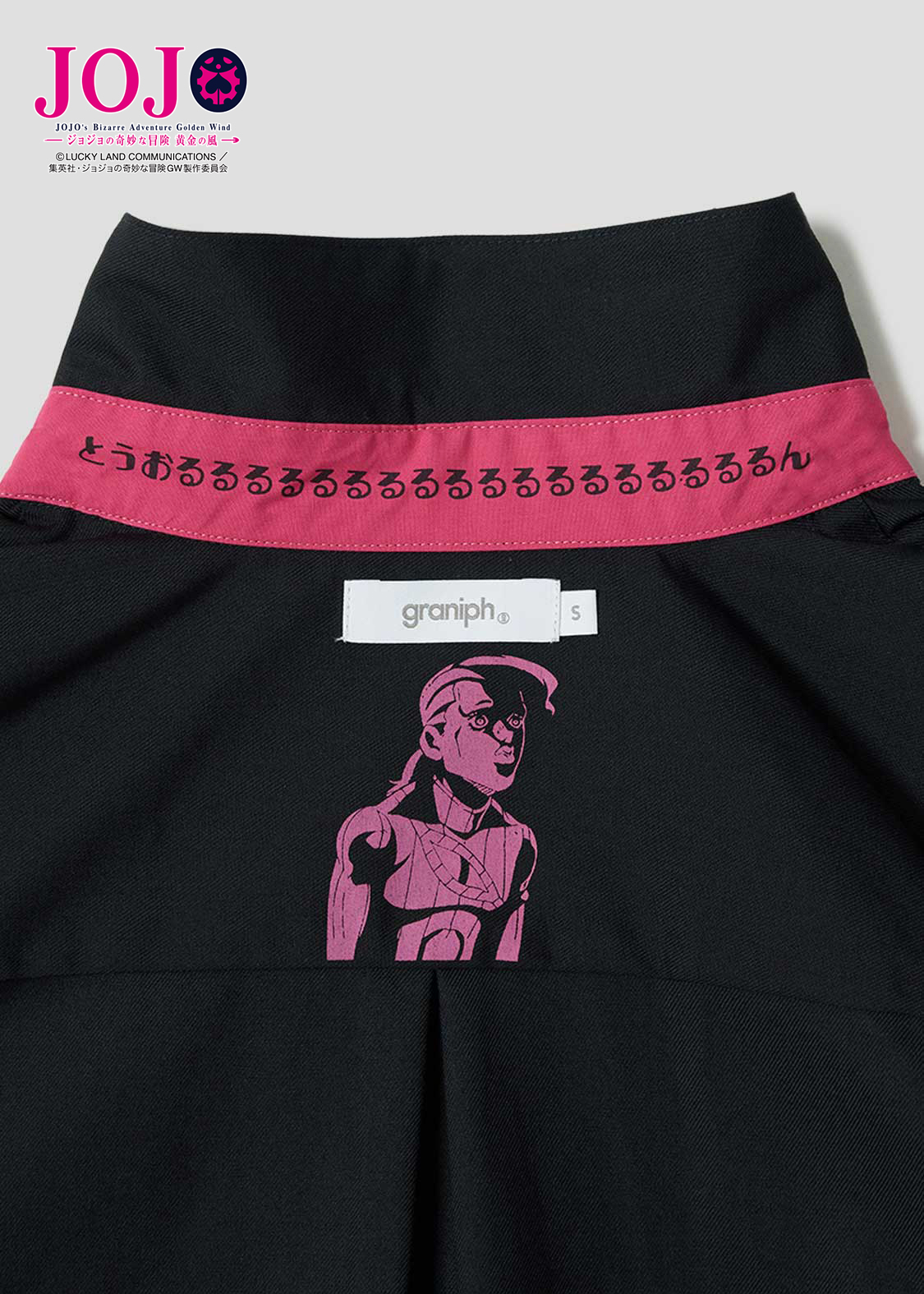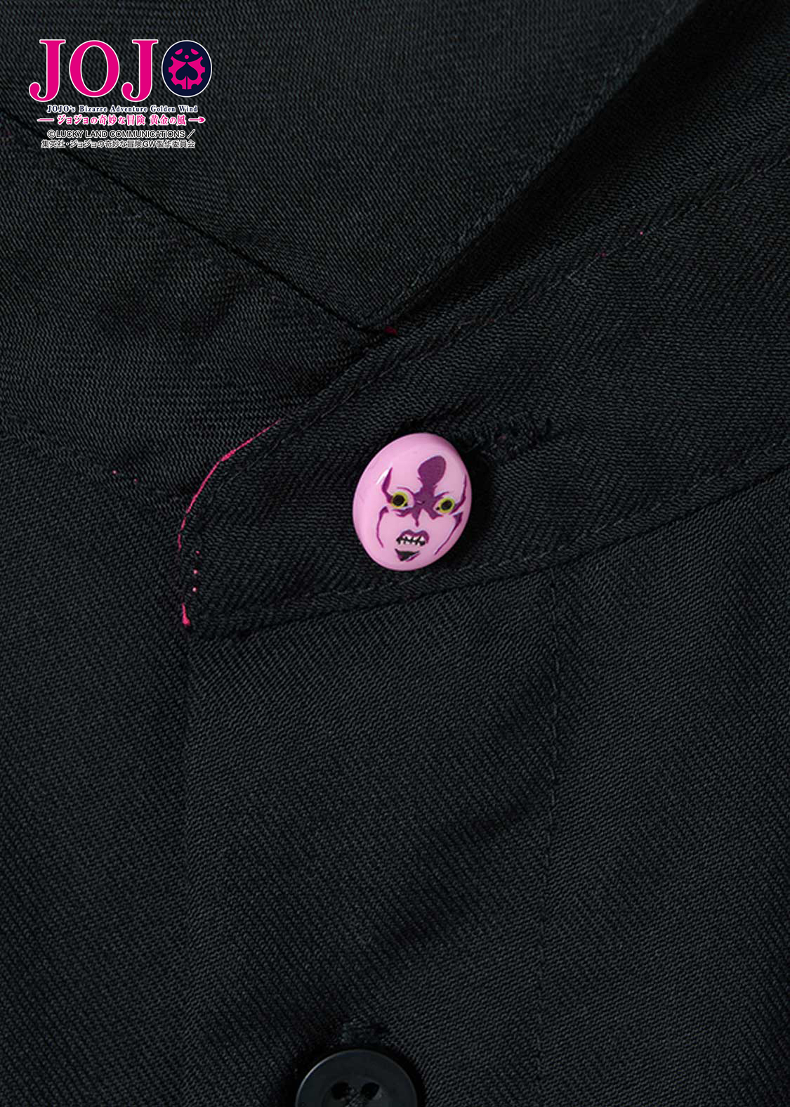 アニメ『ジョジョの奇妙な冒険 黄金の風』より。ギャング組織「パッショーネ」のボスの部下だと思い込んでいる青年・ドッピオをモチーフにしたデザイン。前たてには、彼が電話として使うぬいぐるみやカエルなどを刺繍で表現しました。内側には、ドッピオの姿と「とうおるるる・・」という着信音をプリントしたユニークな仕上がりです。第一ボタンにもご注目ください。