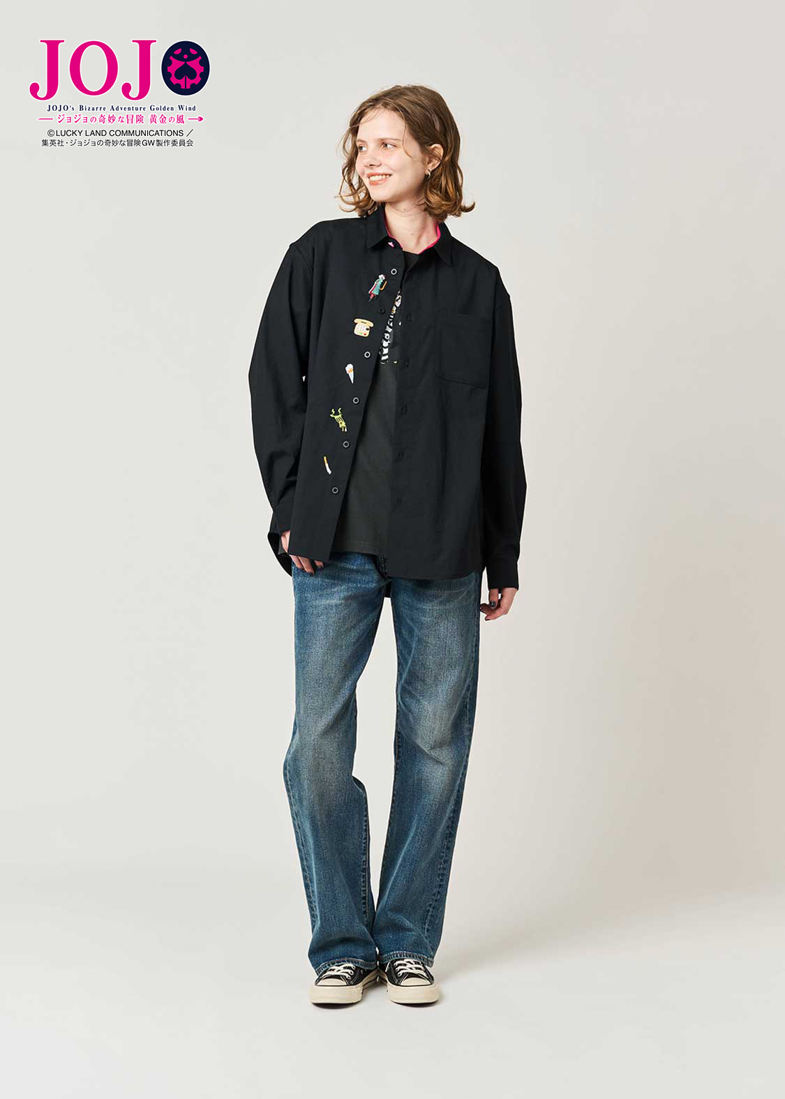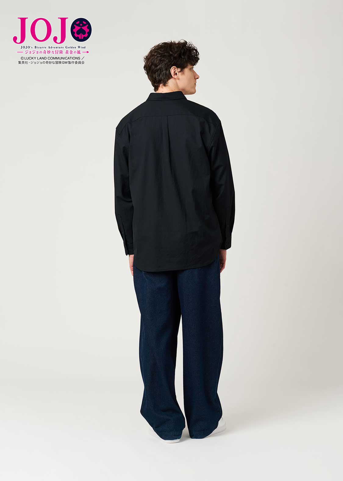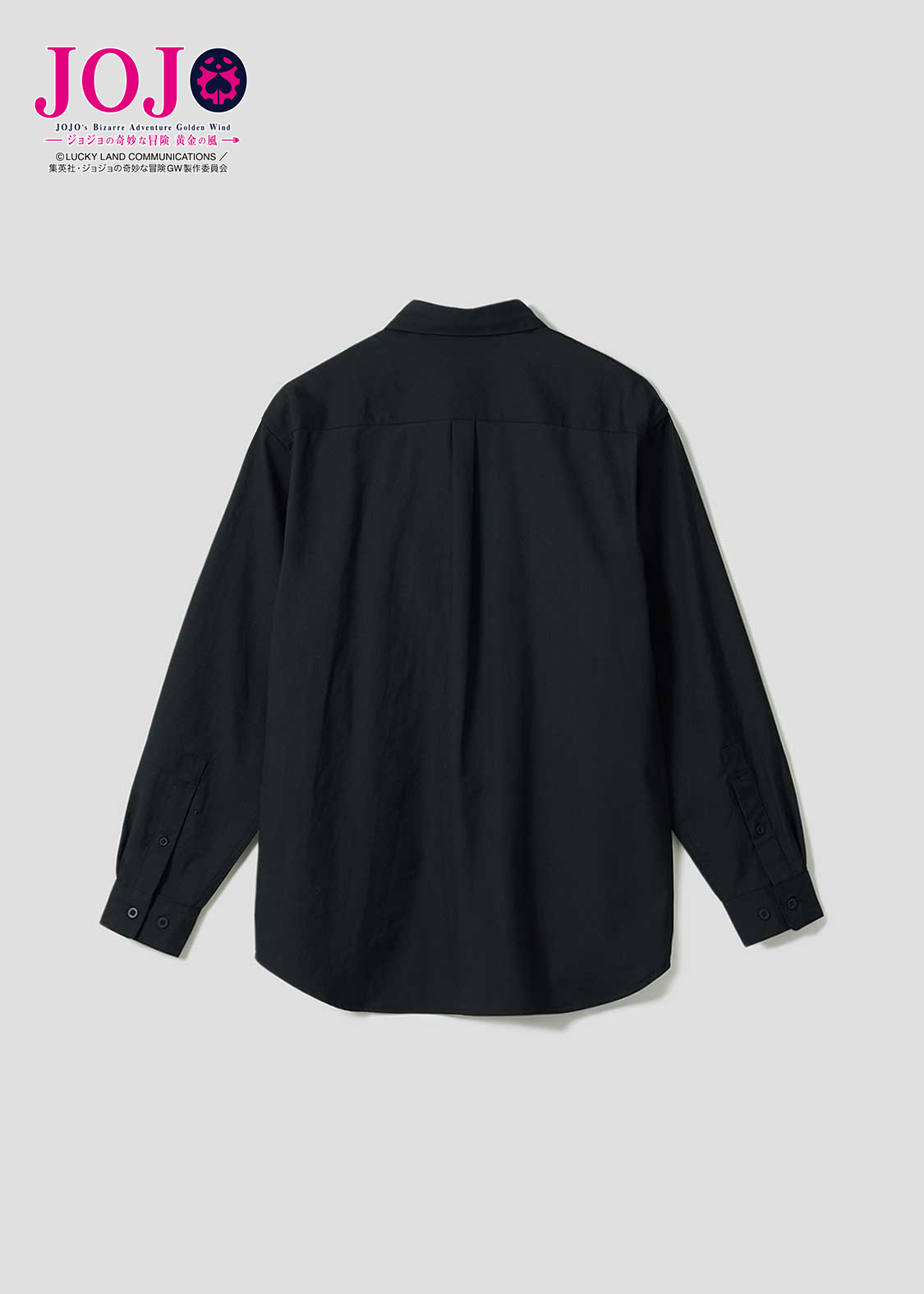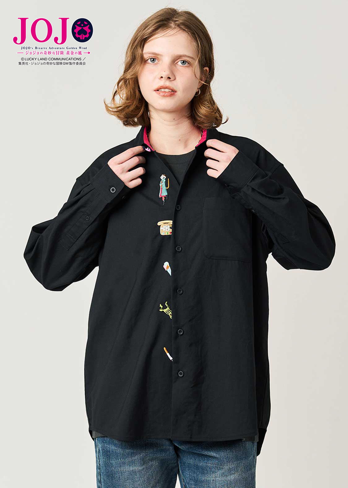 アニメ『ジョジョの奇妙な冒険 黄金の風』より。ギャング組織「パッショーネ」のボスの部下だと思い込んでいる青年・ドッピオをモチーフにしたデザイン。前たてには、彼が電話として使うぬいぐるみやカエルなどを刺繍で表現しました。内側には、ドッピオの姿と「とうおるるる・・」という着信音をプリントしたユニークな仕上がりです。第一ボタンにもご注目ください。