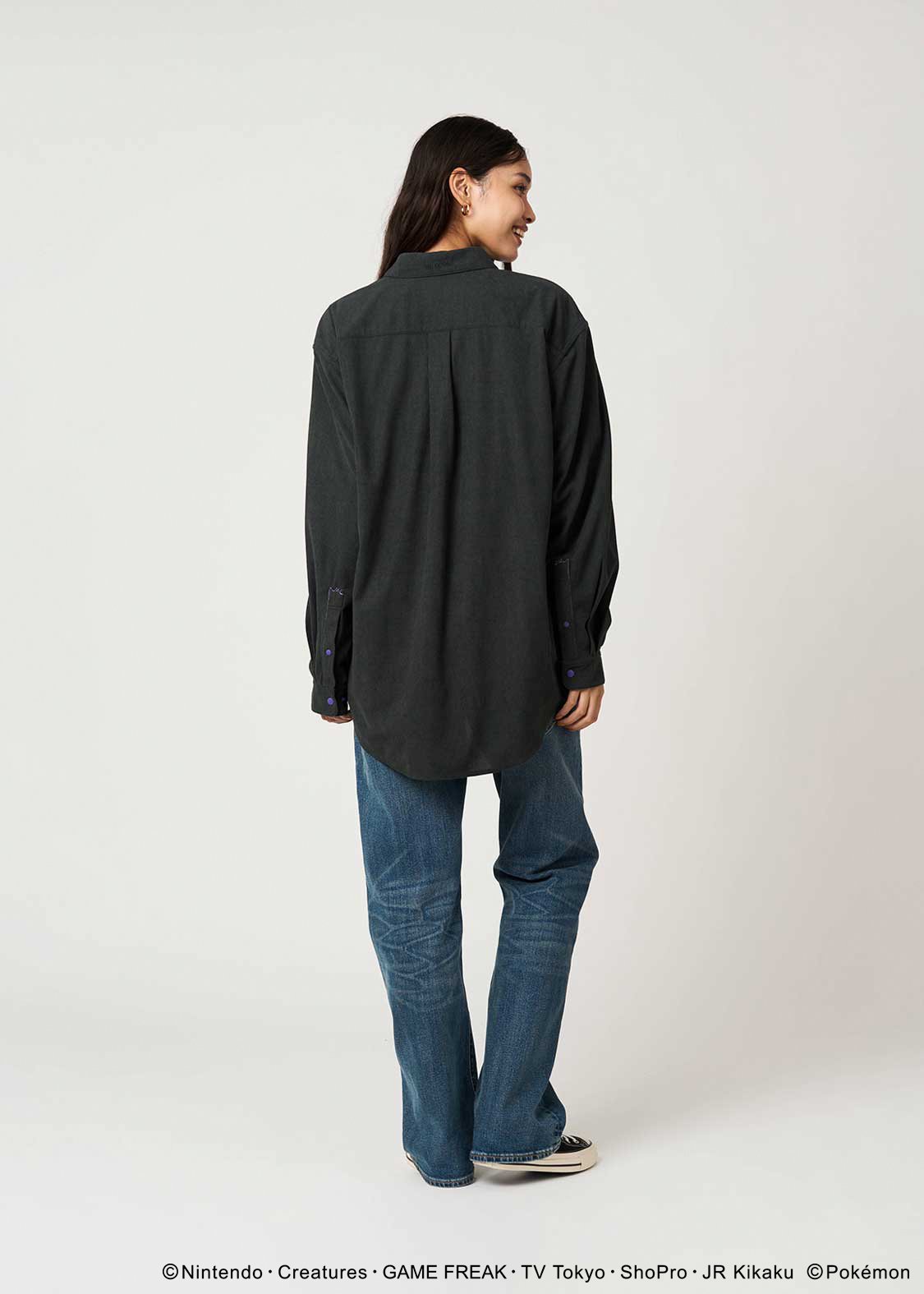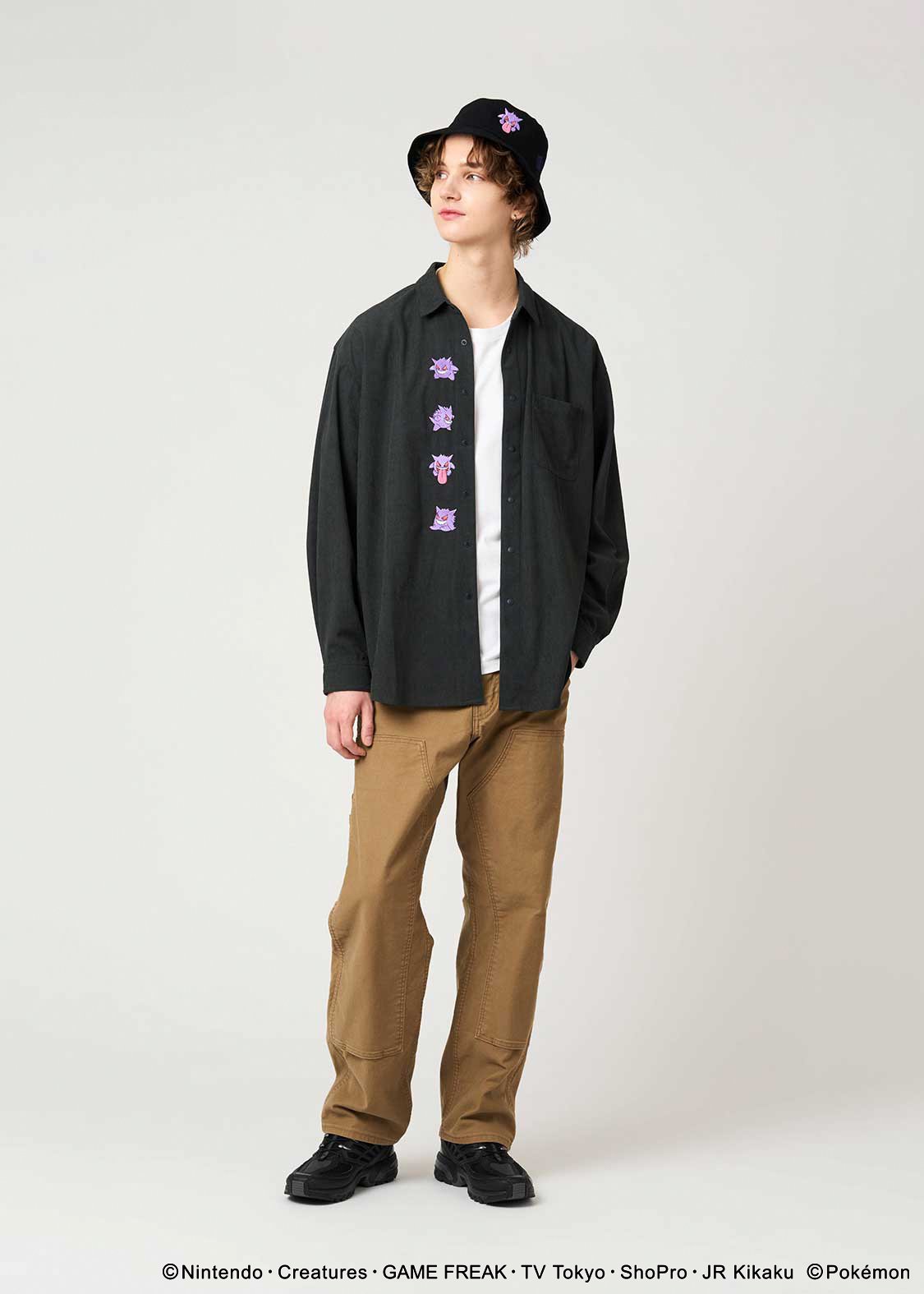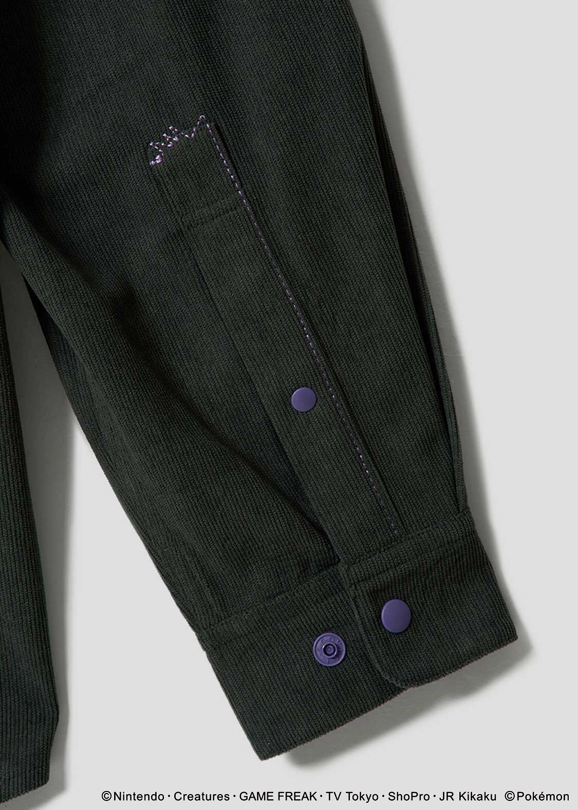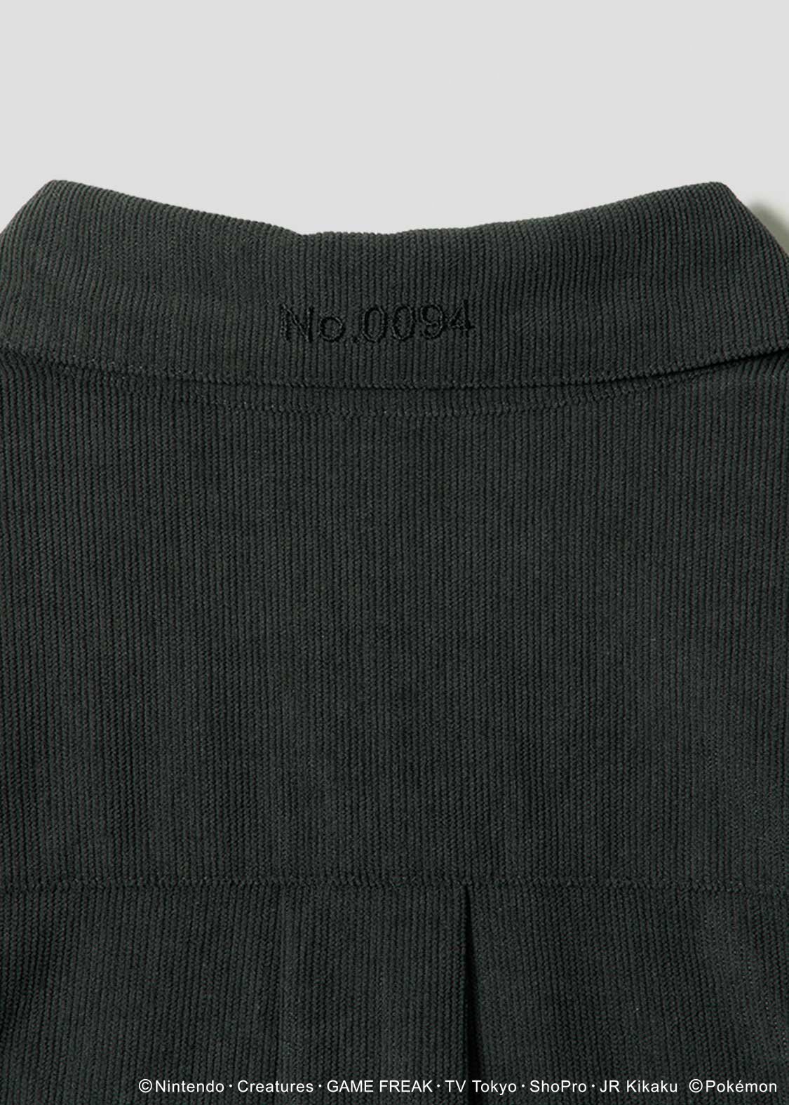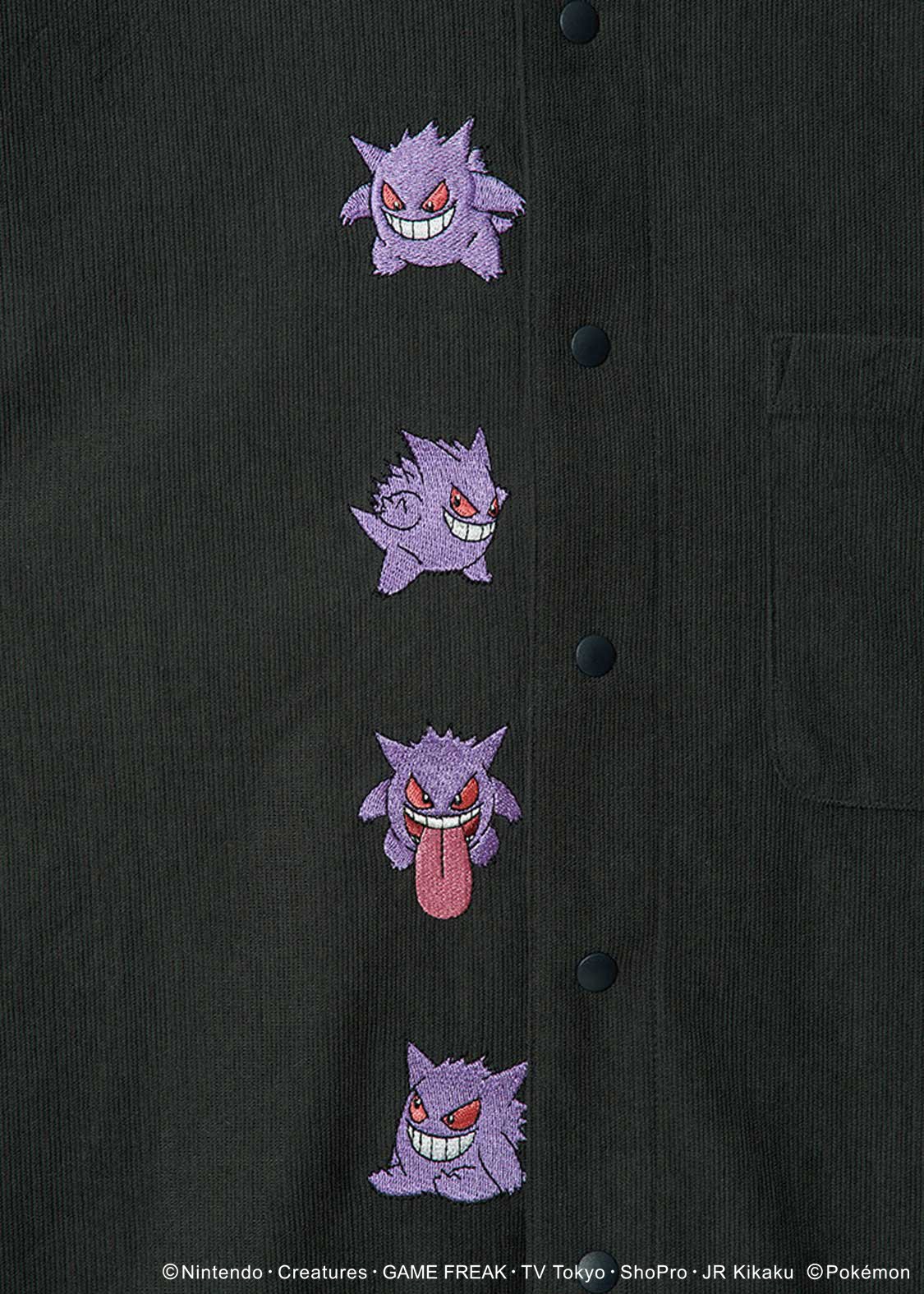 舌を出したりペタンと座ったりゲンガーの色々な姿を刺繍したデザイン。後ろの襟には図鑑番号のNo.0094が刺繍されています。両袖元のゲンガーをイメージしたステッチ刺繍にも注目です。