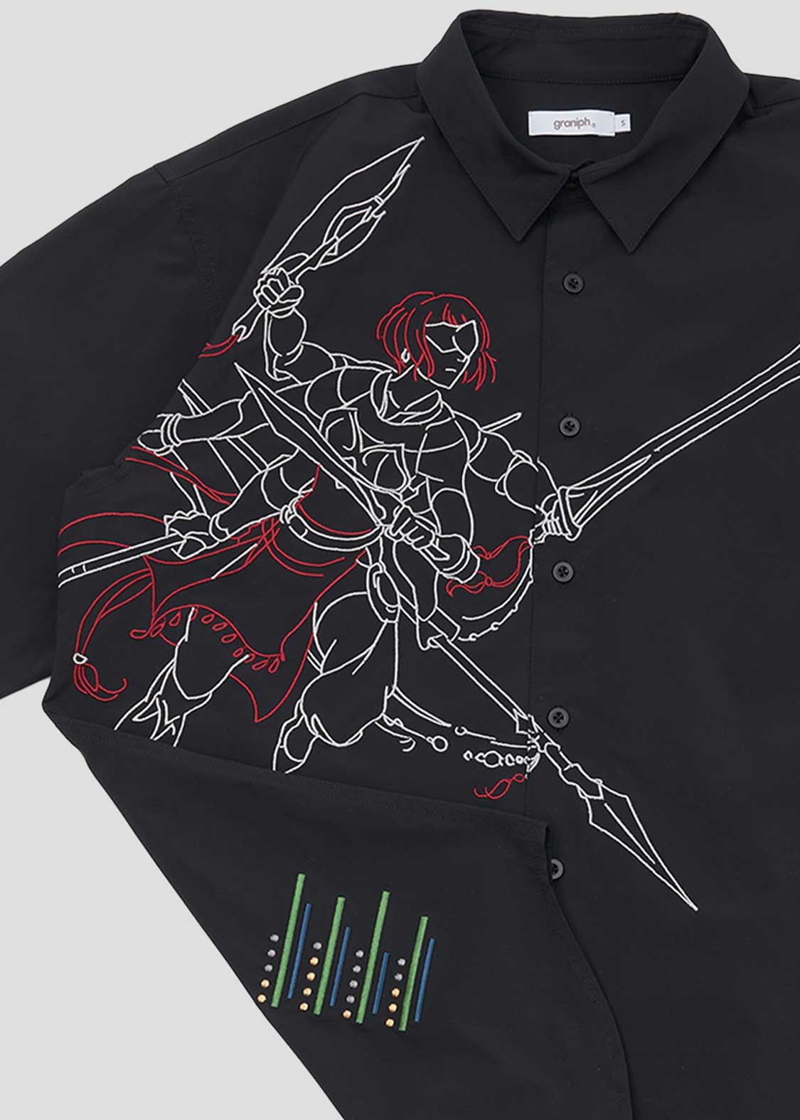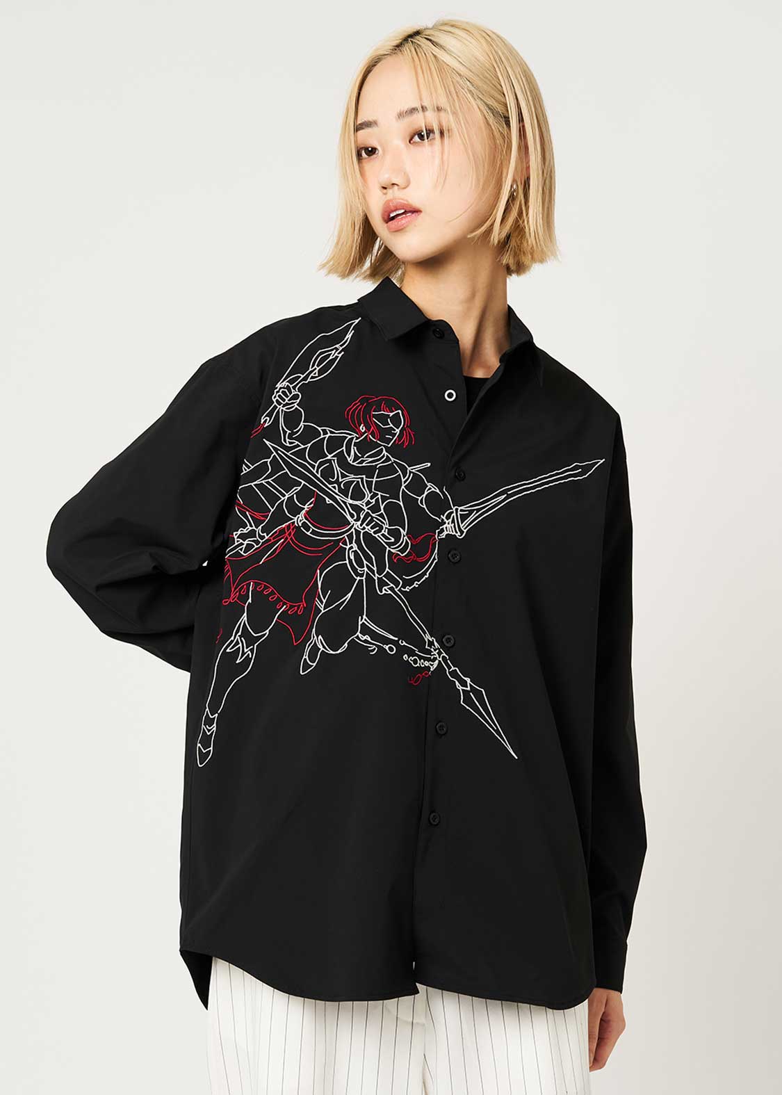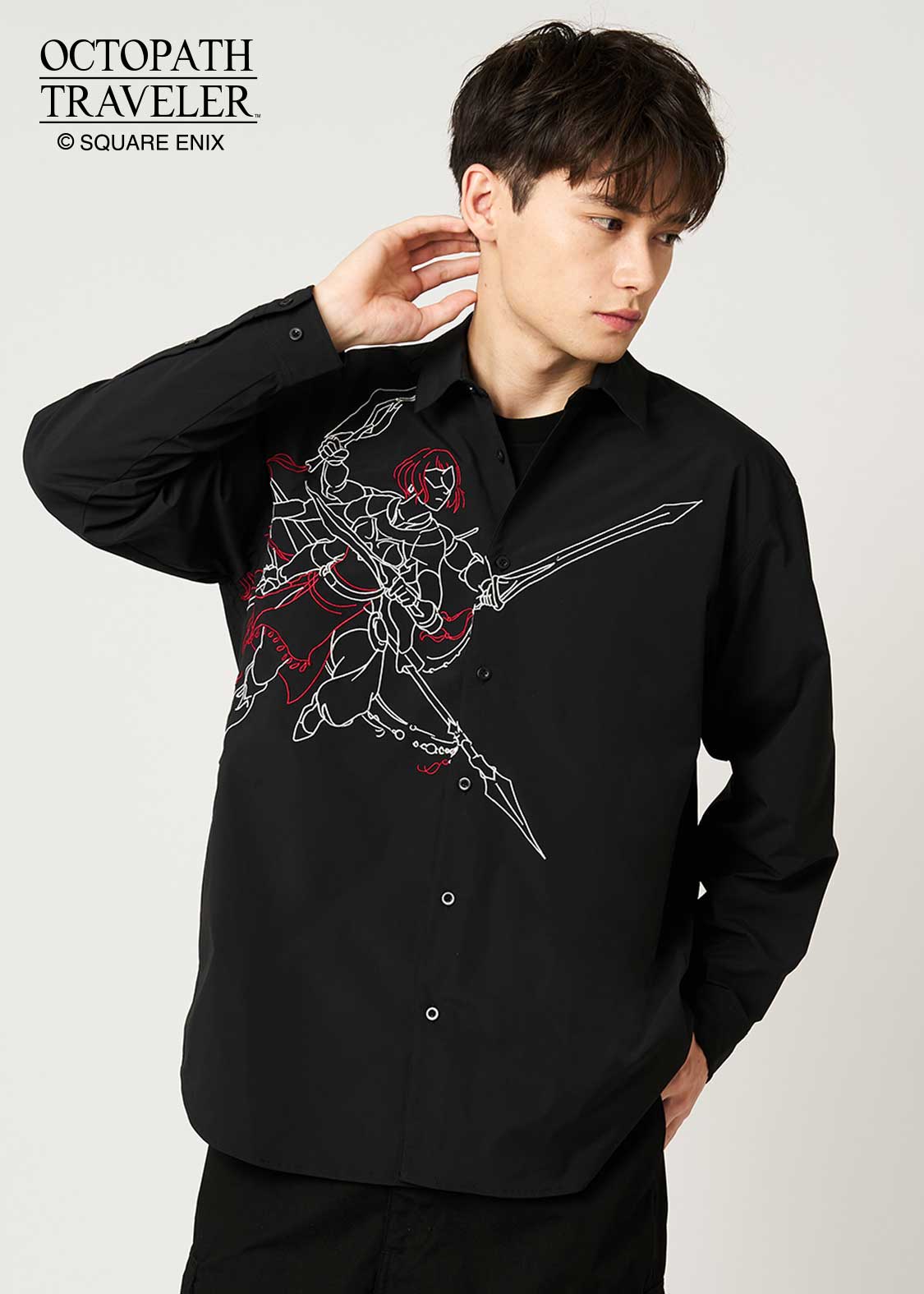 『オクトパストラベラー』より。豪武匠ウィンヒルドとのバトルをイメージしたデザイン。フロントはウィンヒルド、バックはパーティーメンバーのステータスを刺繍しました。これを着ればあなたも様々な武器が使えるようになる、かもしれない1着です。