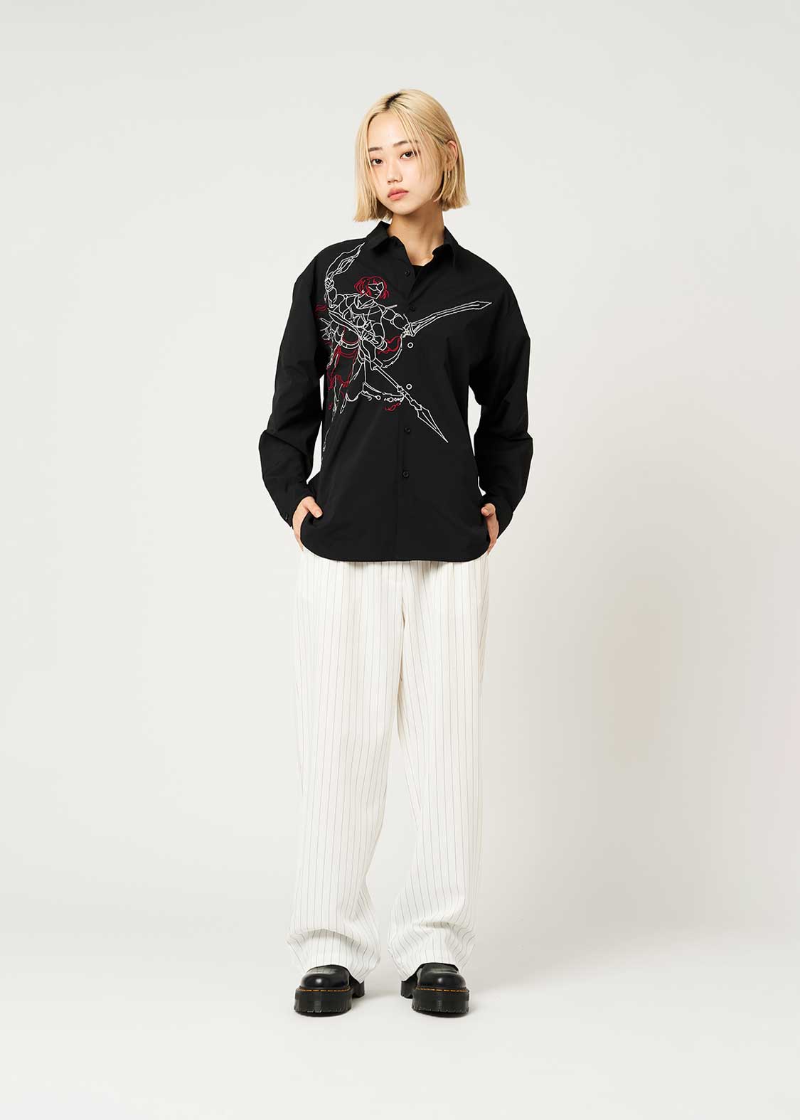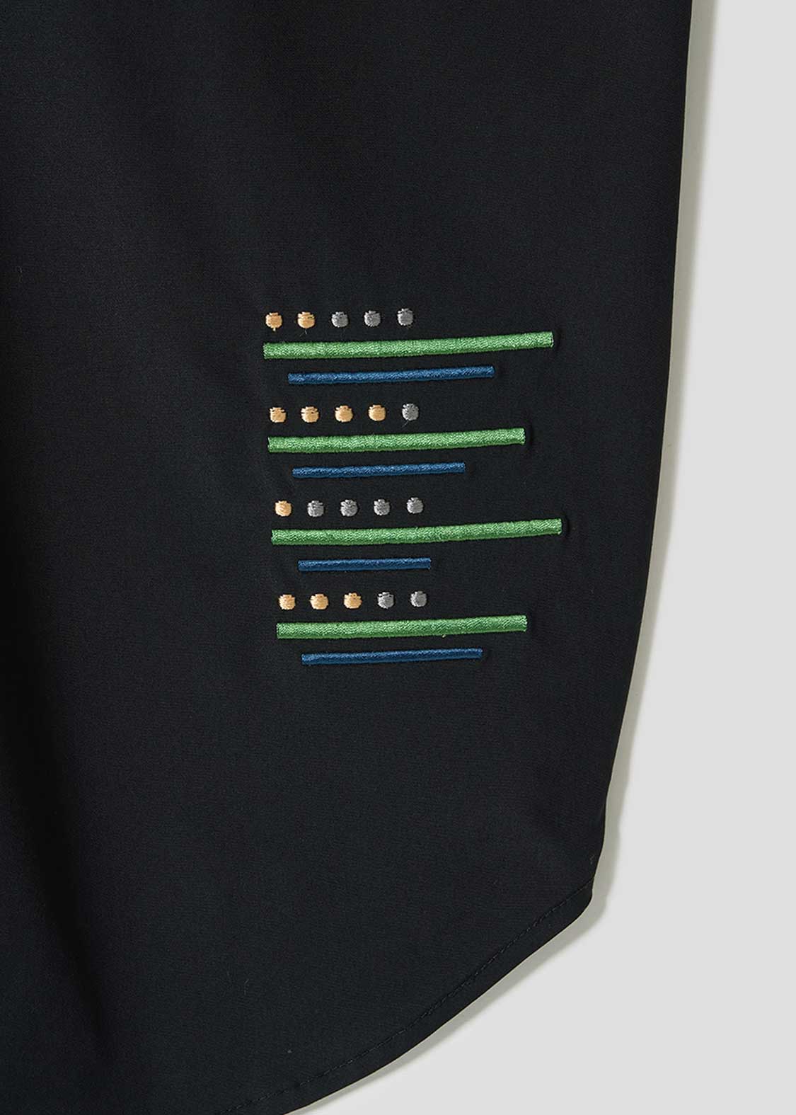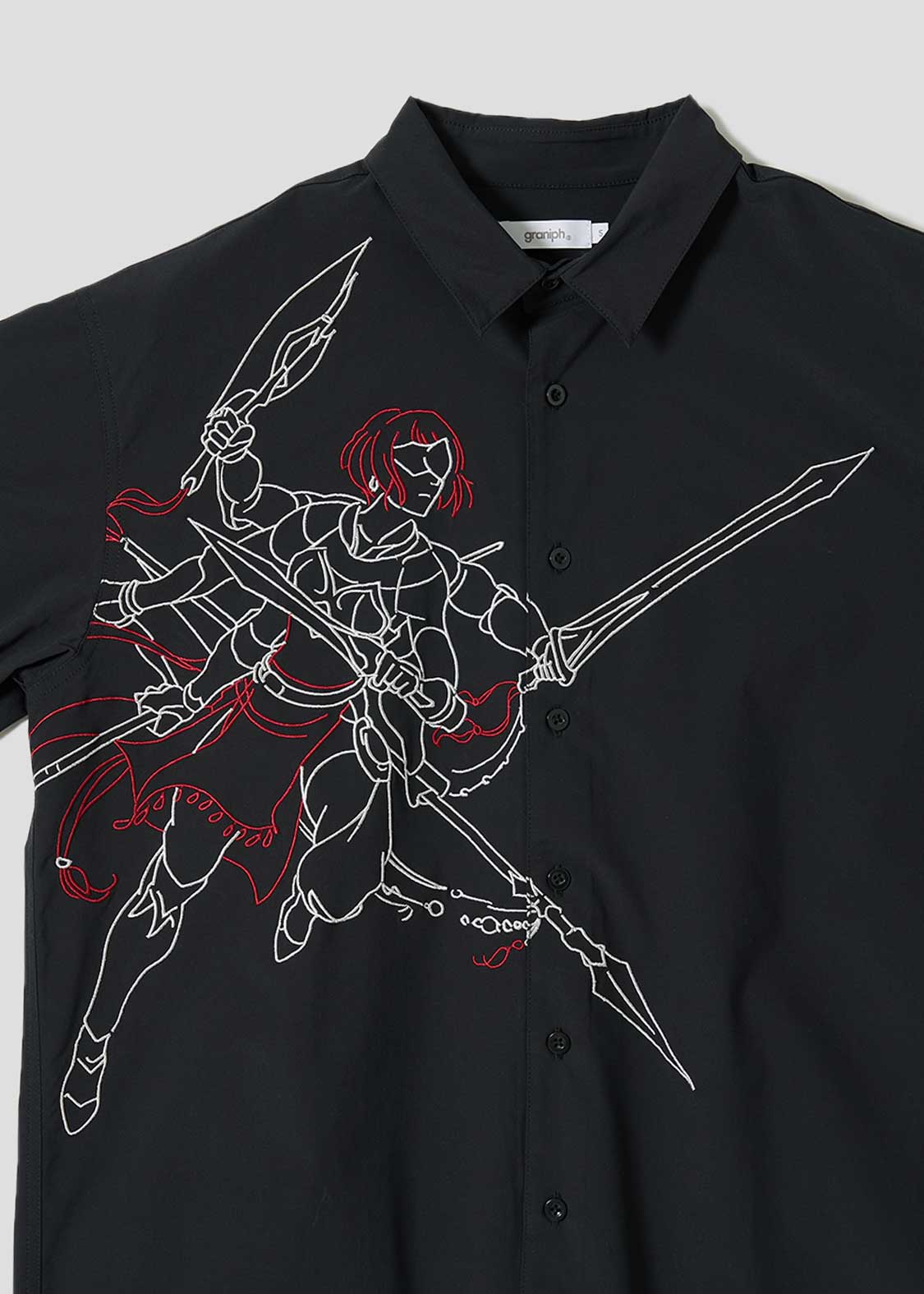 『オクトパストラベラー』より。豪武匠ウィンヒルドとのバトルをイメージしたデザイン。フロントはウィンヒルド、バックはパーティーメンバーのステータスを刺繍しました。これを着ればあなたも様々な武器が使えるようになる、かもしれない1着です。