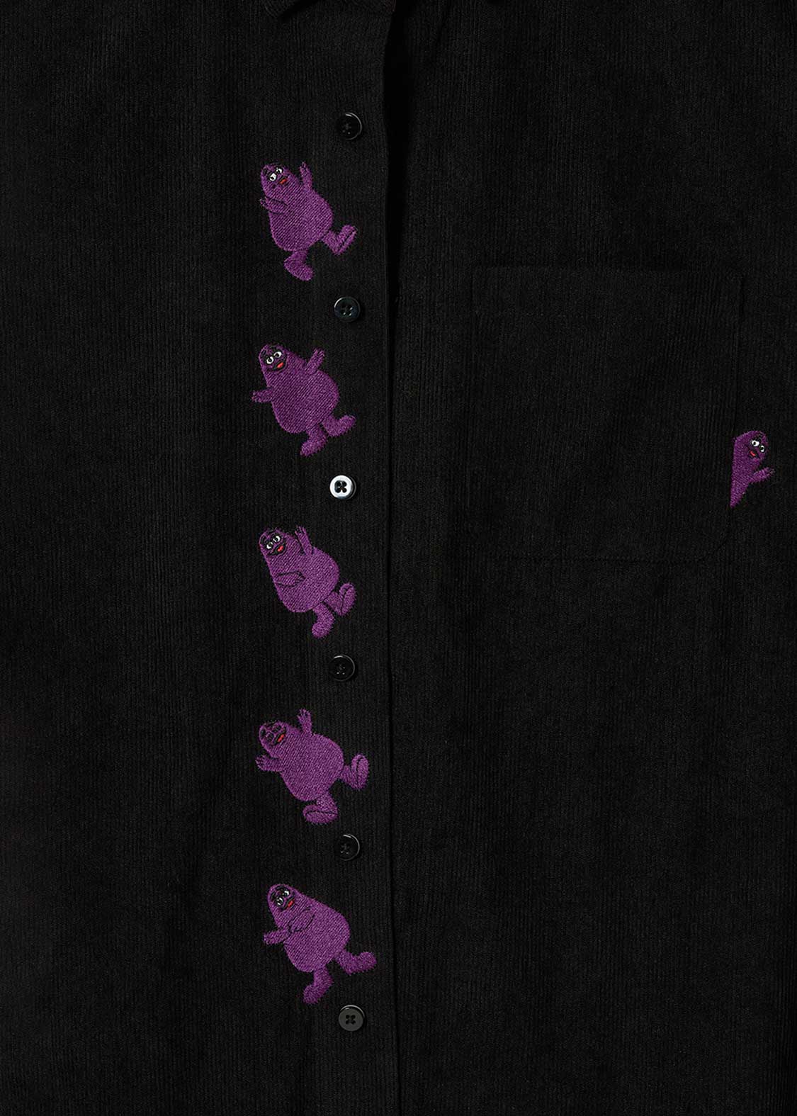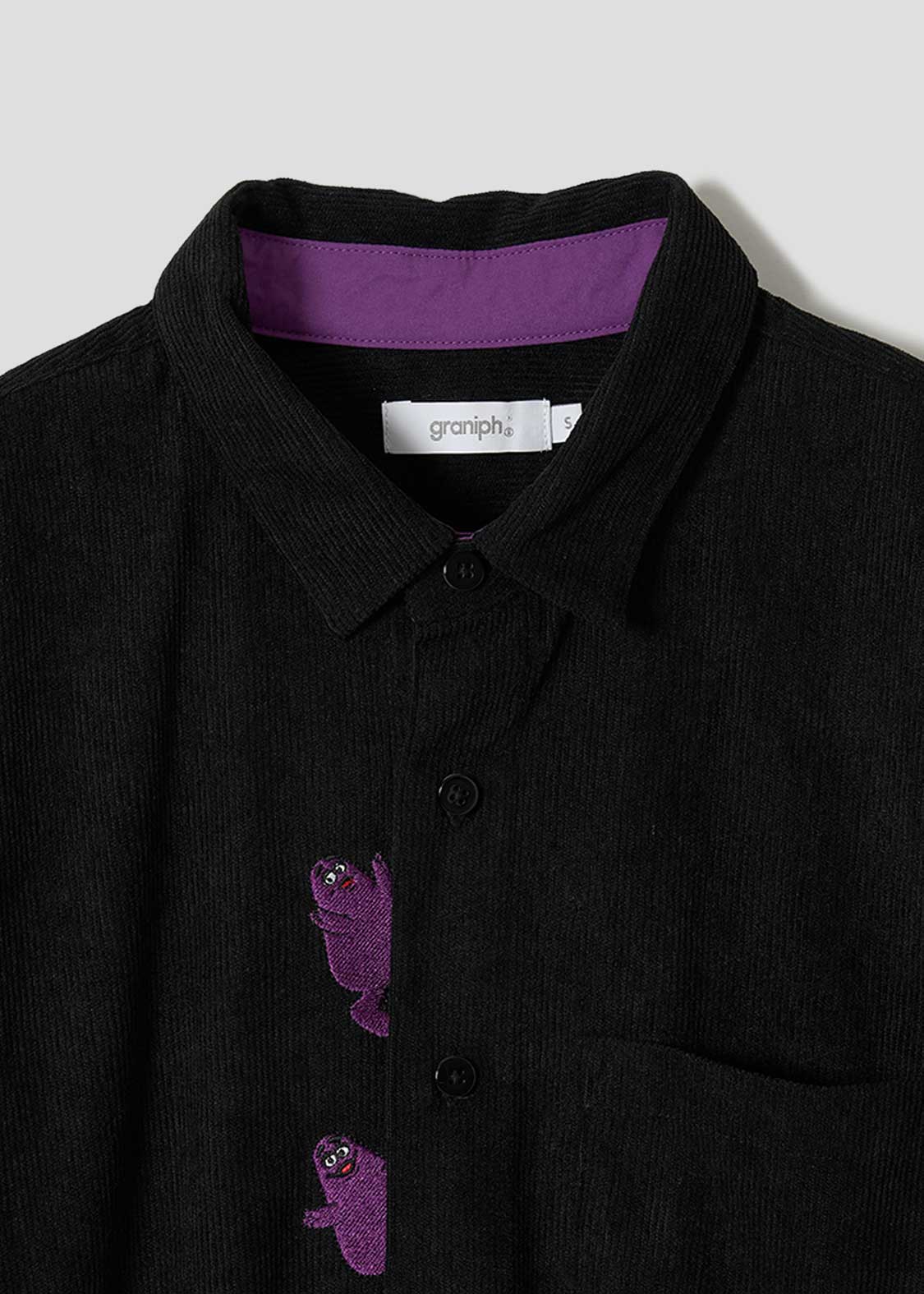 片手を上げて微笑む姿や両手を上げて笑顔で嬉しそうな姿など、様々な姿のグリマスを刺繍した賑やかなデザインです。
